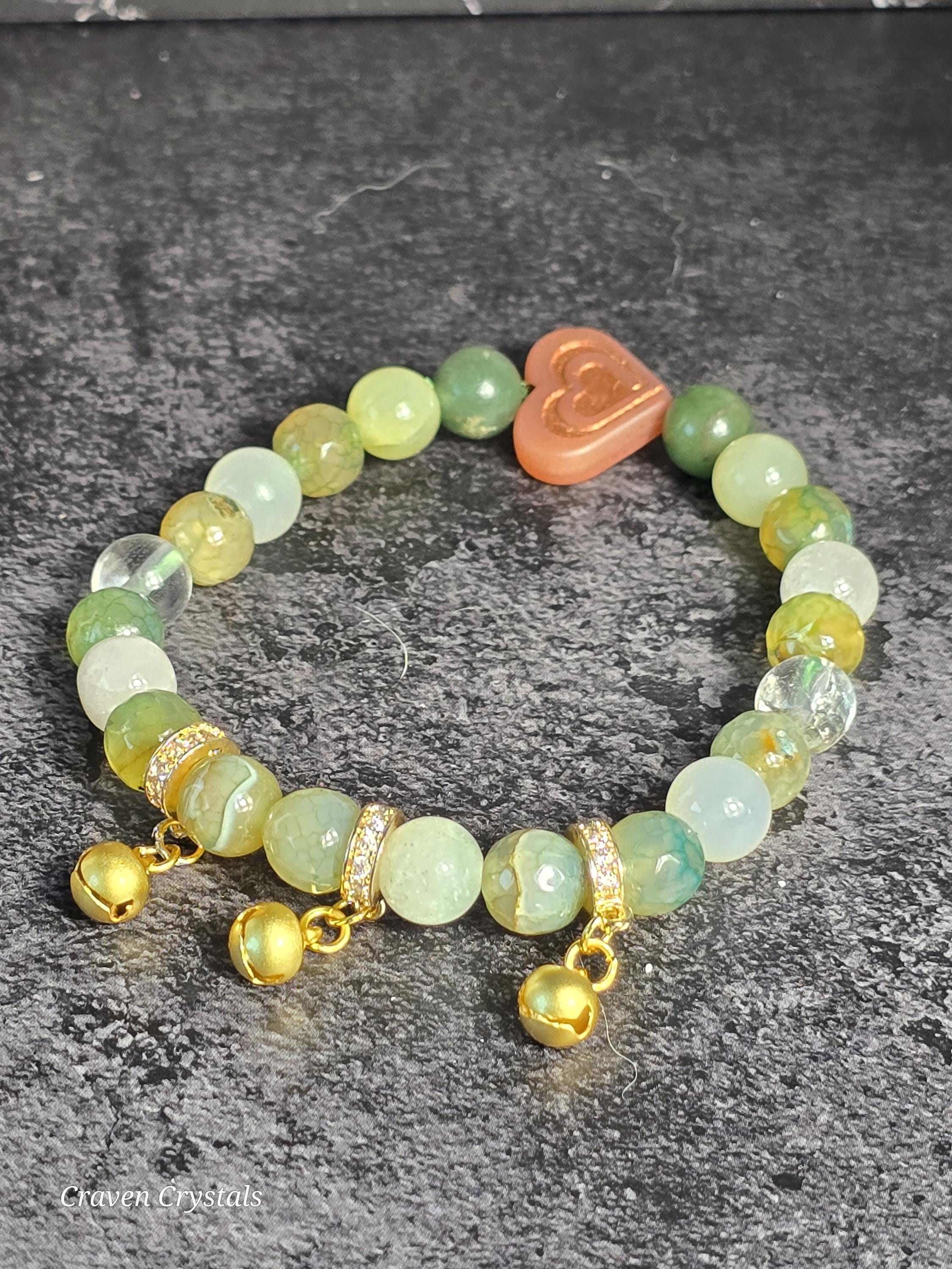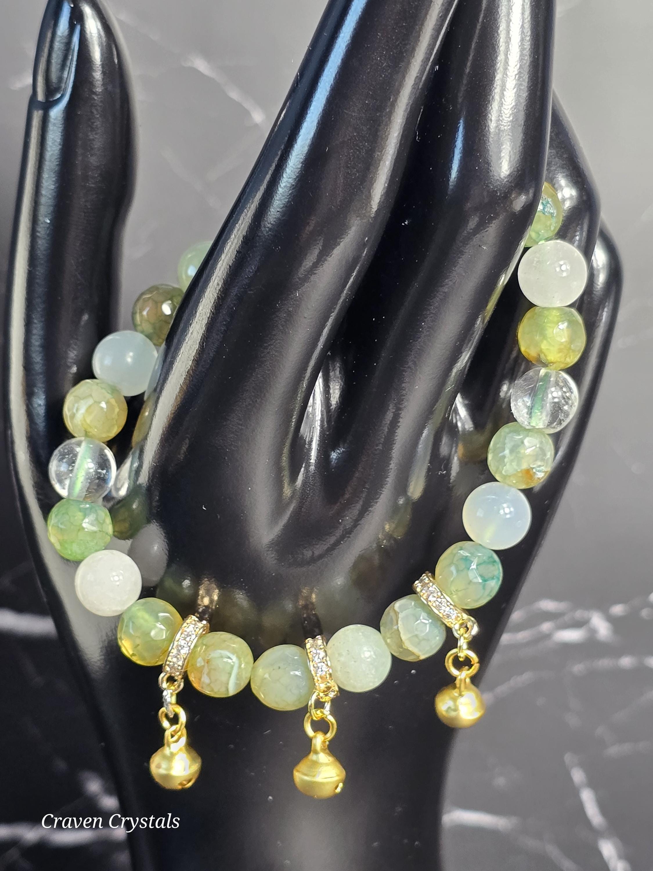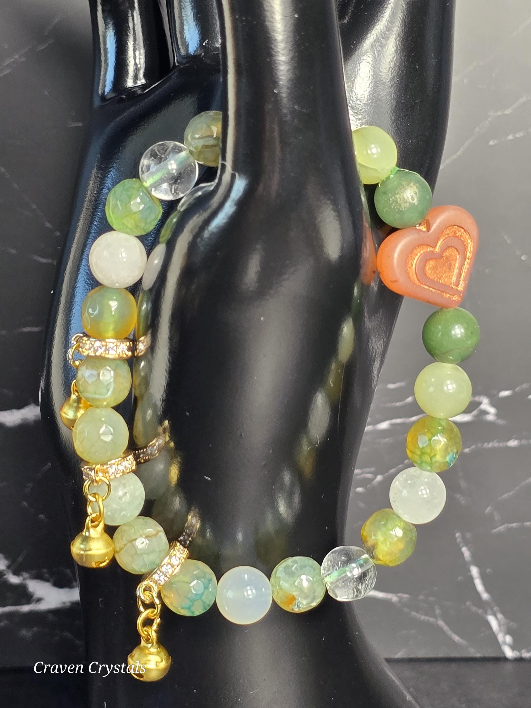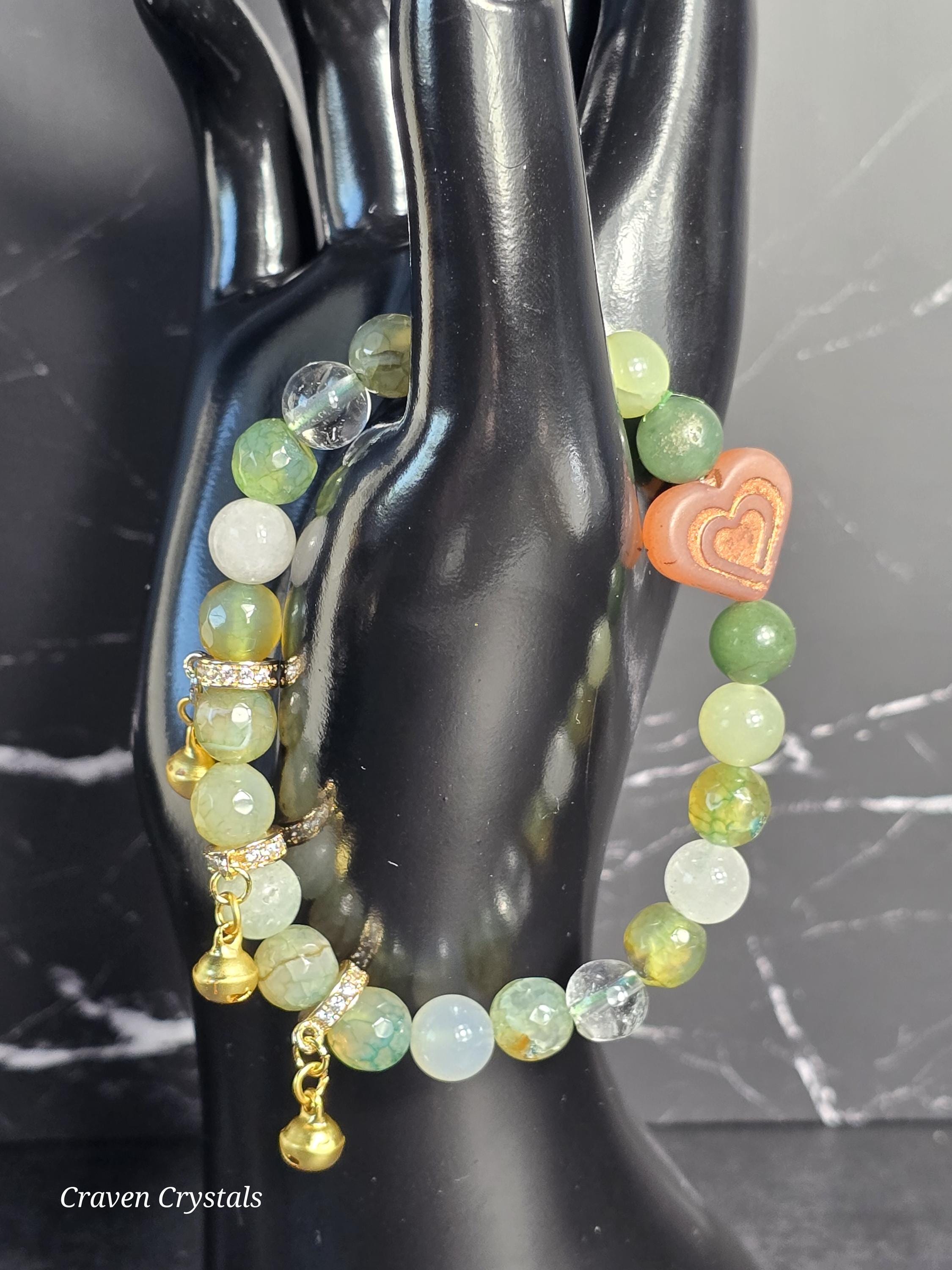 Straight from Whoville with a jingling twist, “Grinchmas Cheer” is a bracelet that celebrates holiday joy, second chances, and hearts growing warmer by the minute. Crafted with rich Green Agate and sparkling Clear Quartz, this piece blends grounding calm with amplified festive energy. At the center, a radiant red Czech glass heart bead symbolizes the moment everything changes — when cheer, kindness, and love finally win. Finished with three dangling jingle bell charms, this bracelet rings with playful holiday spirit, movement, and unmistakable Christmas magic.
