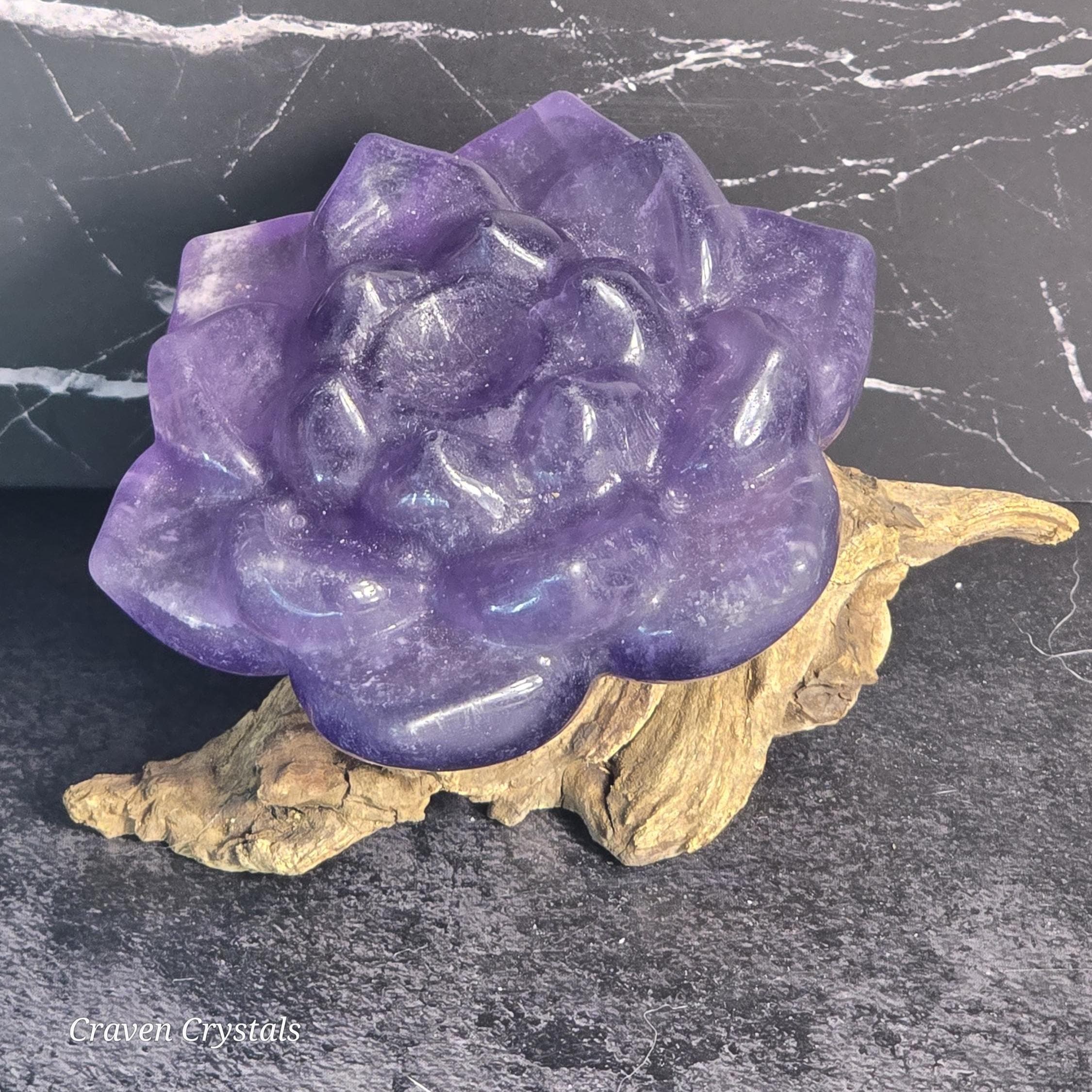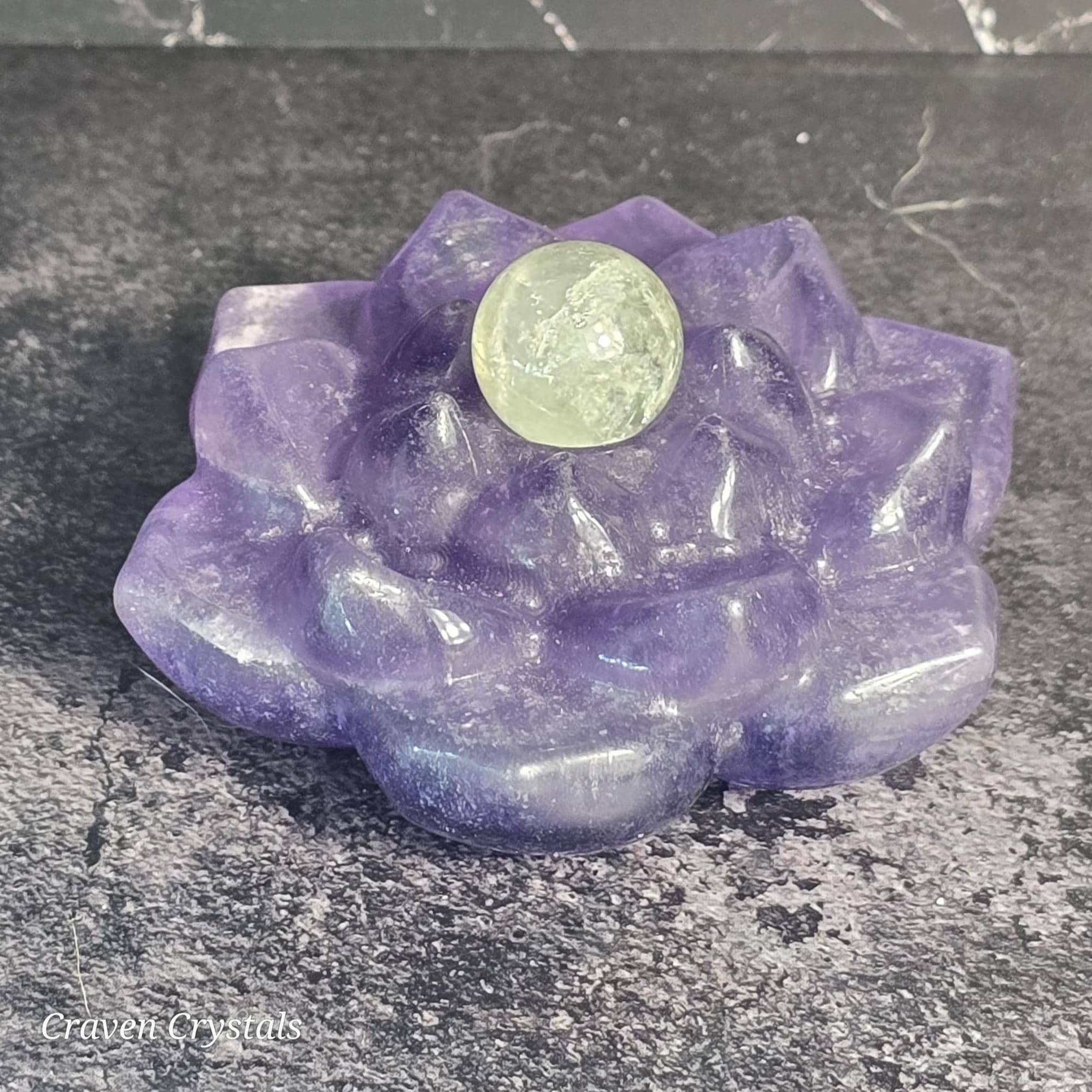 Purple Fluorite Crystal Lotus Carving - center can hold a small sphere