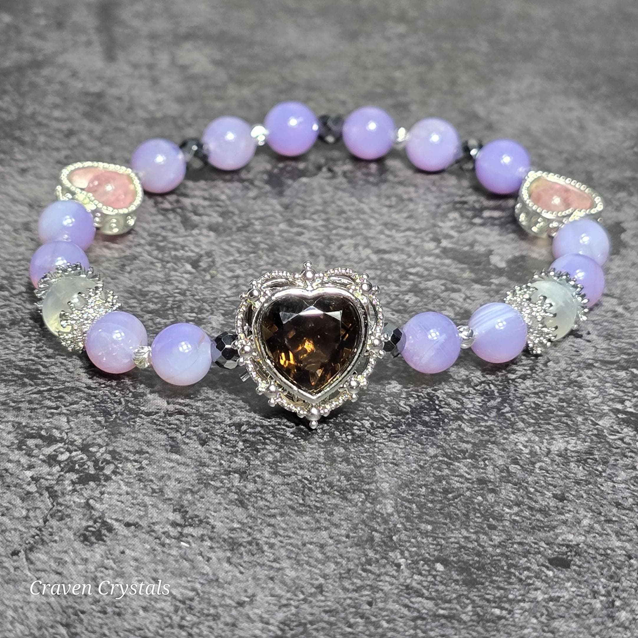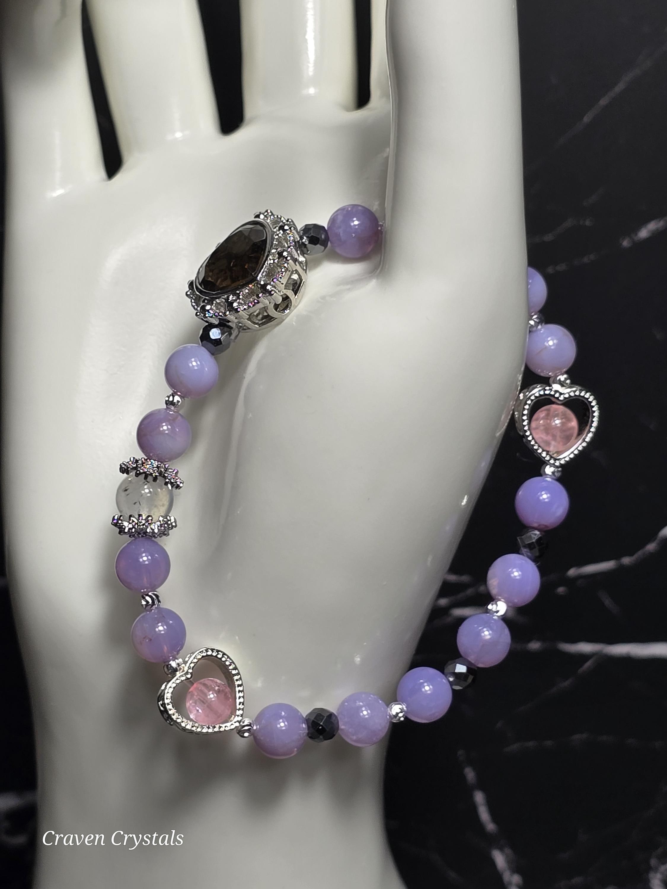 Delicate beauty meets grounding strength in this thoughtfully designed bracelet, where gentle hues and meaningful details come together in perfect harmony. Scorolite (lavender moon quartz) takes center stage as the primary bead, glowing with soft lilac tones that evoke calm, intuition, and emotional clarity. Sleek hematite spacers add contrast and balance, grounding the design with subtle strength and a modern edge. At the heart of the bracelet rests a luminous Smoky Quartz heart-shaped centerpiece, symbolizing emotional grounding, protection, and deep-rooted love. Flanking this focal point are two elegant framed heart accents, each holding a sparkling pink topaz centerpiece — a stone associated with affection, joy, and gentle emotional healing. Completing the design are moonstone beads adorned with ornate caps, adding a final touch of lunar magic and feminine grace.