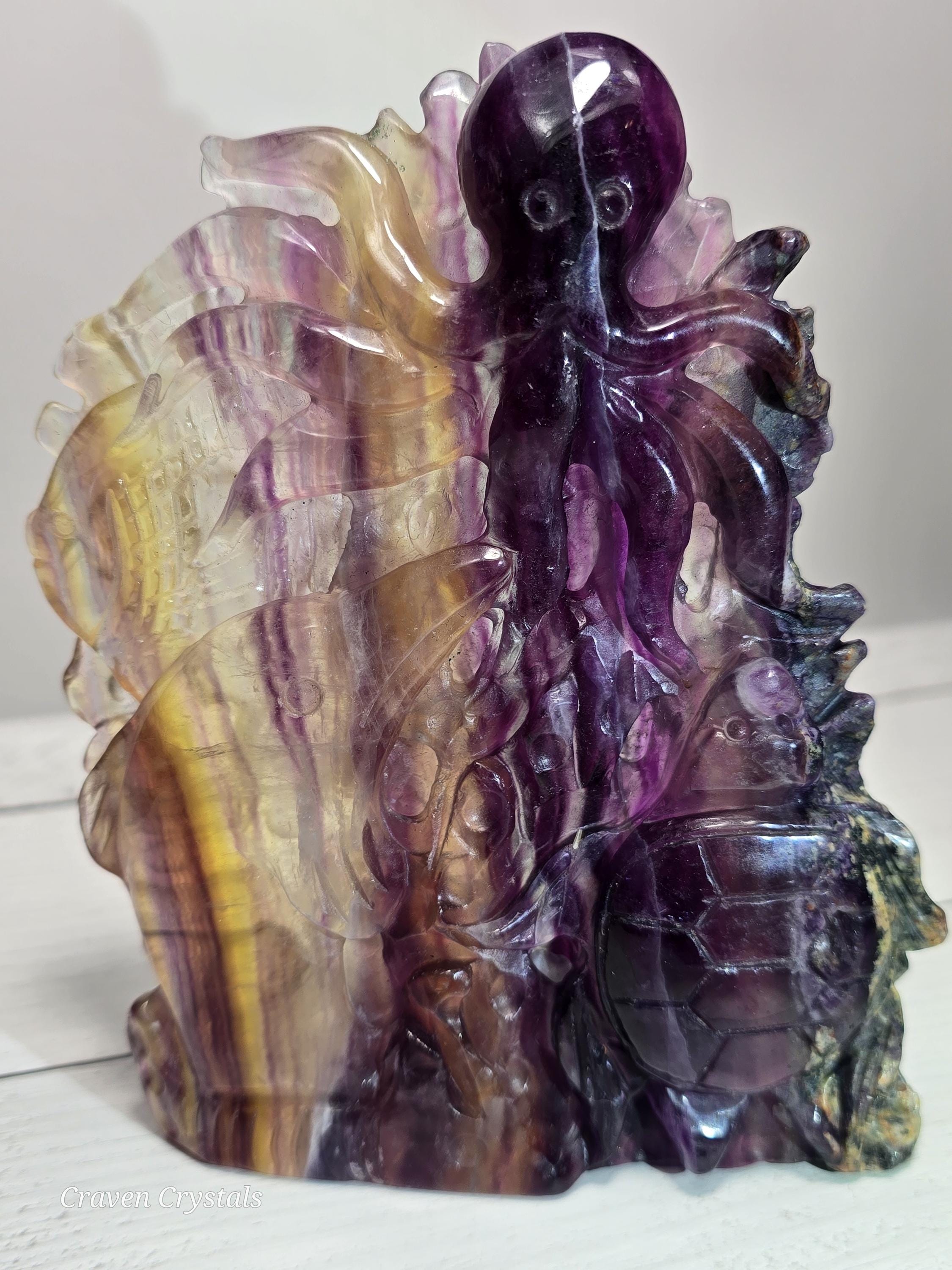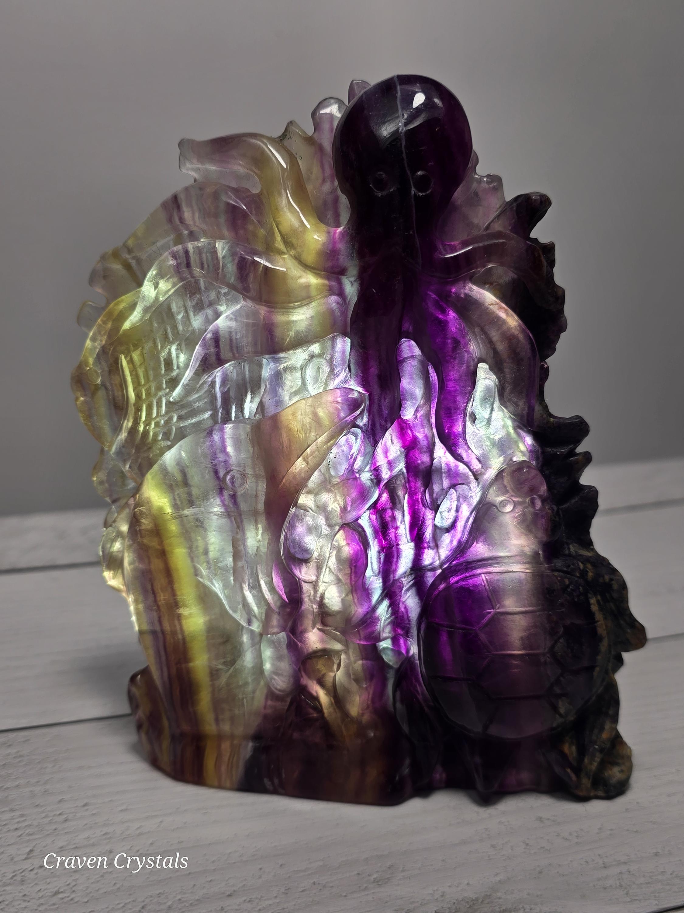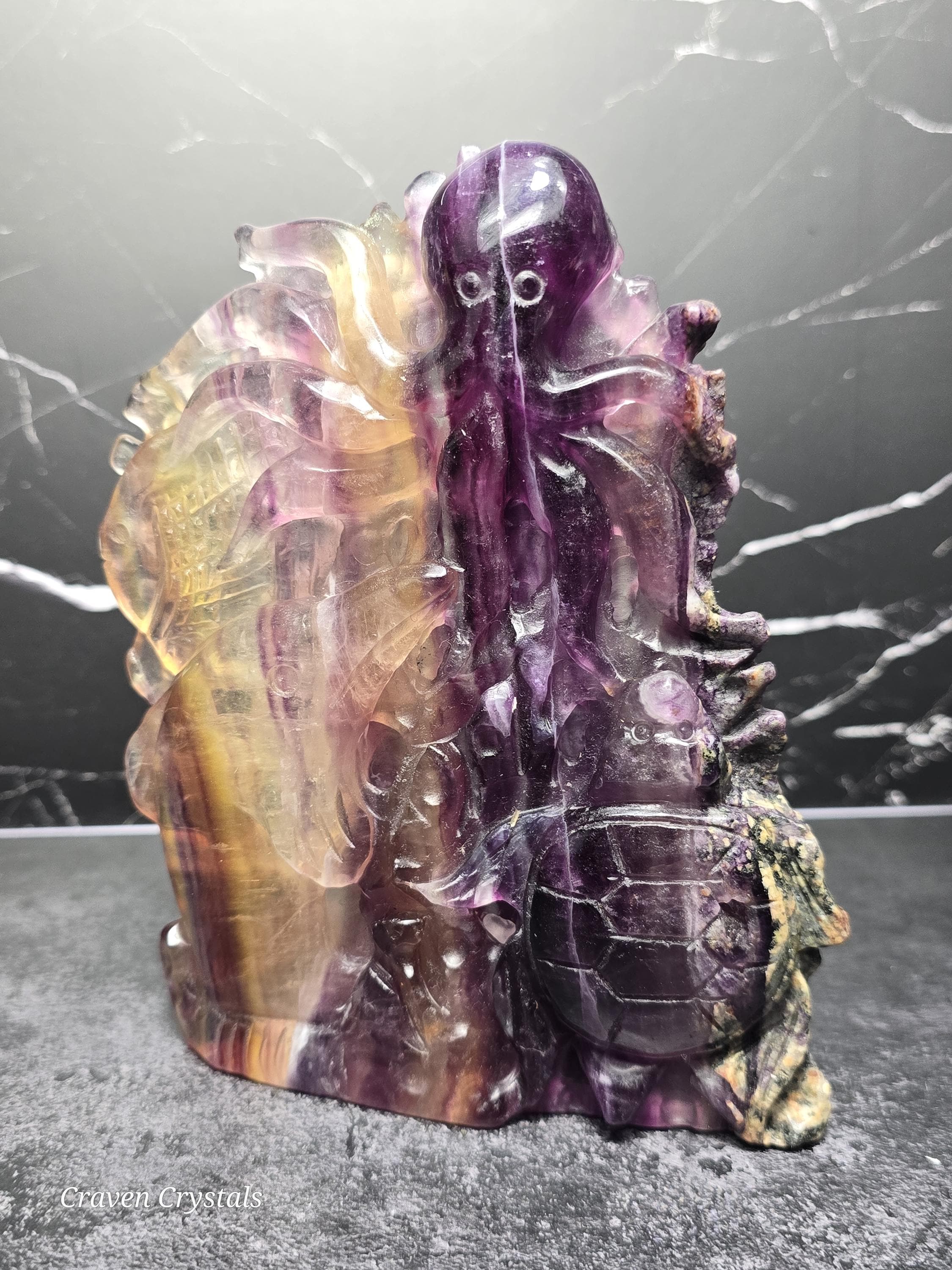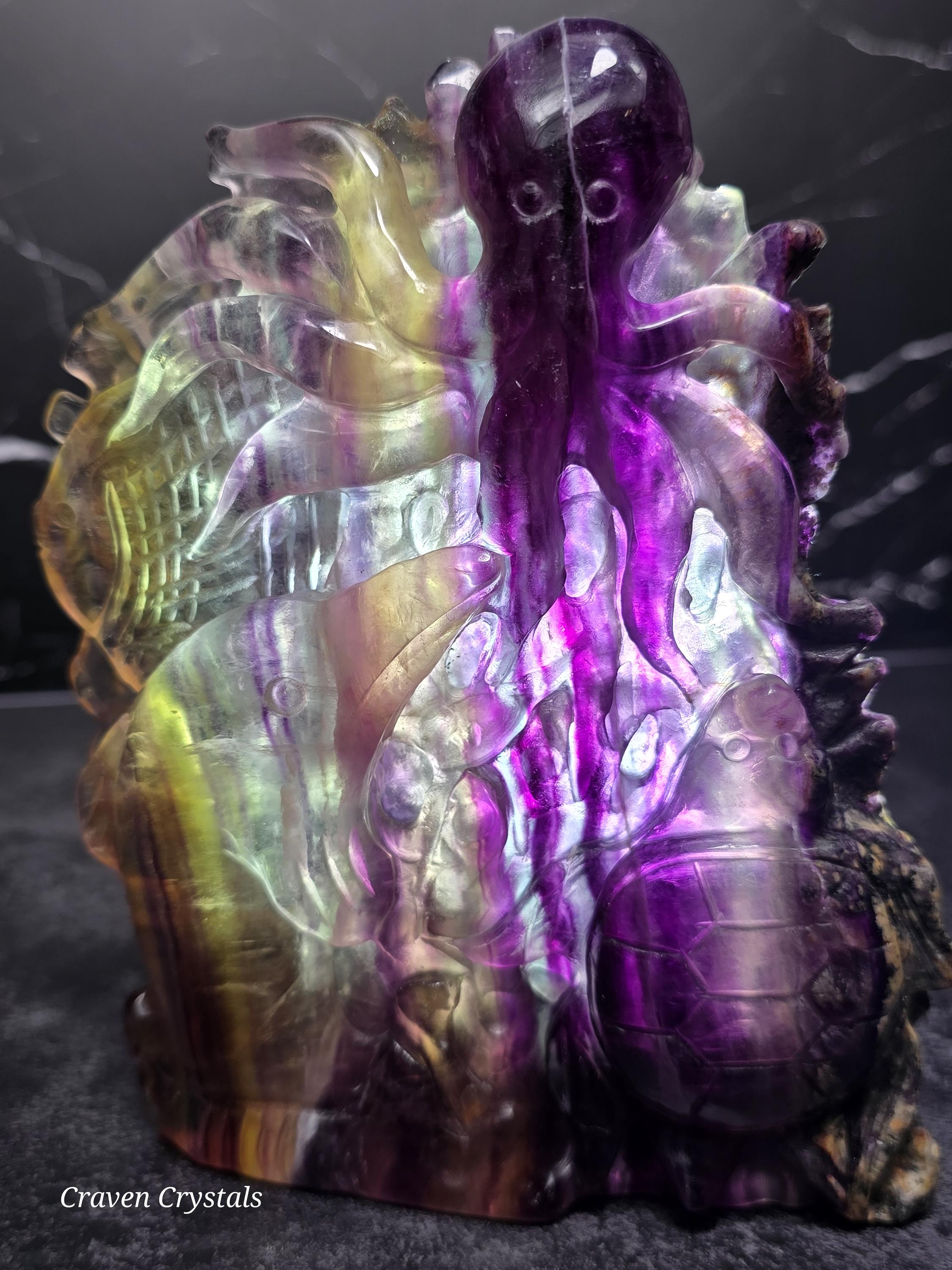 Amazing Rainbow Fluorite Sea Life Crystal Carving with an ombre of shades in pink, purple, orange and yellow. The carving includes an octopus, dolphin, turtle, fish and coral in a 365 degree hand carved piece. The piece shows beautifully under UV light as well. There are root inclusions on the right side.