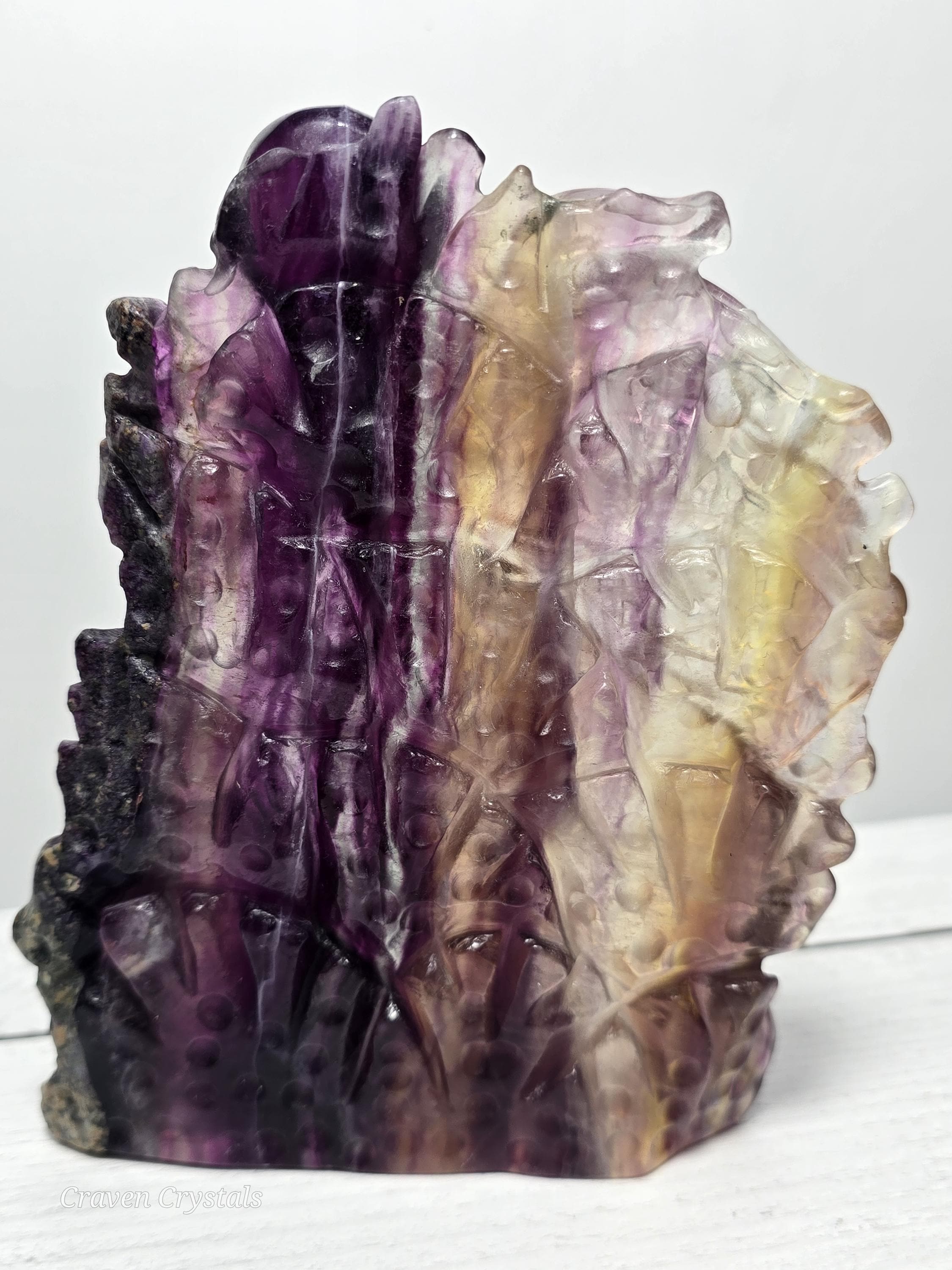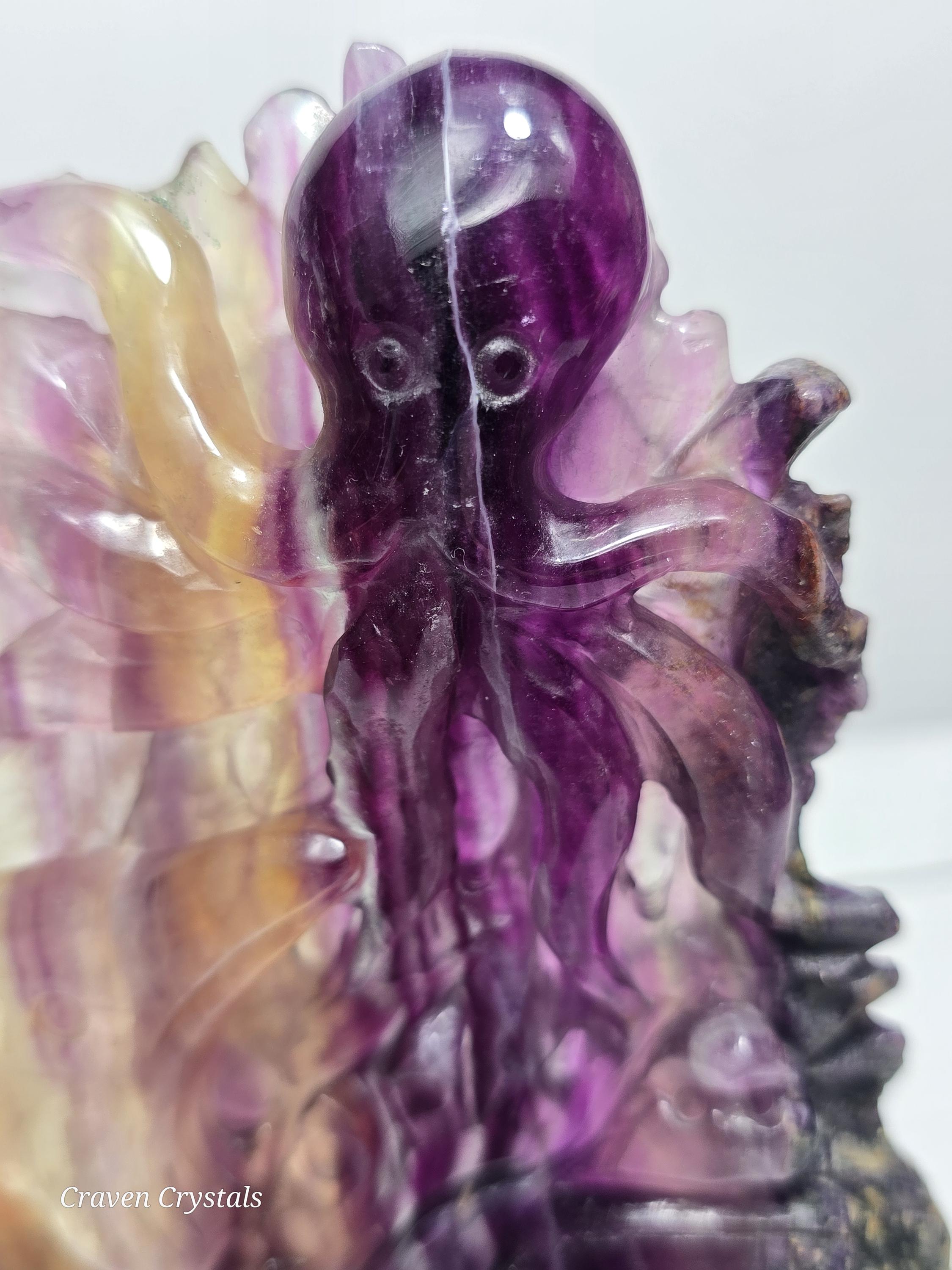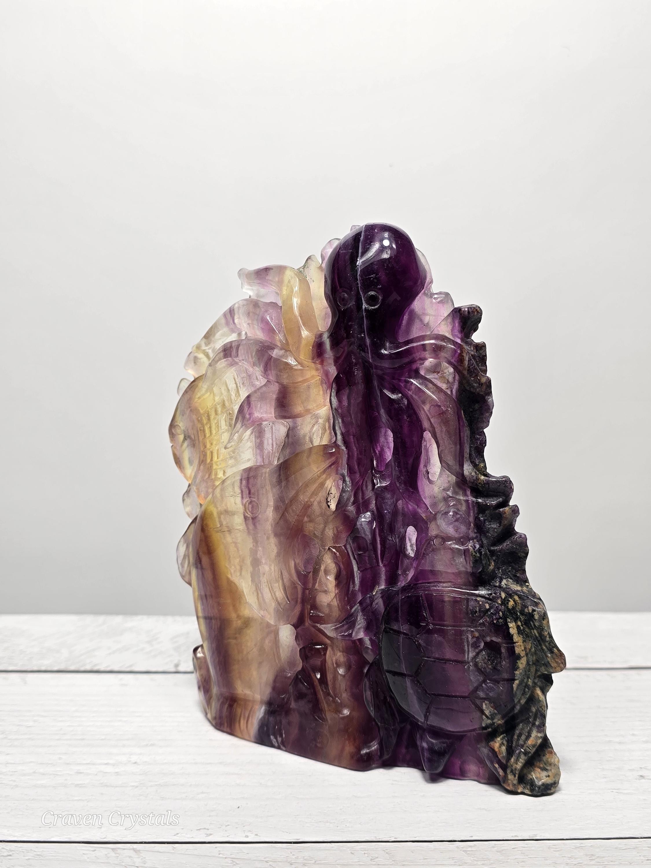 Amazing Rainbow Fluorite Sea Life Crystal Carving with an ombre of shades in pink, purple, orange and yellow. The carving includes an octopus, dolphin, turtle, fish and coral in a 365 degree hand carved piece. The piece shows beautifully under UV light as well. There are root inclusions on the right side.