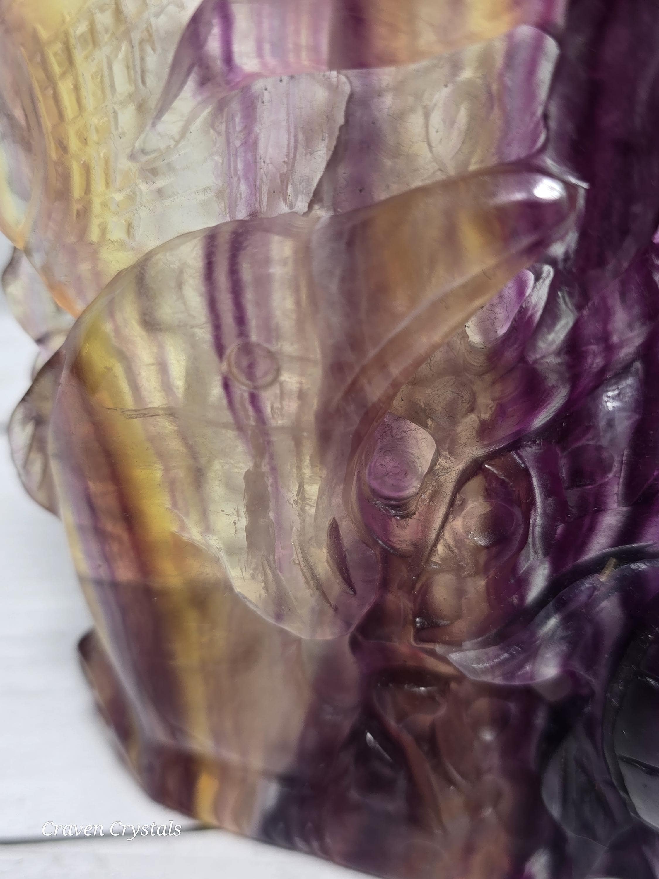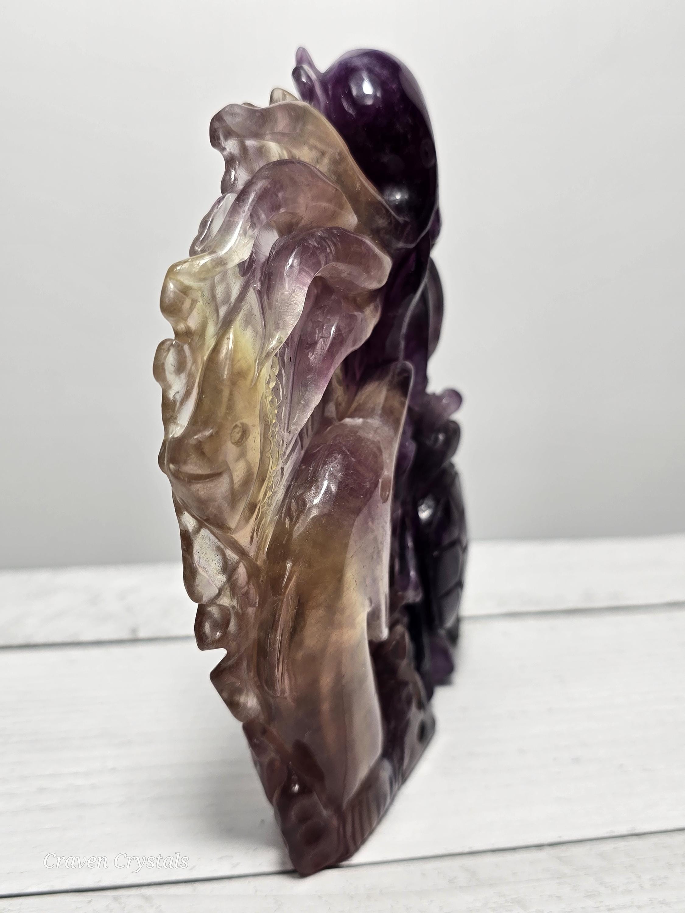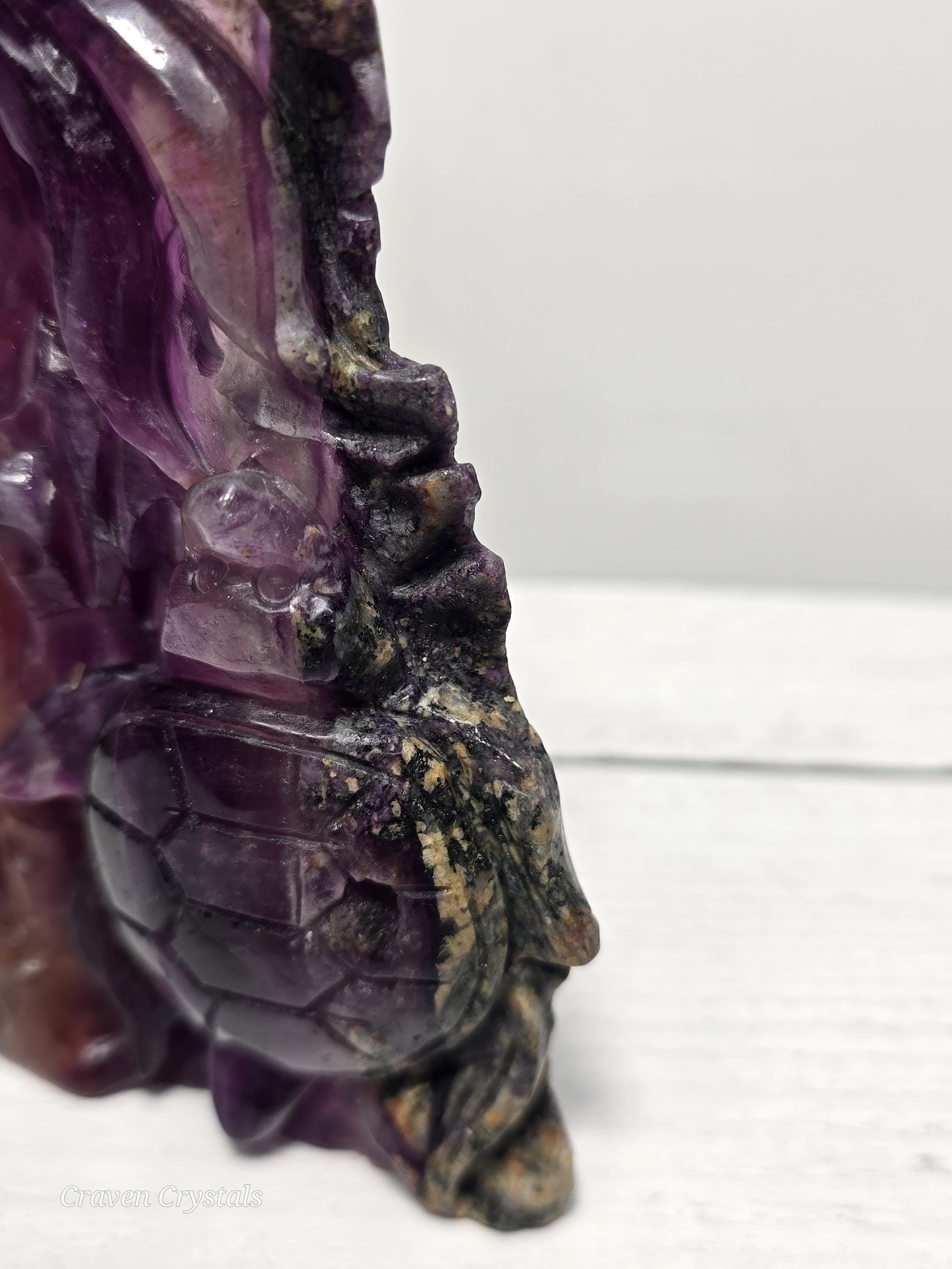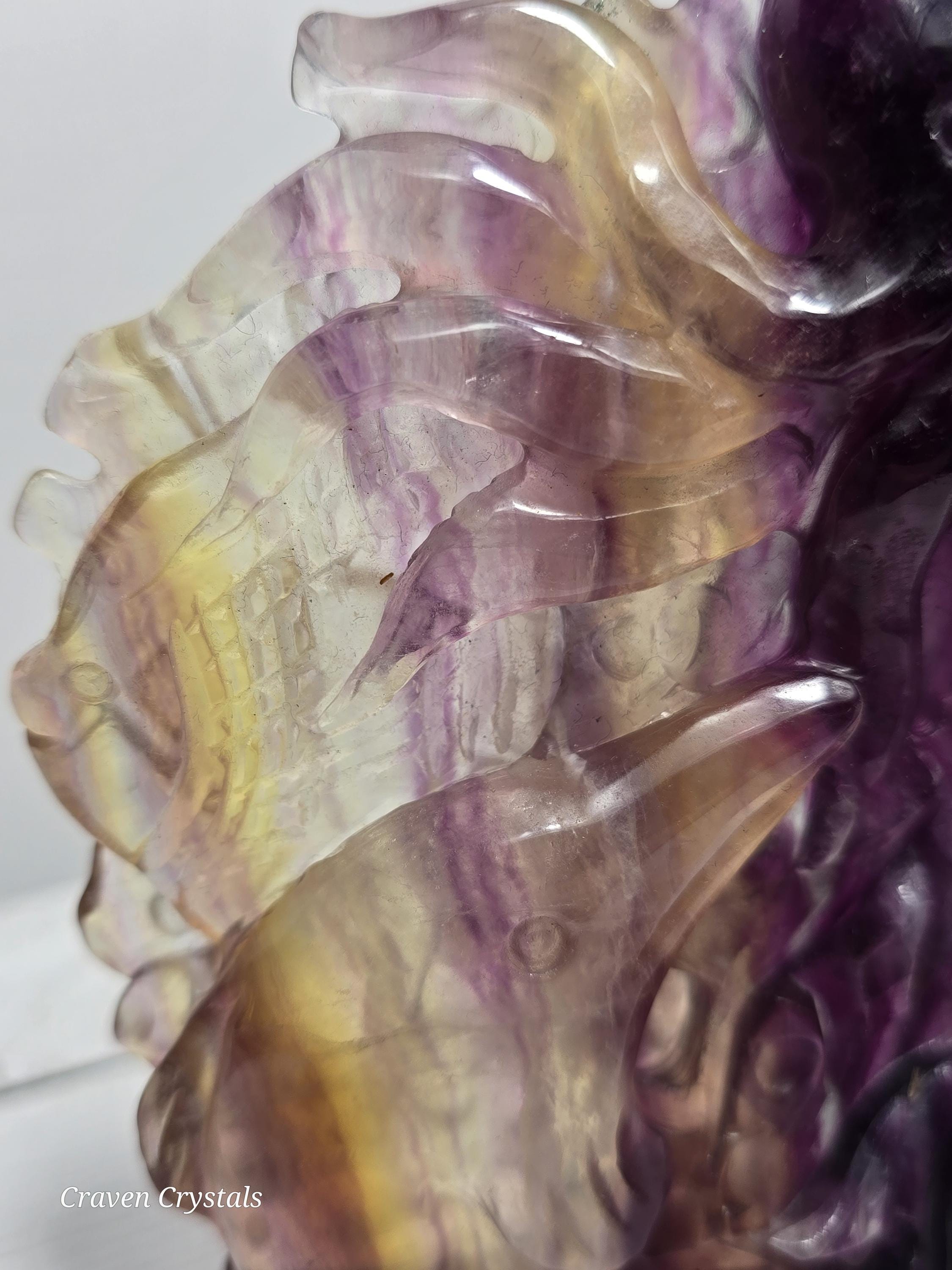 Amazing Rainbow Fluorite Sea Life Crystal Carving with an ombre of shades in pink, purple, orange and yellow. The carving includes an octopus, dolphin, turtle, fish and coral in a 365 degree hand carved piece. The piece shows beautifully under UV light as well. There are root inclusions on the right side.