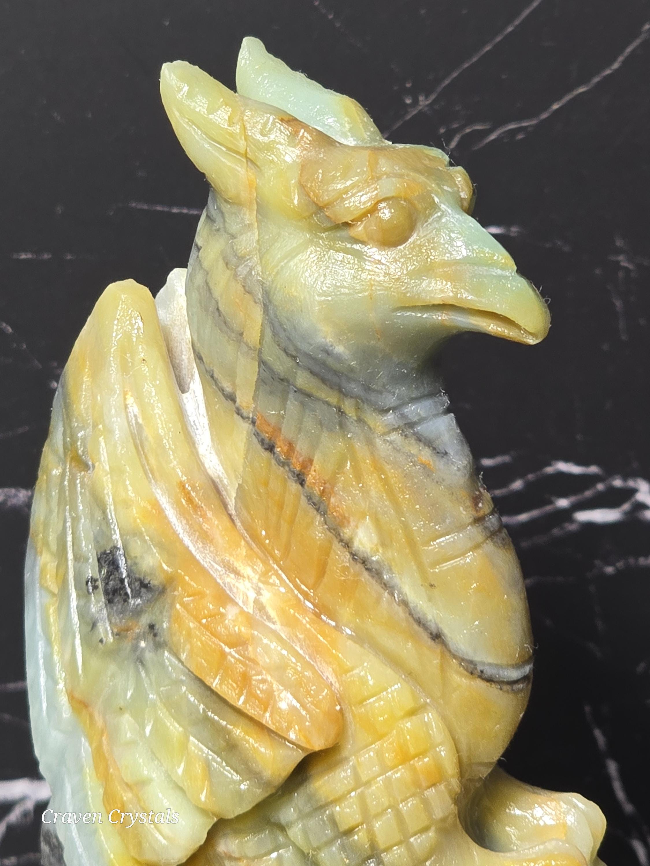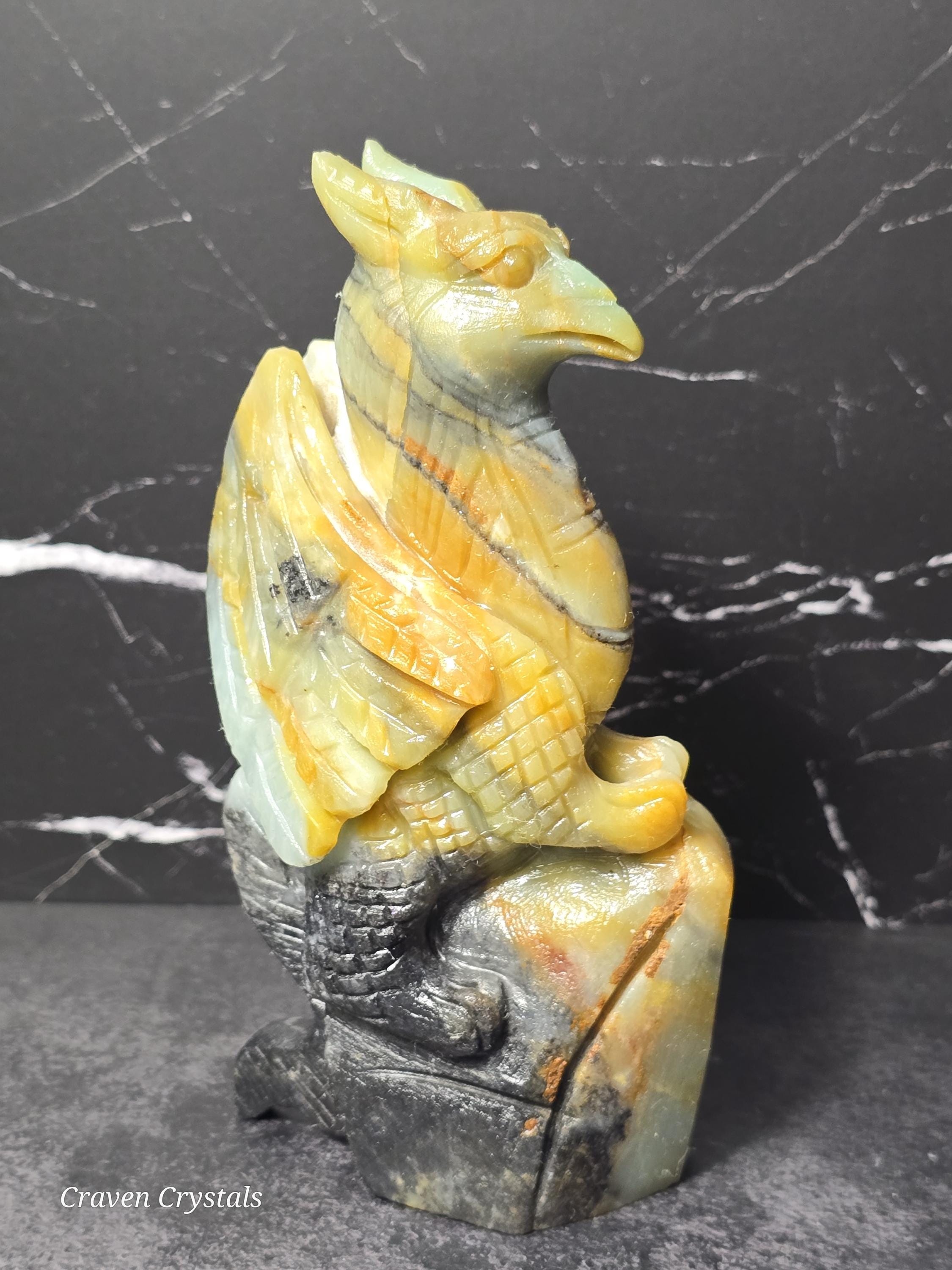 A Gryphon (or Griffin) is a legendary guardian combining the lion’s strength and courage with the eagle’s vision and wisdom, symbolizing mastery of both the physical and spiritual realms. In crystal form, griffin carvings are believed to amplify protection, wisdom, and focused intention, blending ancient symbolism with the natural energy of the stone.