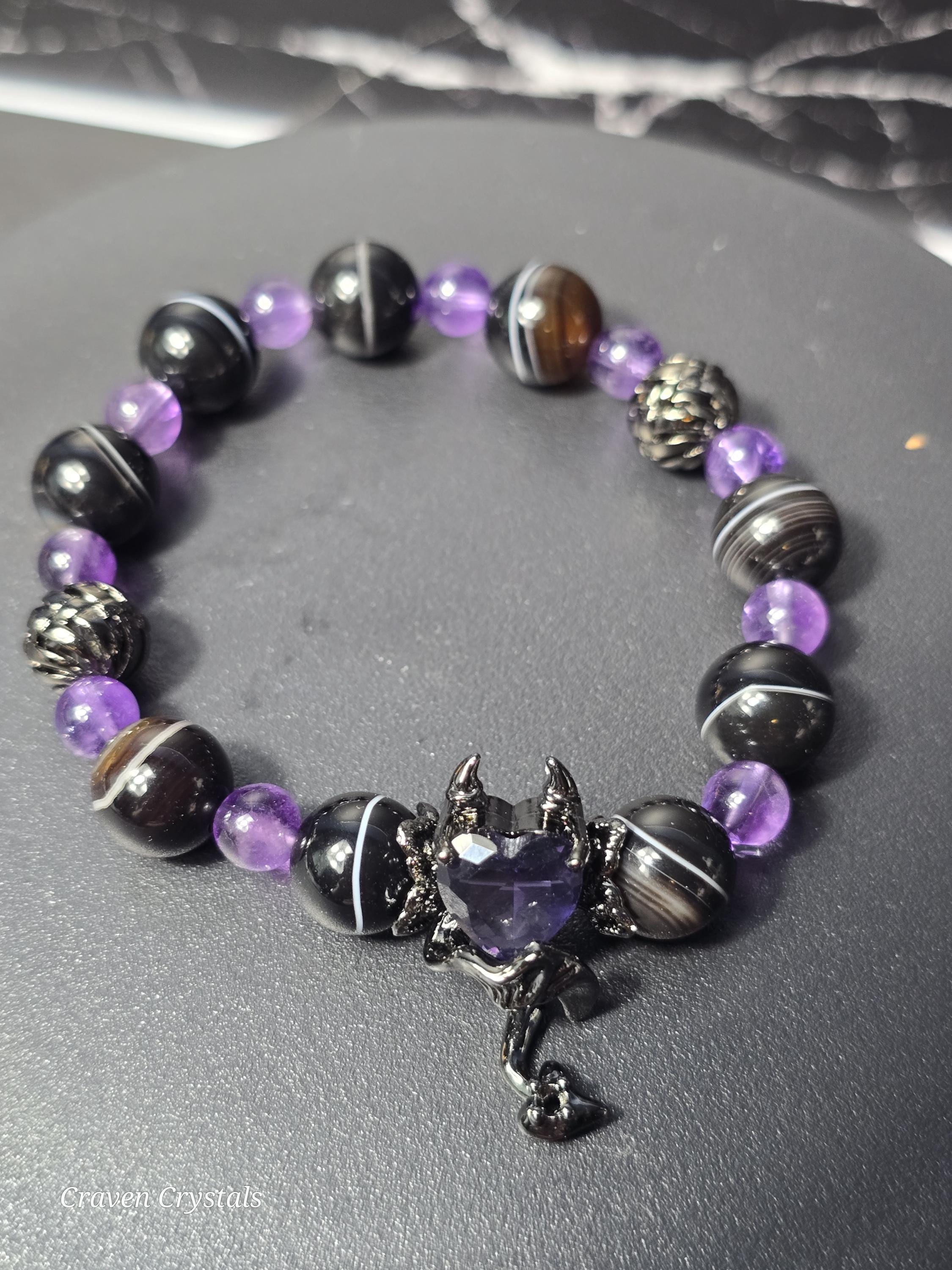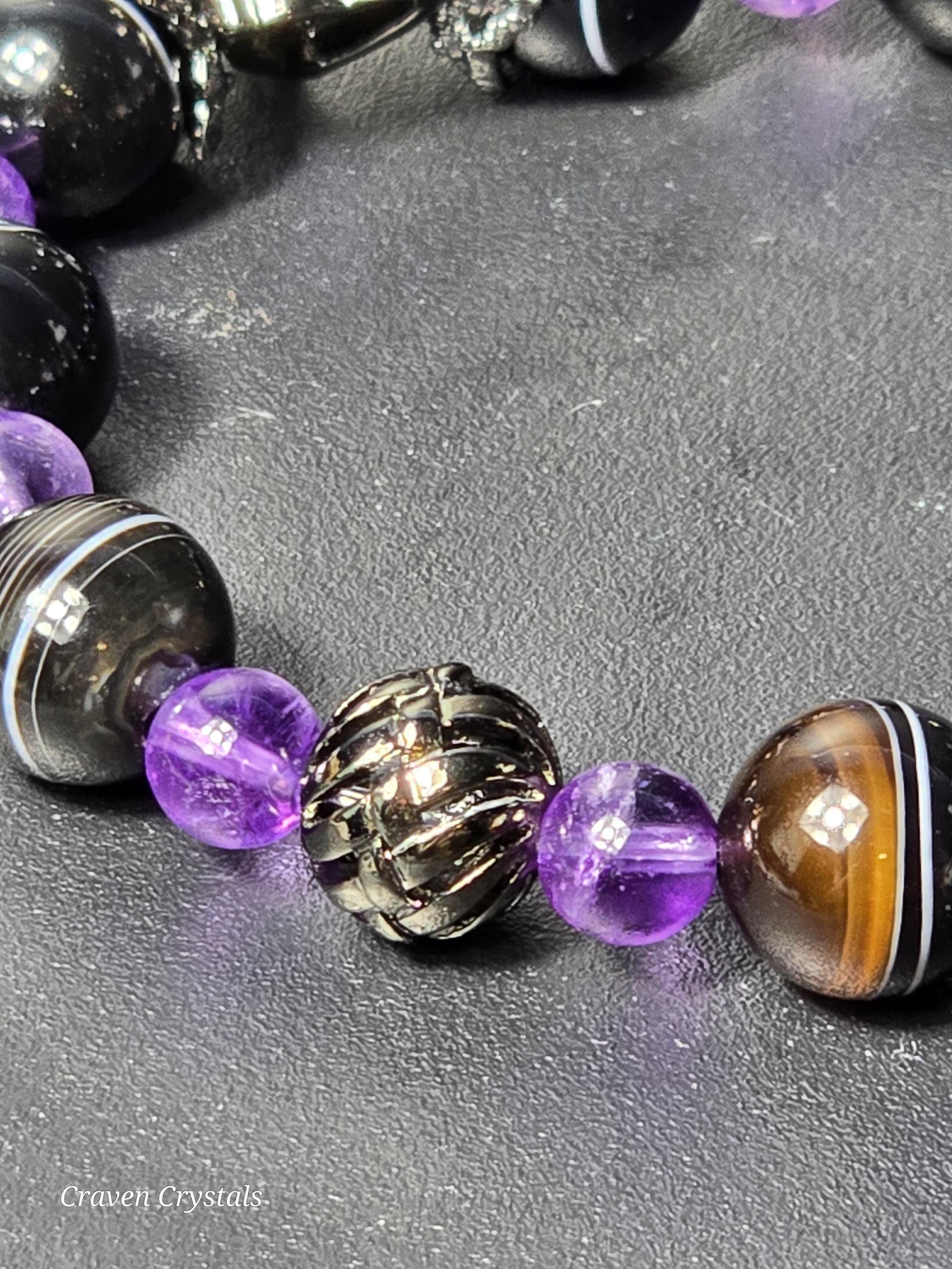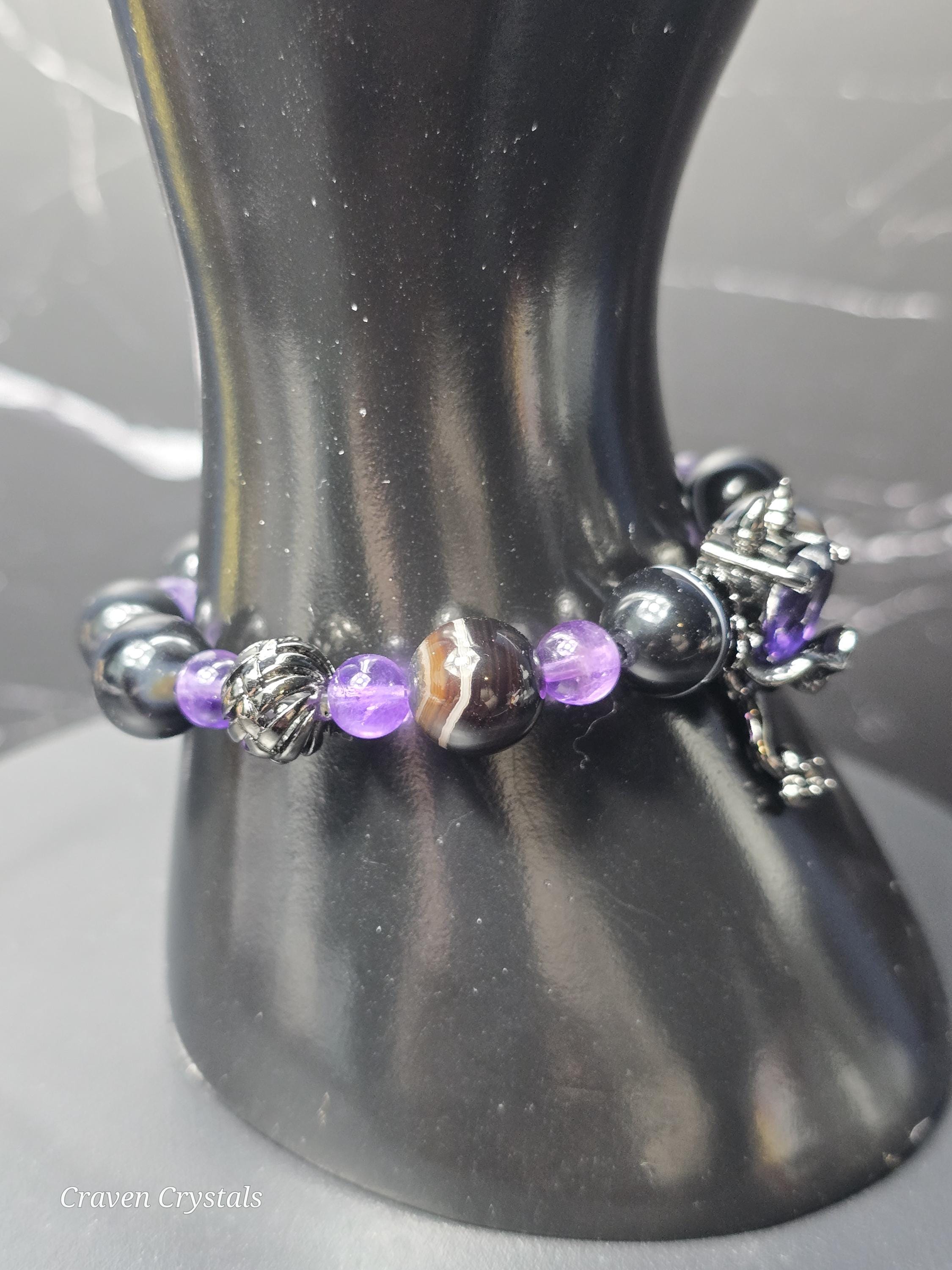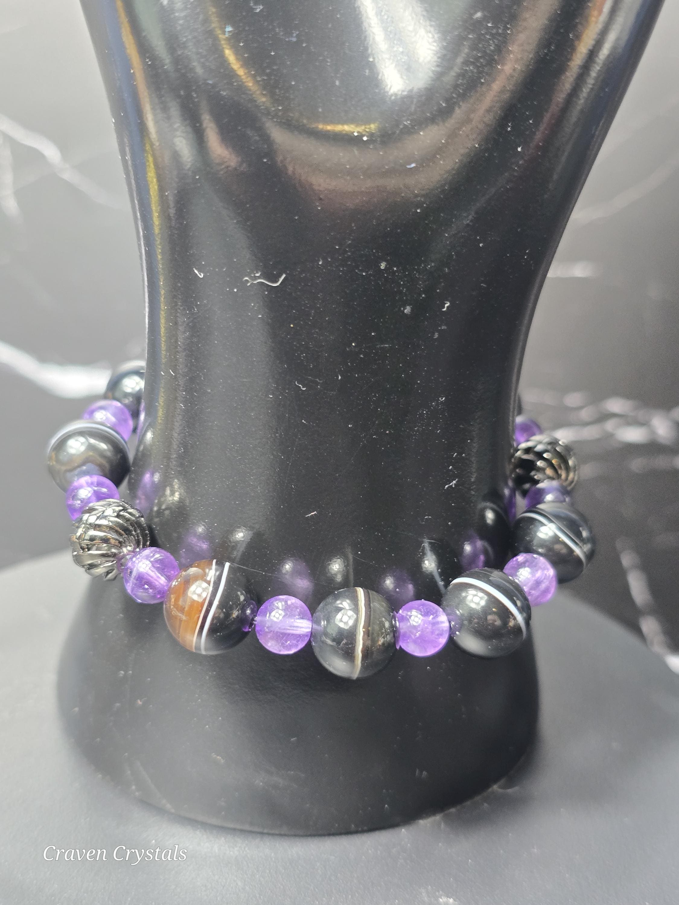 Mysterious, magnetic, and unapologetically bold, “Midnight Desire” is a bracelet that dances between shadow and allure. Smooth black agate beads create a grounding, midnight-dark foundation, while rich amethyst adds flashes of deep violet—long associated with intuition, passion, and inner power. Sleek black metal spacers tie the design together with a modern, moody edge.