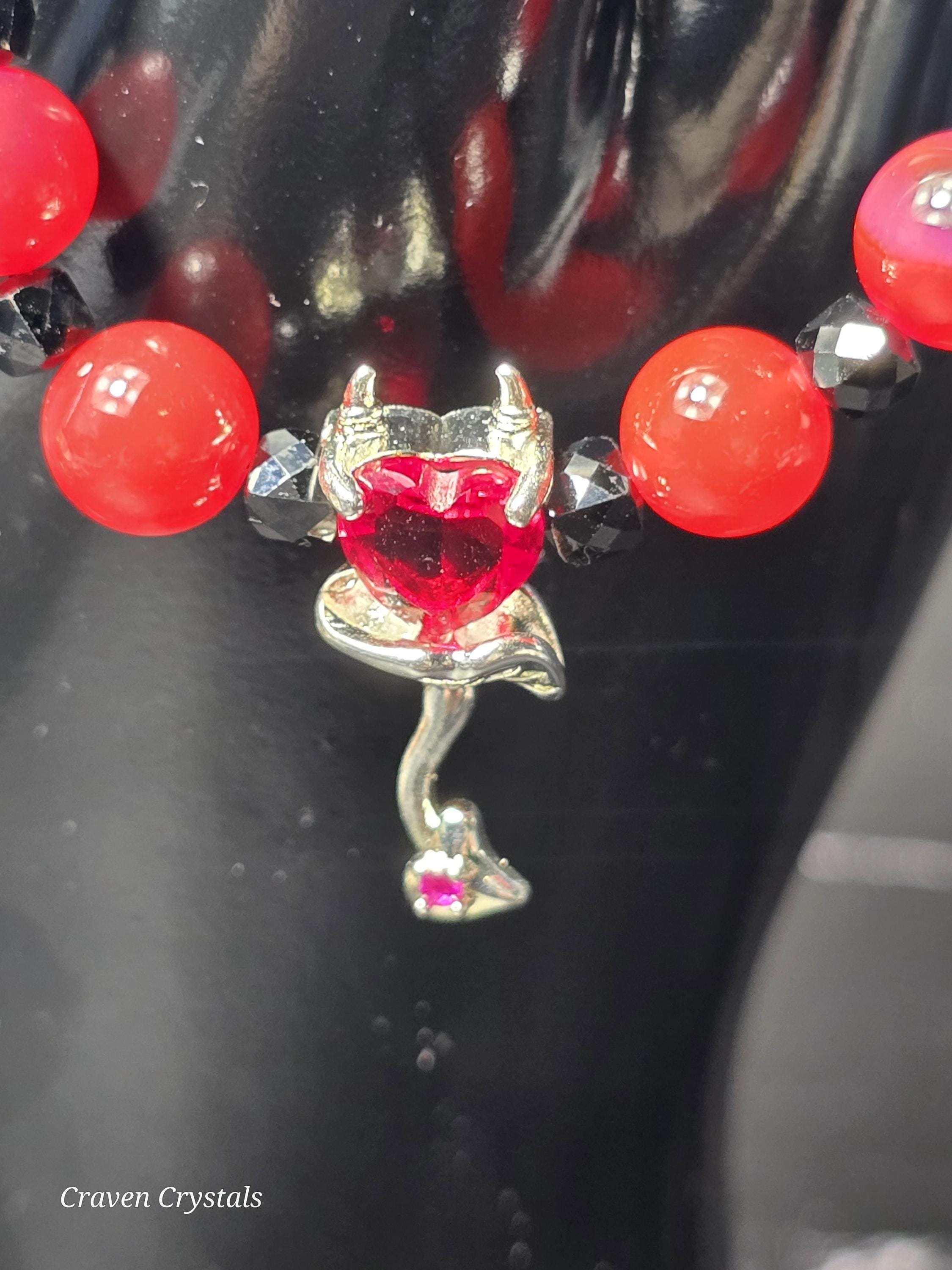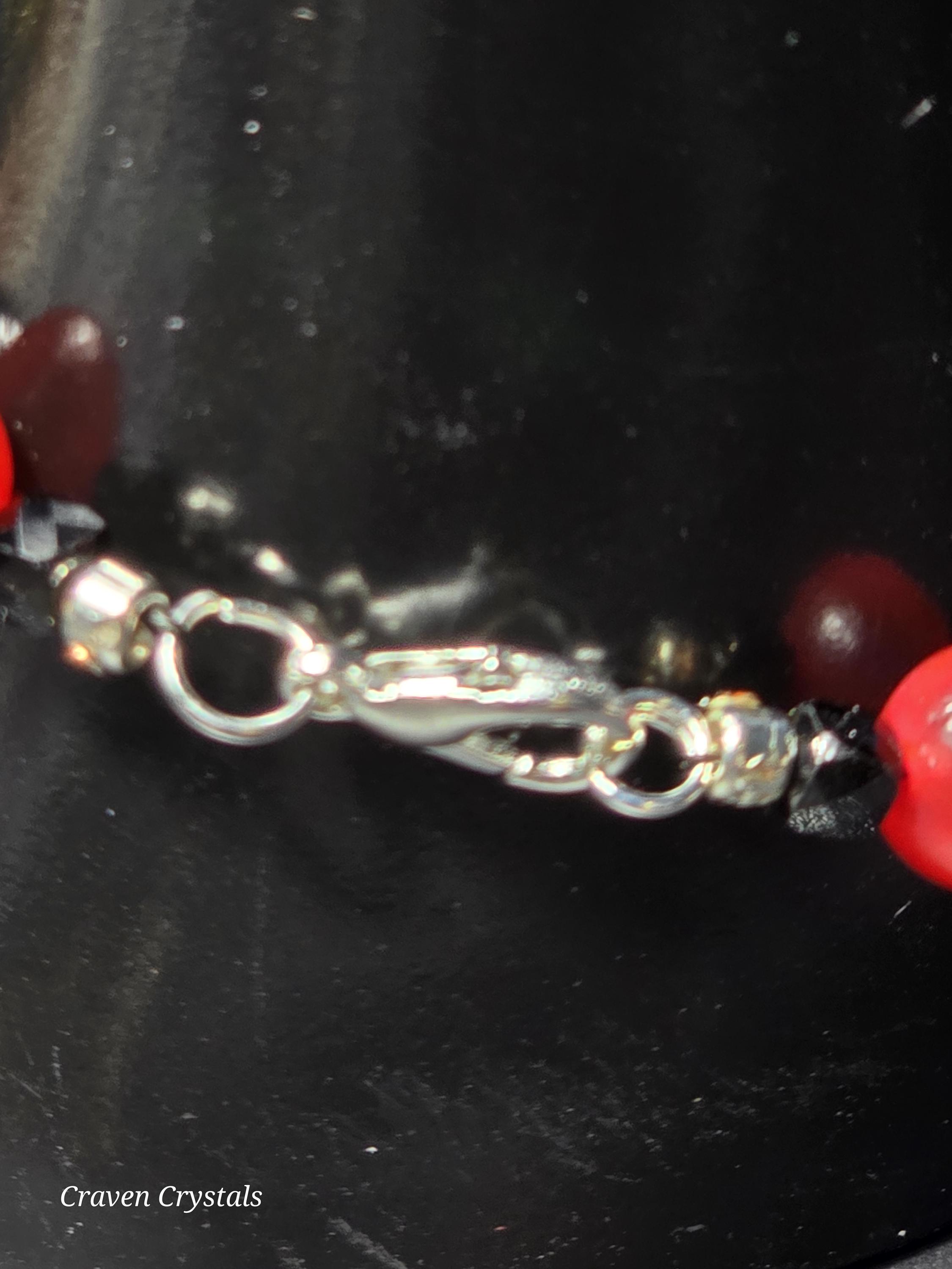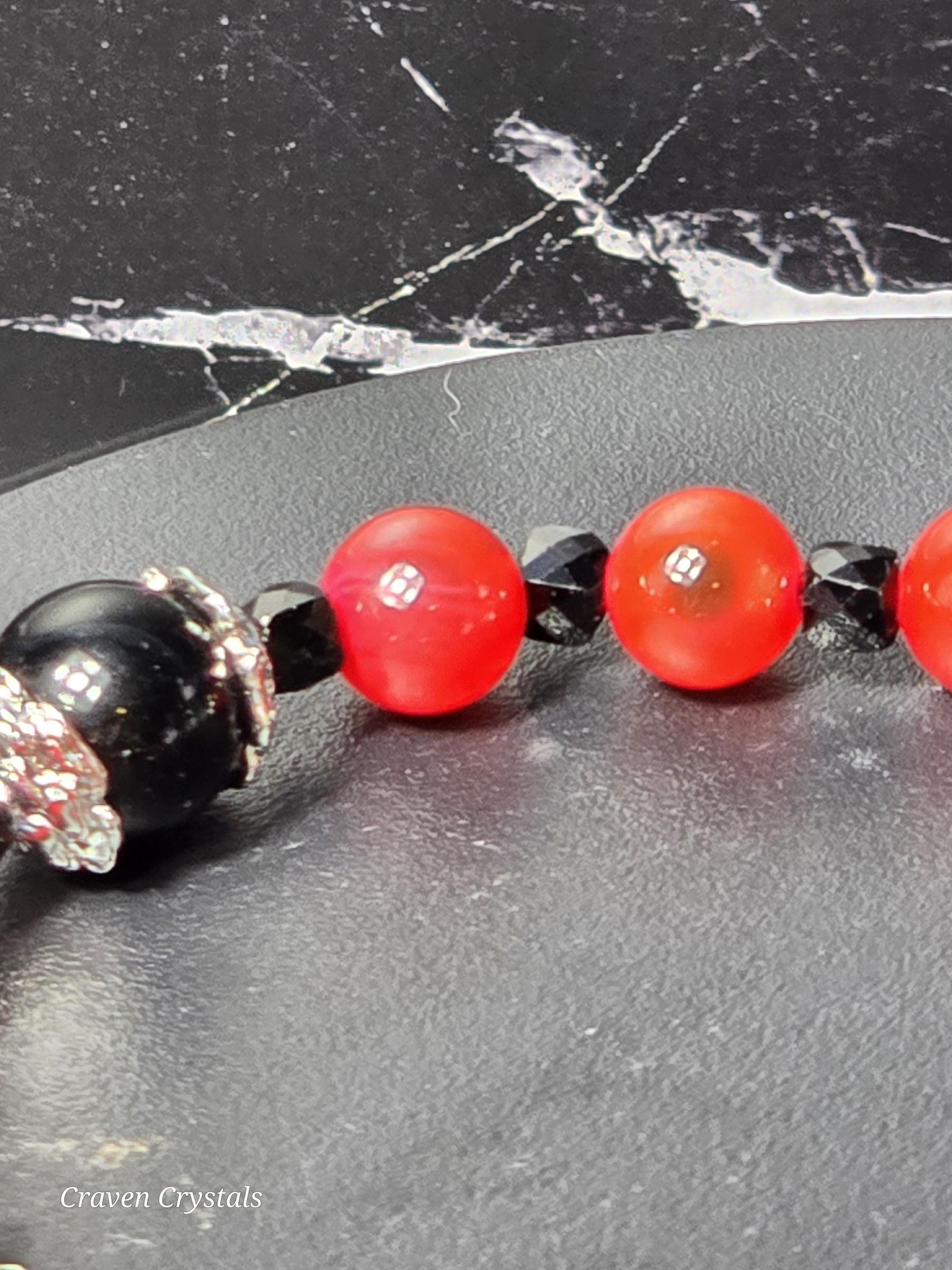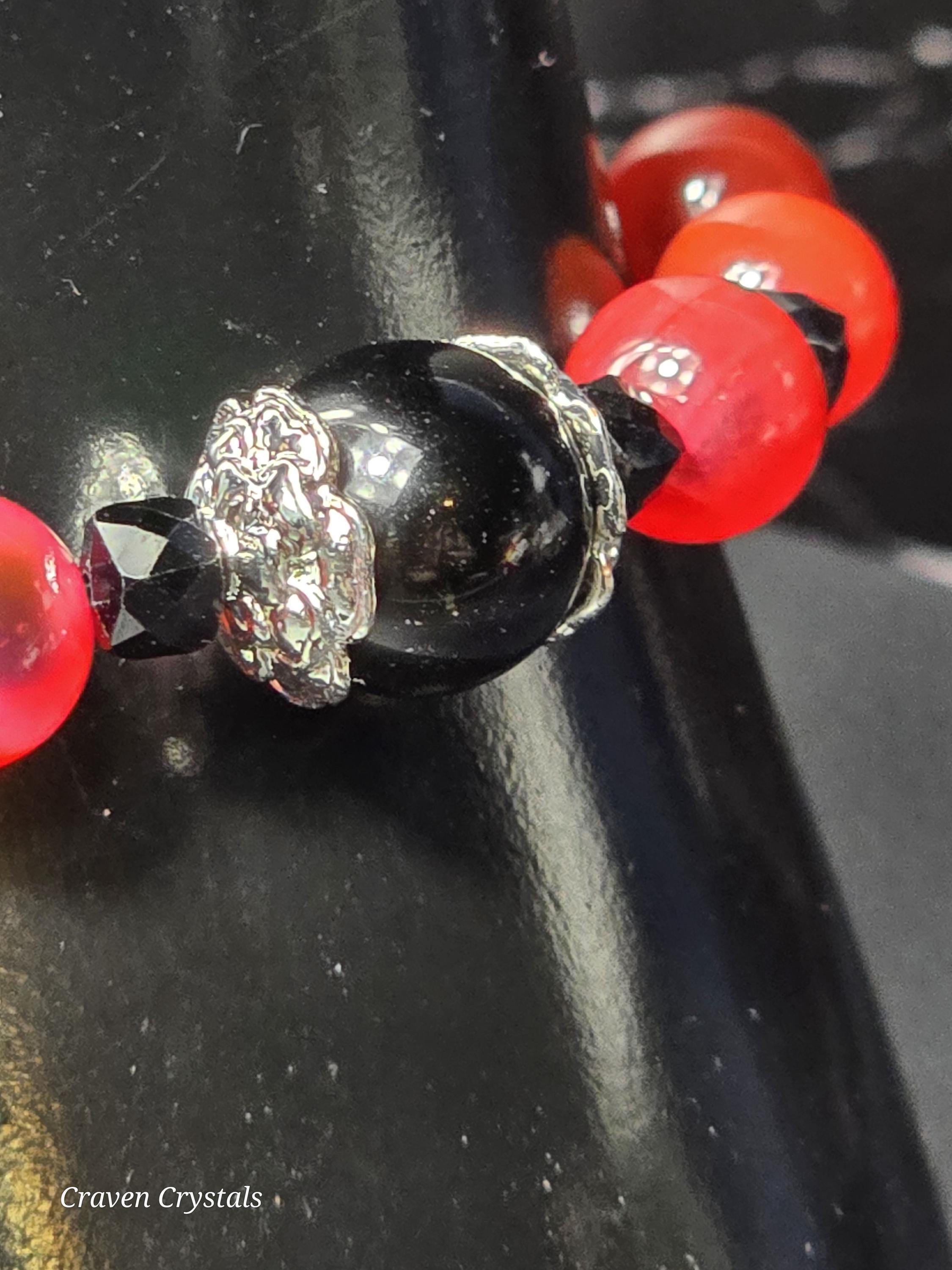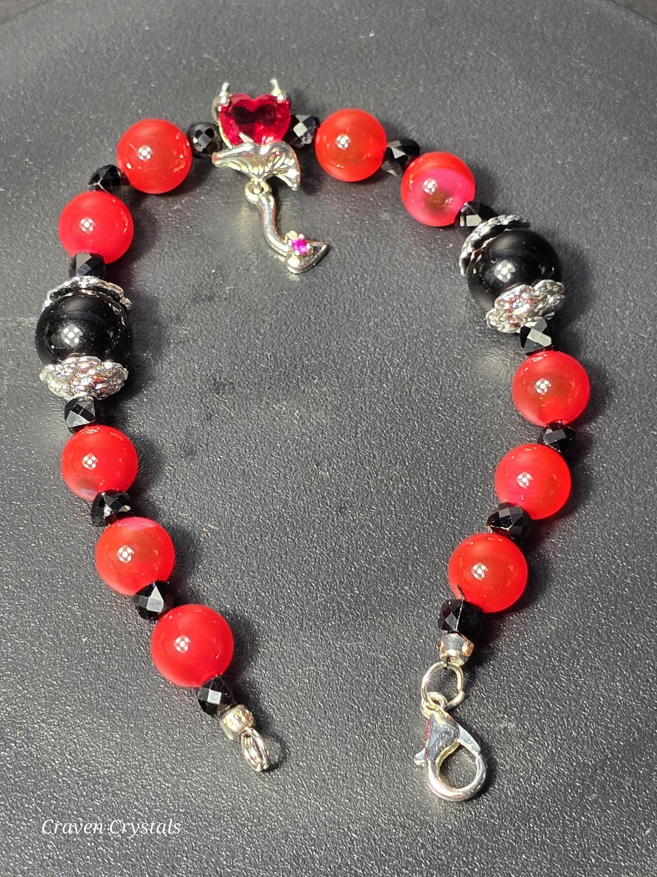 Bold, flirty, and just a little dangerous, “Sinfully Yours” is a bracelet made for unapologetic hearts. Vivid red Candy Heart Agate brings a rush of passion and playful intensity, while sleek obsidian and faceted black spinel ground the design with seductive depth and protective energy. Cool silver accents add a sharp, polished contrast, amplifying the bracelet’s edgy elegance.