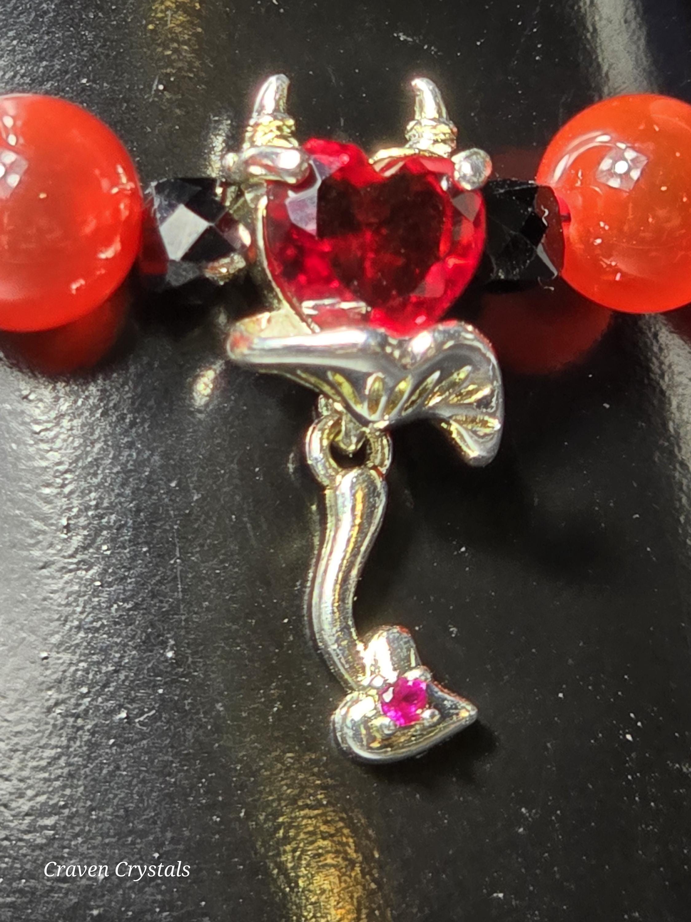 At the center is a show-stopping red heart centerpiece crowned with devil horns and a mischievous tail—a symbol of temptation, confidence, and owning your fire without apology. It’s equal parts dark romance and rebellious charm.