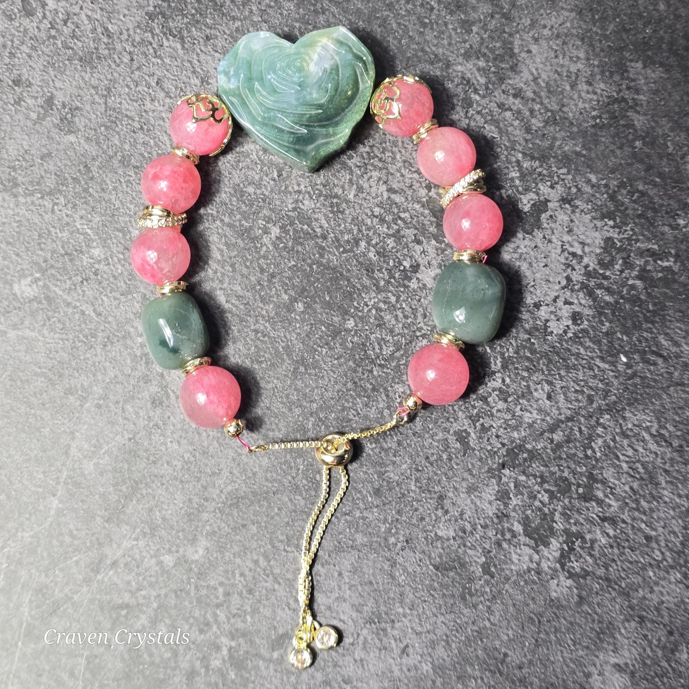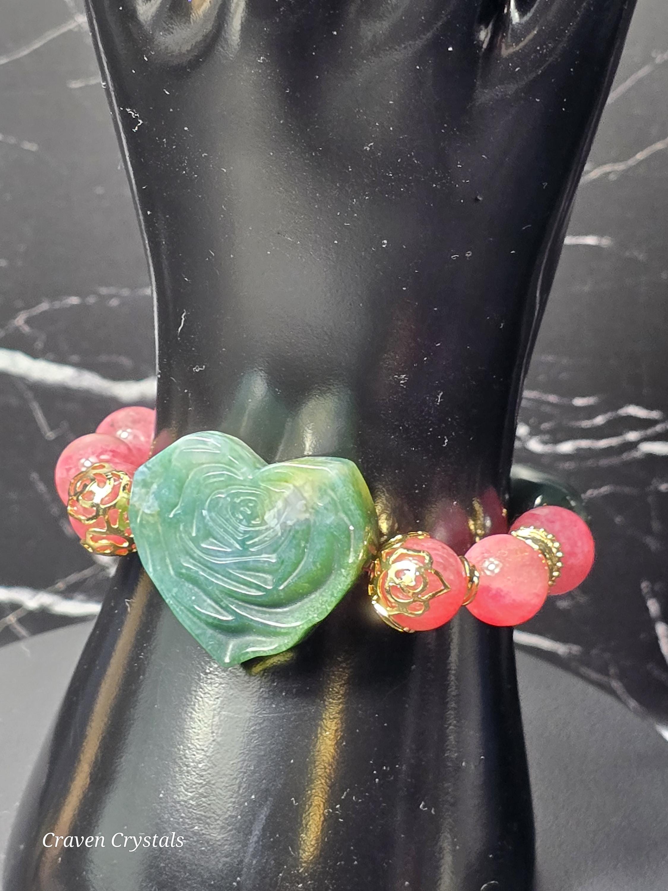 At the center blooms a stunning Moss Agate heart, intricately carved with a rose design—a symbol of growth, renewal, and love that thrives even in wild places. This centerpiece anchors the bracelet with both visual poetry and soulful meaning.
