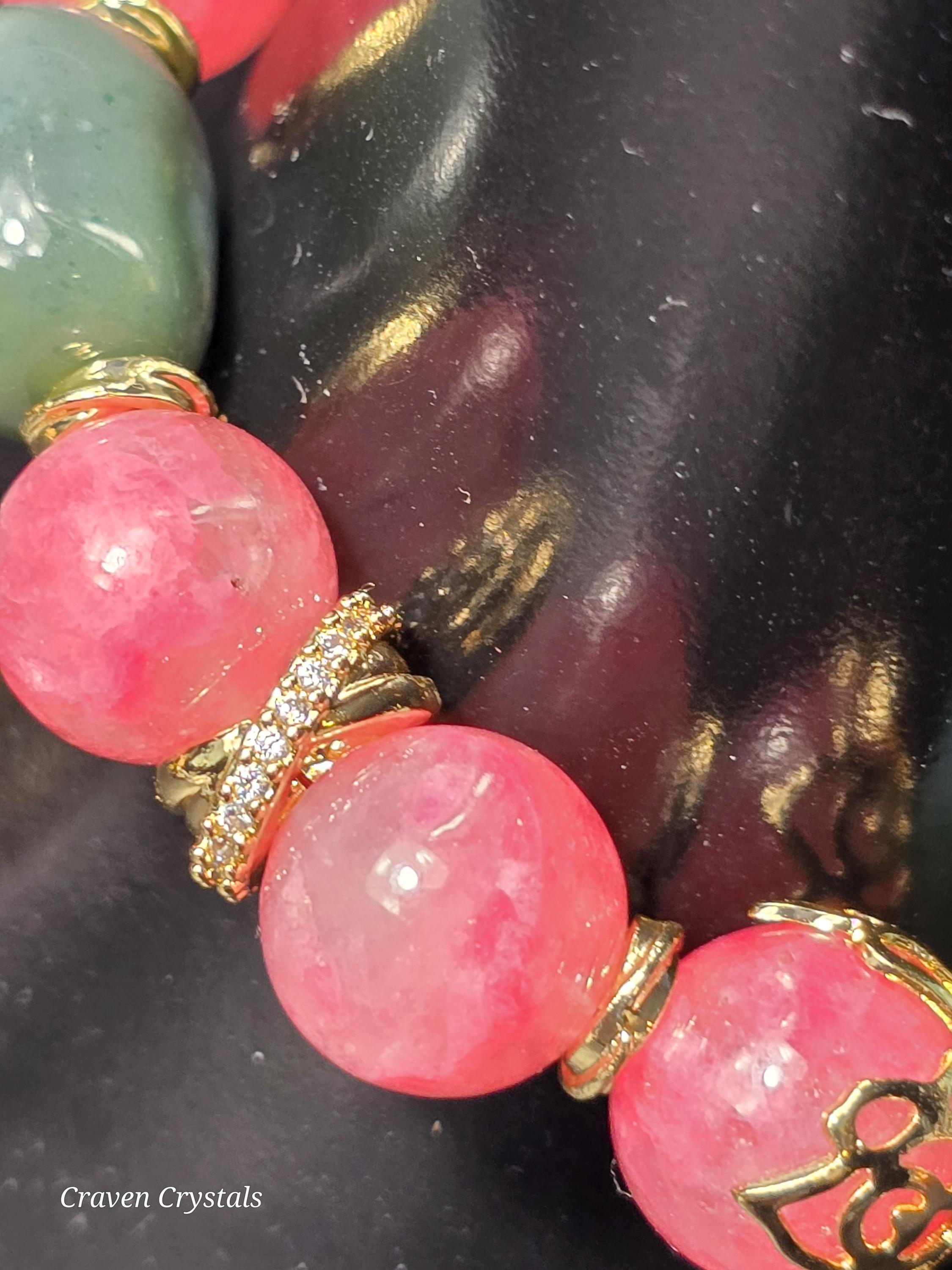Untamed beauty meets heartfelt symbolism in “Wild Roses,” a bracelet that balances resilience with romance. Cool-toned Ice Rhodonite brings gentle pinks kissed with icy depth, offering emotional balance and compassion, while earthy Hulunbuir Agate grounds the design with natural strength and steady energy. Warm gold accents thread through the bracelet like sunlight through petals, adding an elegant, luminous finish.