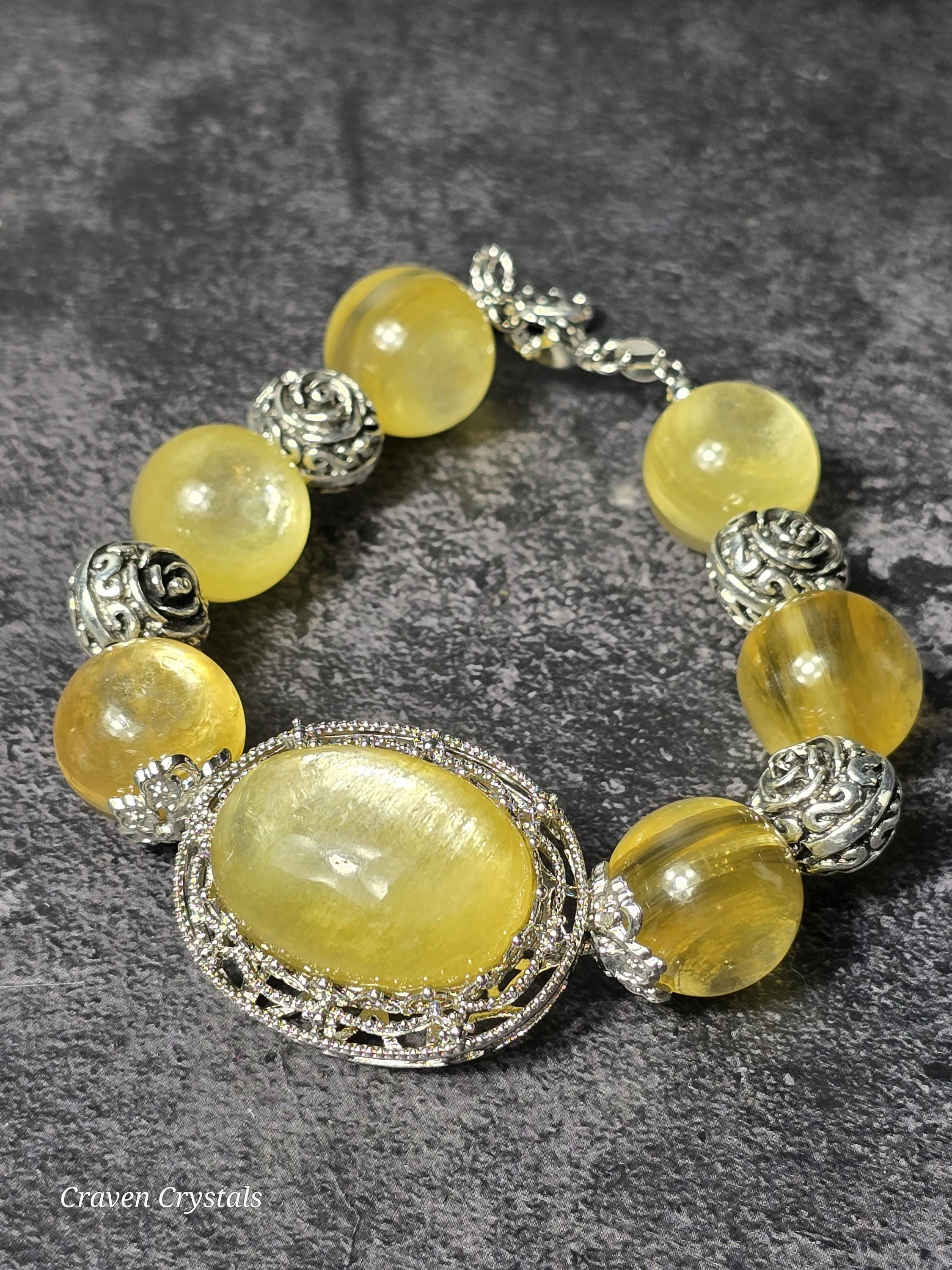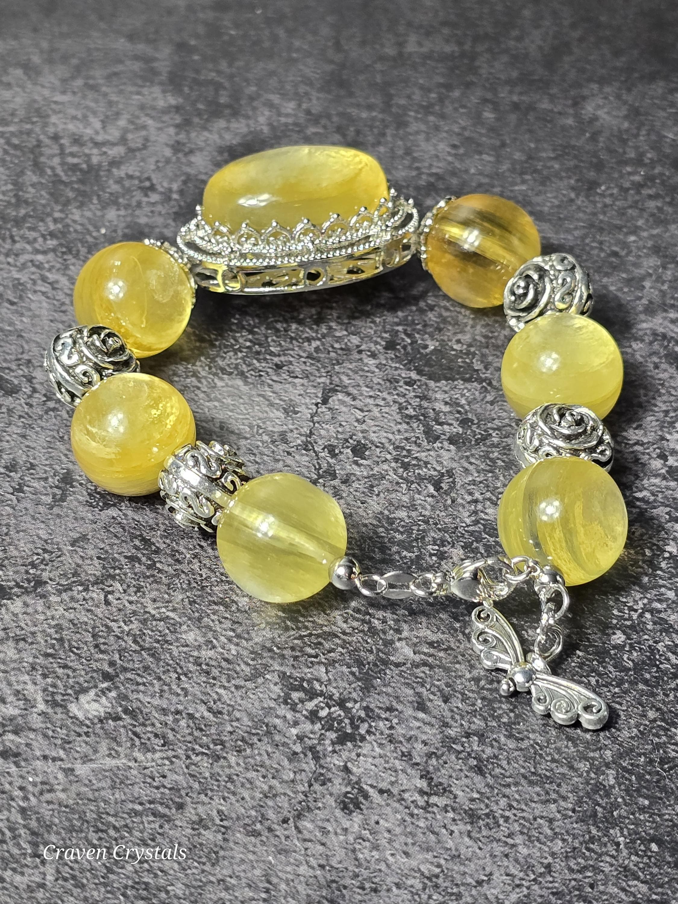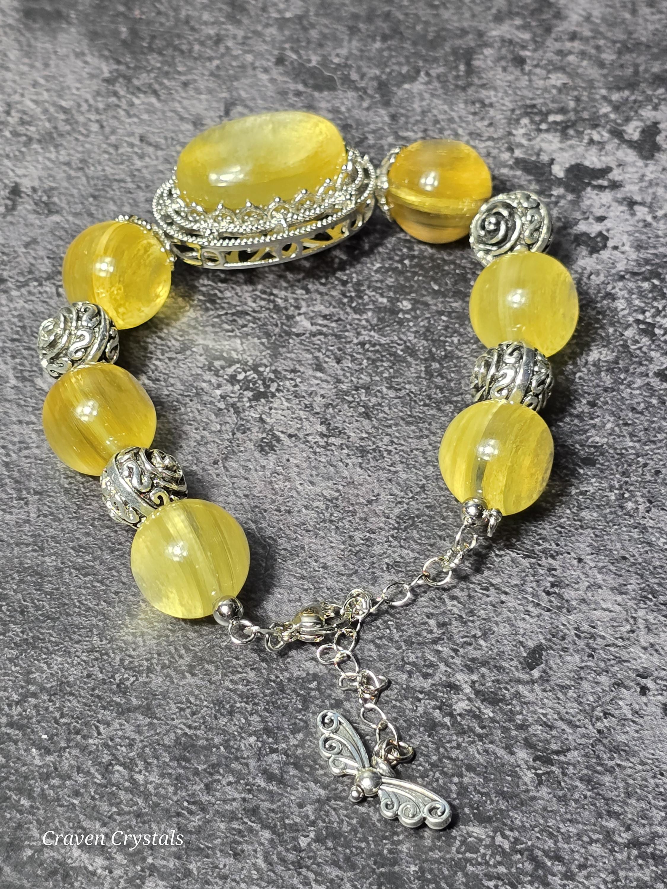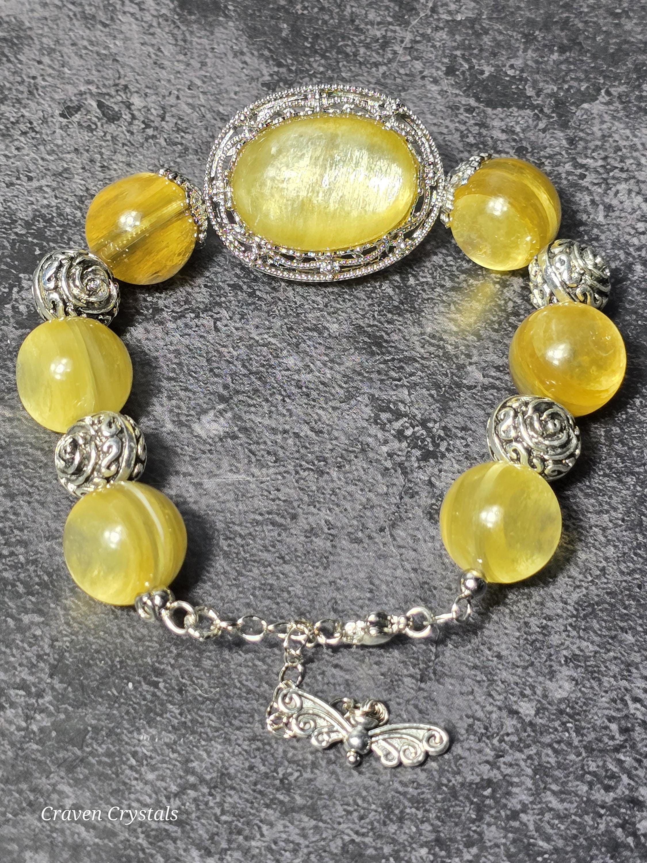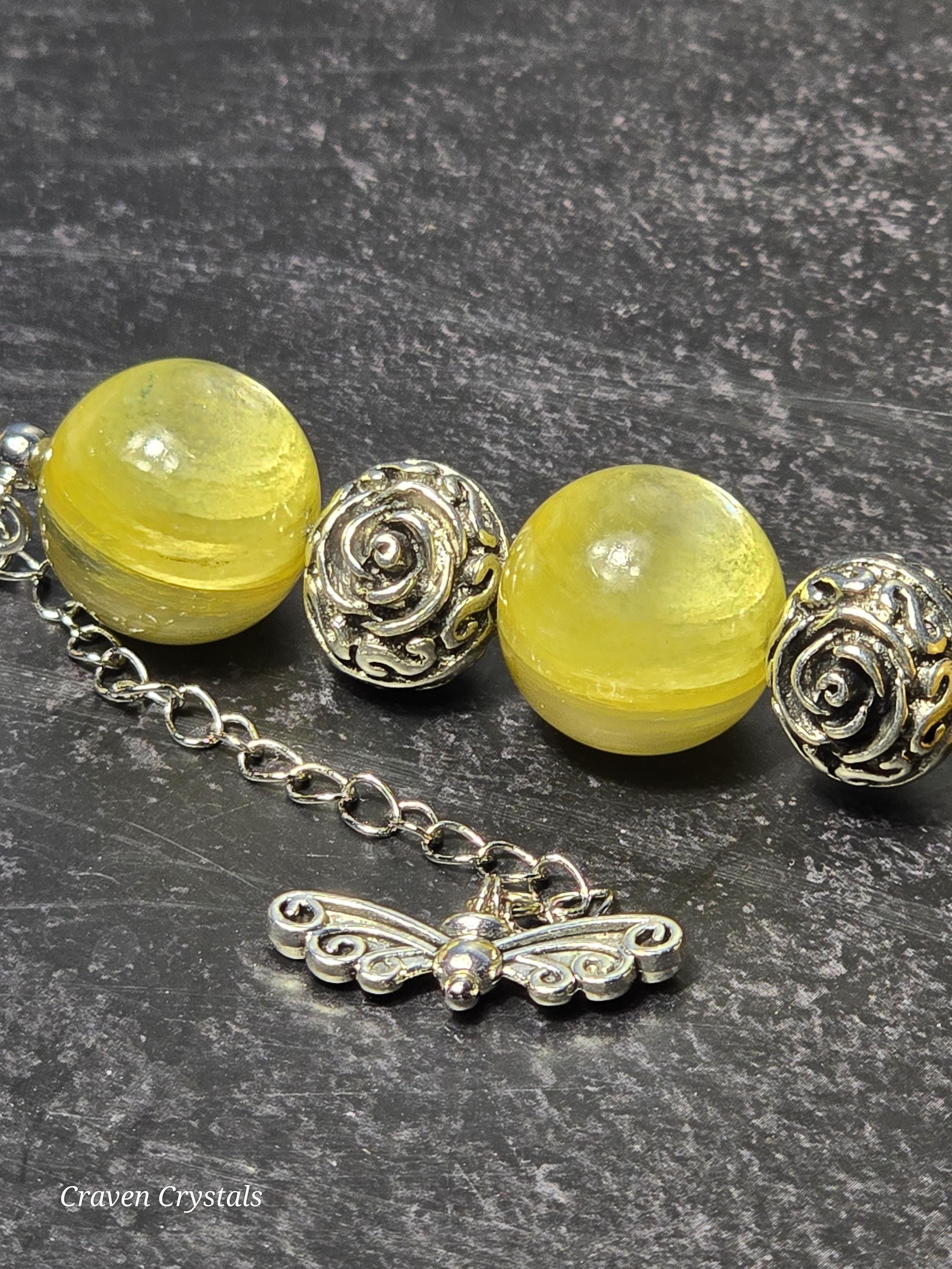 Radiant, earthy, and quietly enchanting, “Meadows of Gold” is a bracelet that feels like sunlight caught in motion. Crafted with bold 15mm golden mica beads, each stone shimmers with natural flecks that reflect warmth, confidence, and a grounded sense of abundance. Intricate Tibetan silver flower spacers add vintage-inspired charm, weaving delicate floral energy throughout the design. At the center, a stunning large golden mica focal stone set in dark silver anchors the bracelet with depth and contrast, highlighting the stone’s rich golden glow. Finished with an extension chain for adjustable comfort and a graceful silver dragonfly charm, this piece carries a deeper meaning—symbolizing transformation, adaptability, and the beauty of embracing change.✨