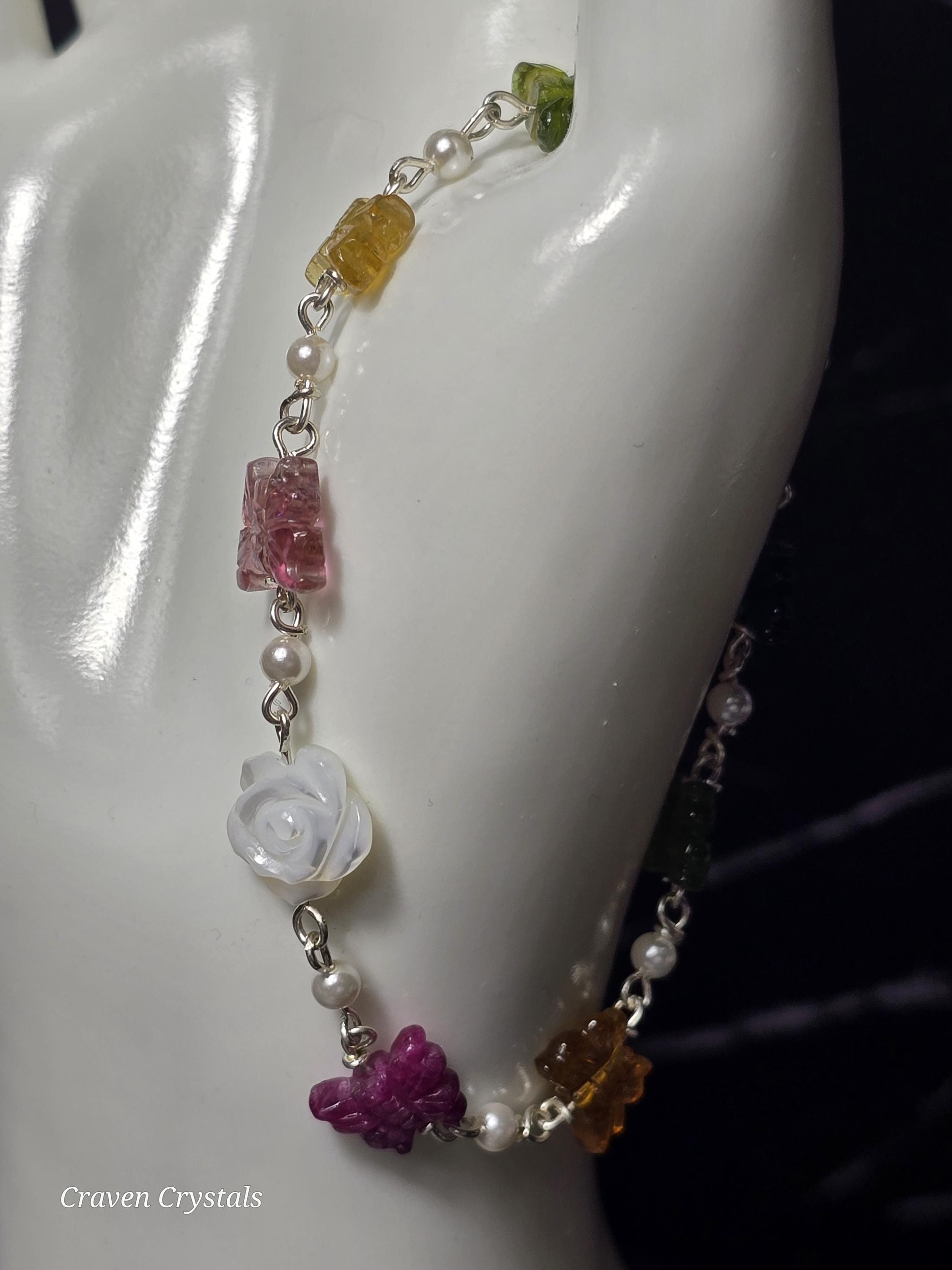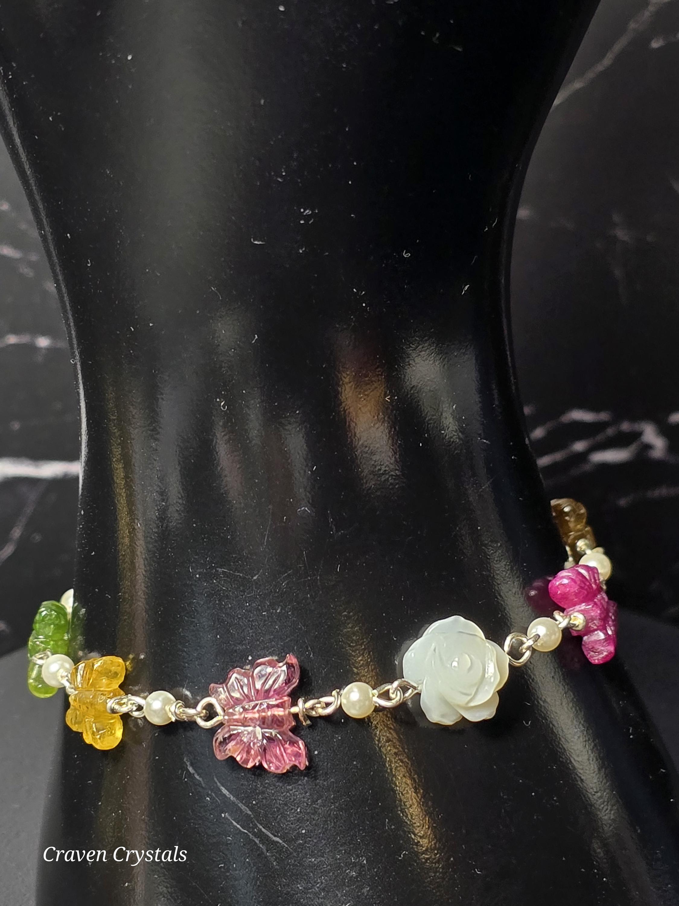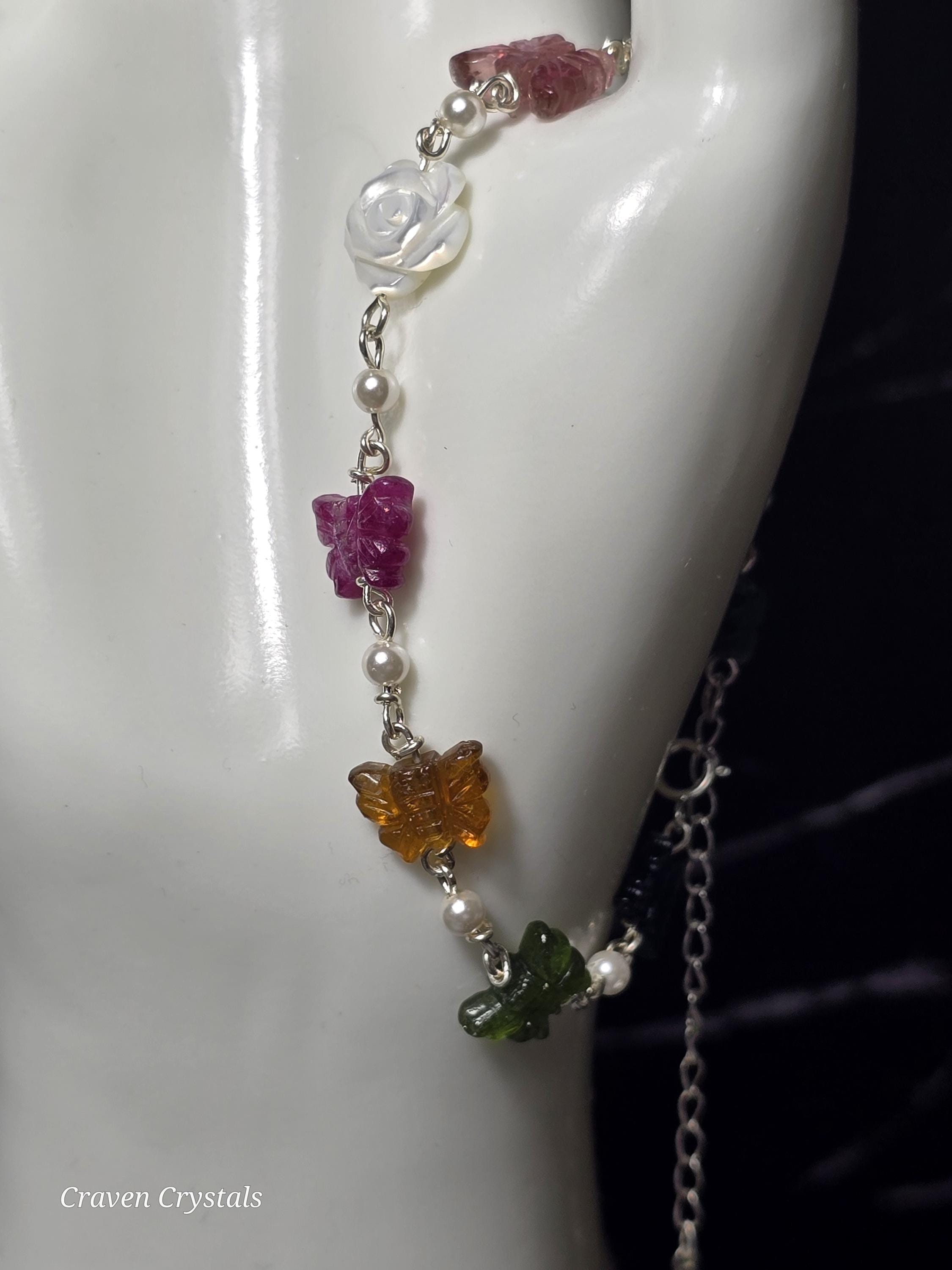 Whimsical, colorful, and full of life, captures the magic of a blooming garden in motion. Delicate tourmaline butterflies in shades of pink, green, yellow, and blue flutter gracefully throughout the bracelet, each color reflecting the joyful diversity of nature and the uplifting energy of transformation. Tourmaline is celebrated for its ability to balance energy and inspire positivity, making this piece as meaningful as it is beautiful. At the center blossoms a stunning rose-shaped shell centerpiece, softly luminous and carved to resemble a delicate flower in full bloom. The rose symbolizes love, growth, and beauty, anchoring the lively butterflies with a gentle, romantic heart.🦋🌹