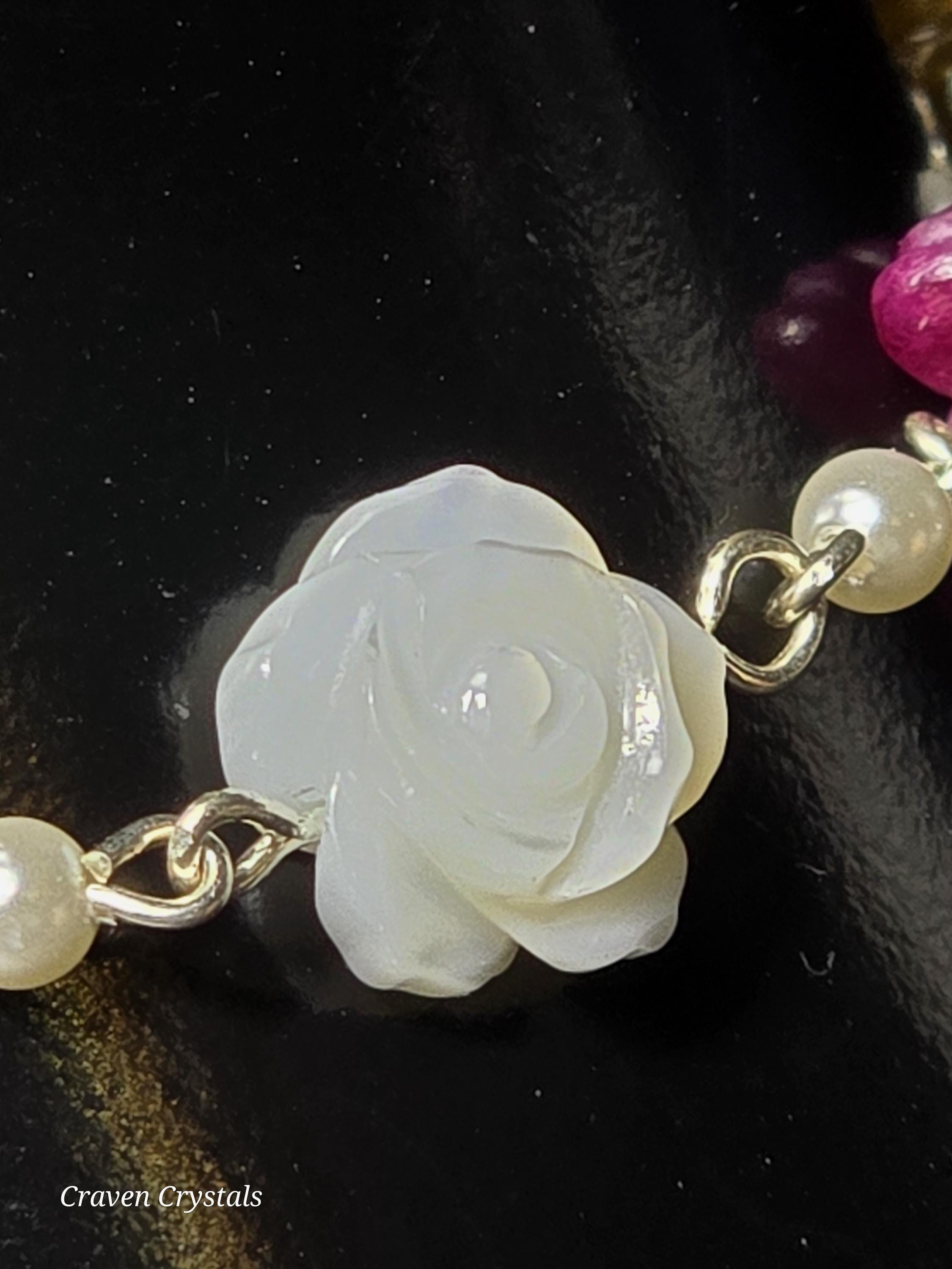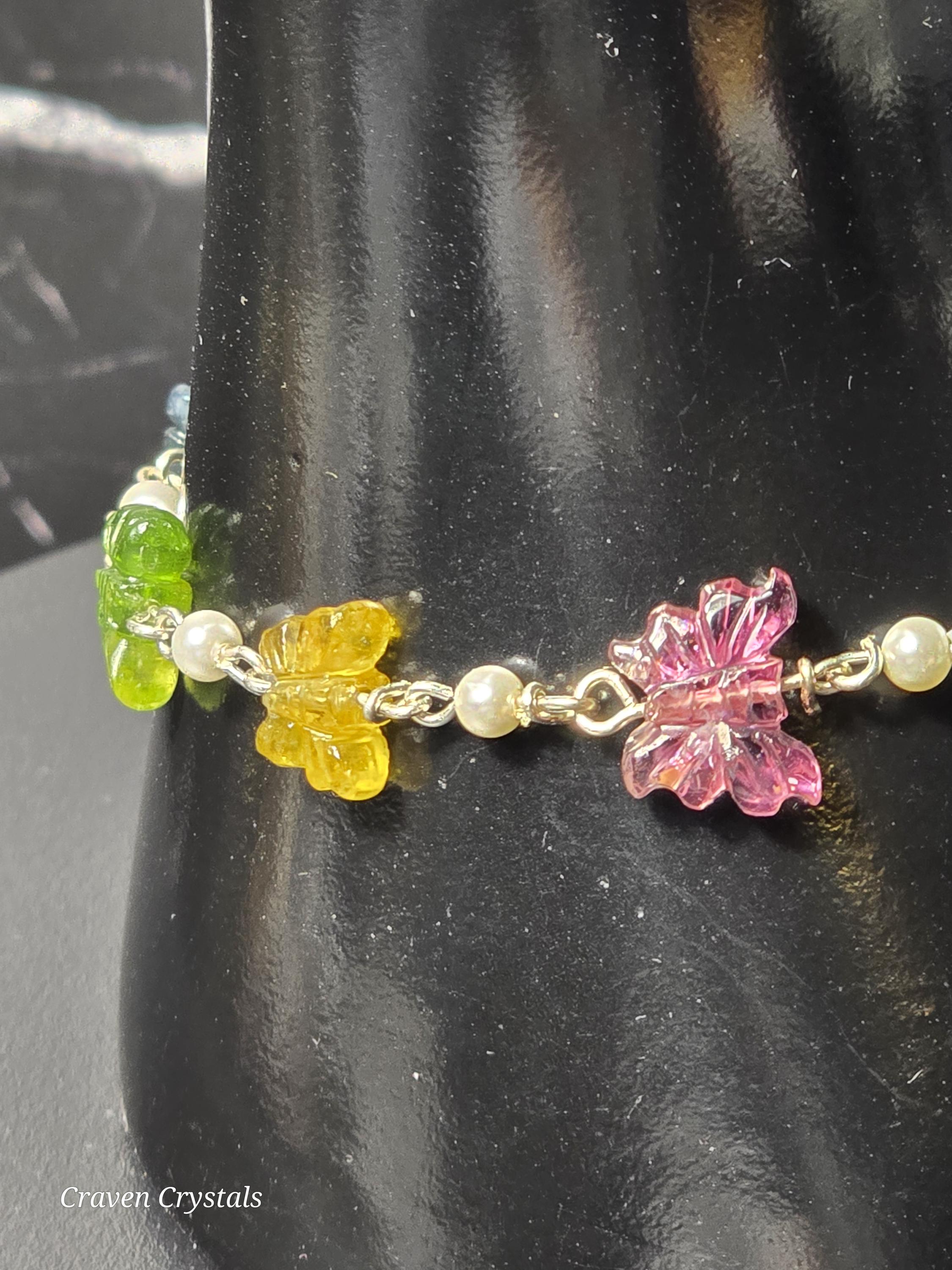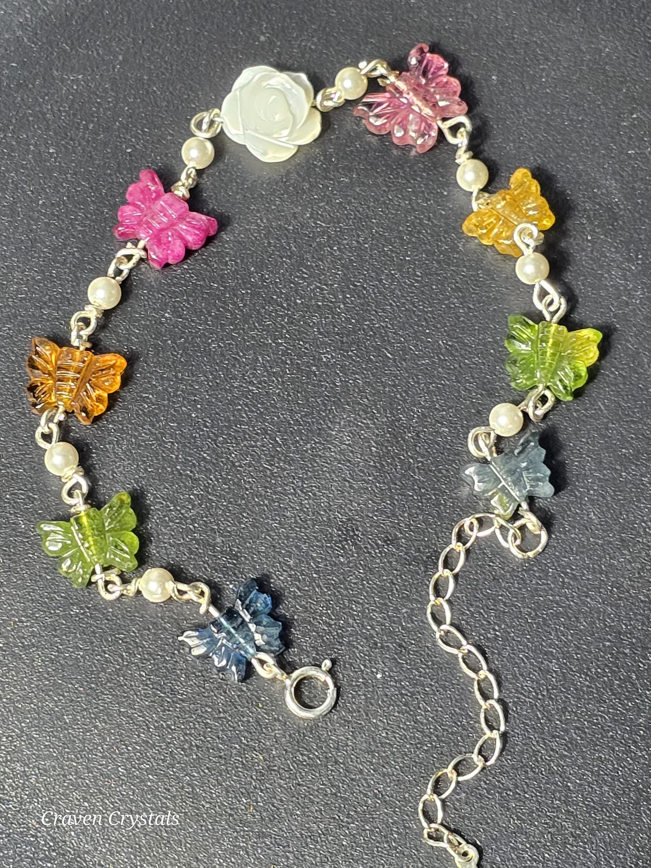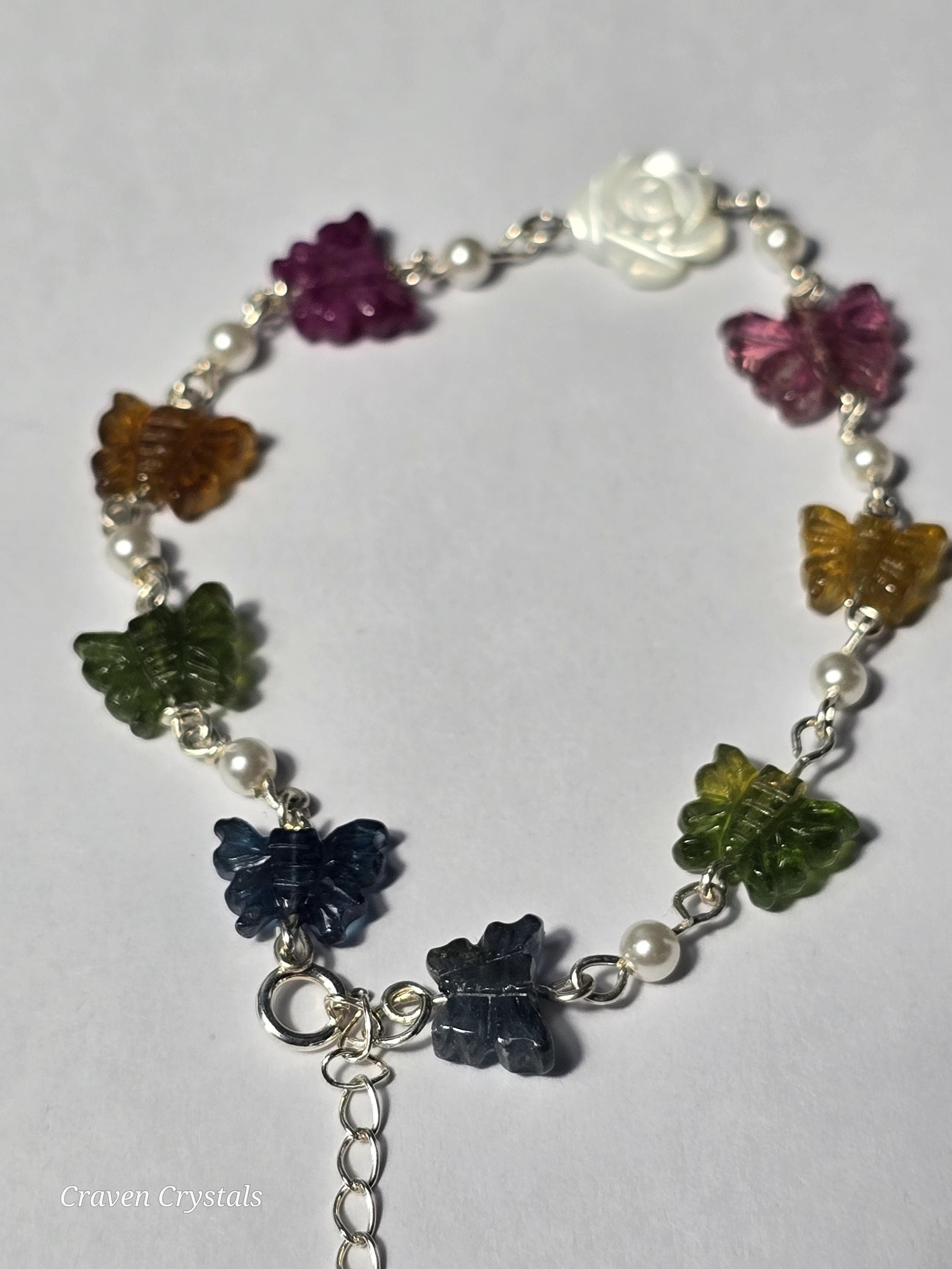 Whimsical, colorful, and full of life, captures the magic of a blooming garden in motion. Delicate tourmaline butterflies in shades of pink, green, yellow, and blue flutter gracefully throughout the bracelet, each color reflecting the joyful diversity of nature and the uplifting energy of transformation. Tourmaline is celebrated for its ability to balance energy and inspire positivity, making this piece as meaningful as it is beautiful. At the center blossoms a stunning rose-shaped shell centerpiece, softly luminous and carved to resemble a delicate flower in full bloom. The rose symbolizes love, growth, and beauty, anchoring the lively butterflies with a gentle, romantic heart.🦋🌹