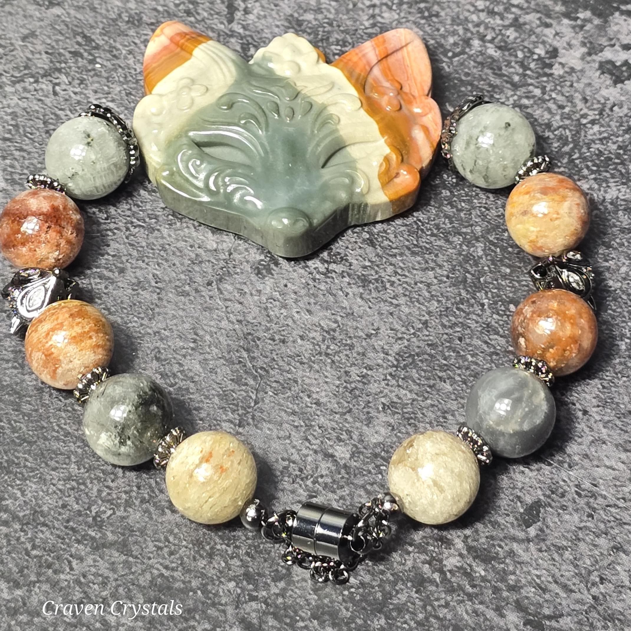 Mysterious, clever, and deeply connected to nature’s hidden magic, “Spirit of the Fox” captures the quiet intelligence and adaptability of one of the forest’s most enchanting guardians. Mesmerizing Thousand Layer Phantom Garden Quartz forms the heart of the bracelet, each bead holding dreamy layers and landscape-like inclusions that resemble tiny enchanted forests suspended in crystal. These natural formations symbolize growth, transformation, and the wisdom gained through life’s many layers. Bold black accents add striking contrast and grounding energy, while two detailed fox head beads guard the design like watchful forest spirits. At the center sits a stunning Alashan Agate fox mask centerpiece, a powerful symbol of intuition, strategy, and playful cunning—qualities long associated with fox mythology across cultures.