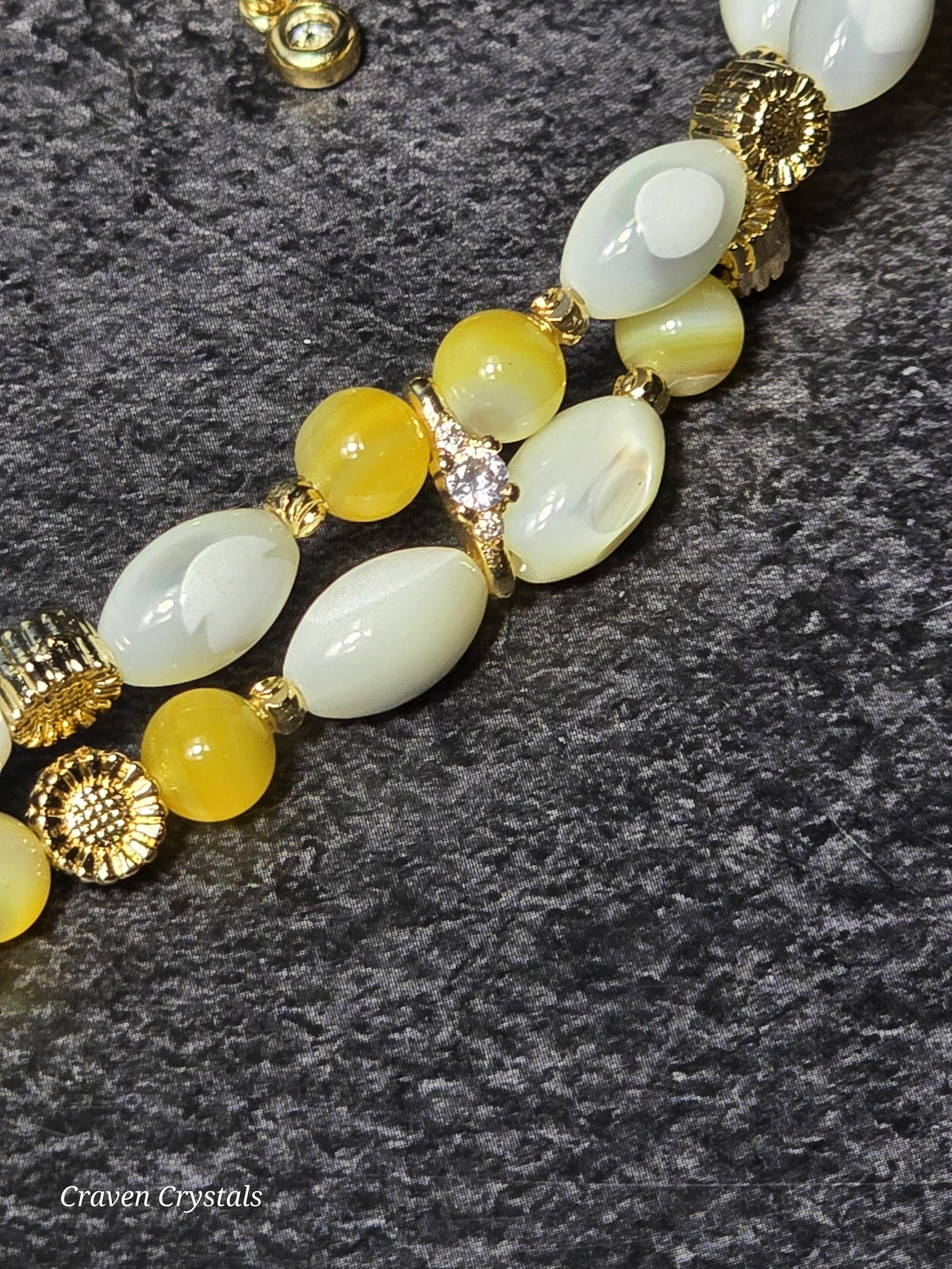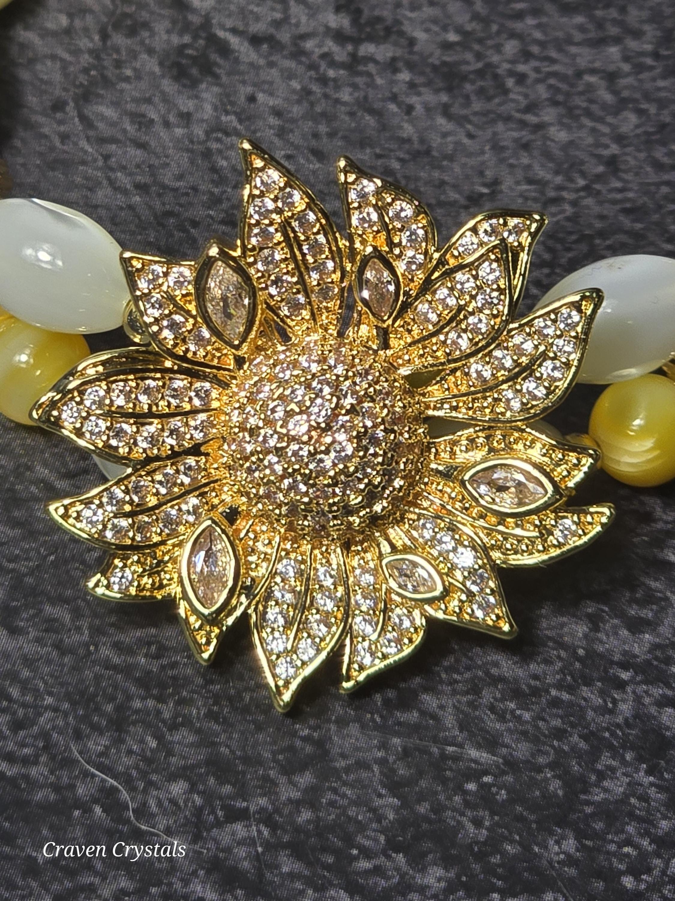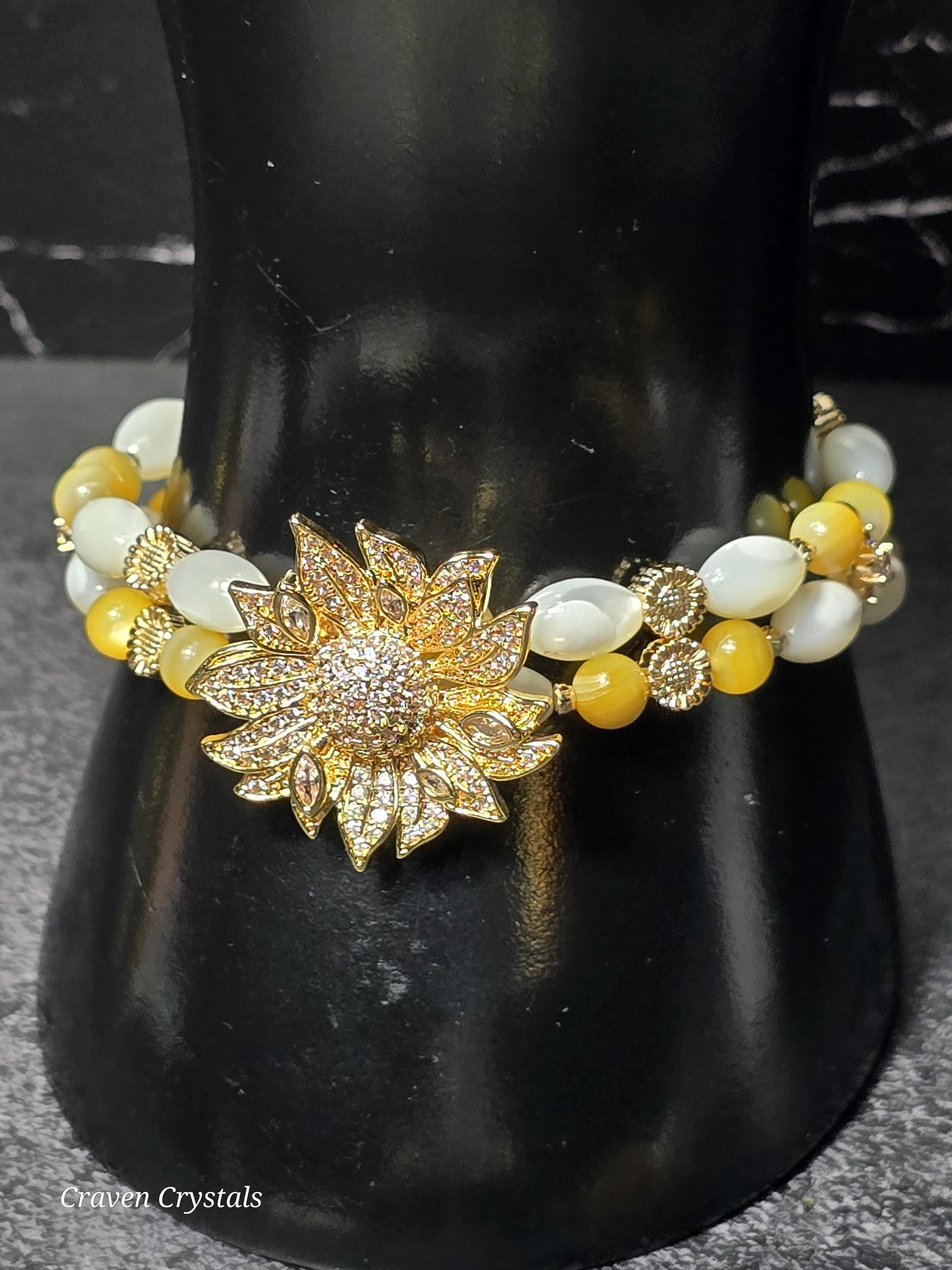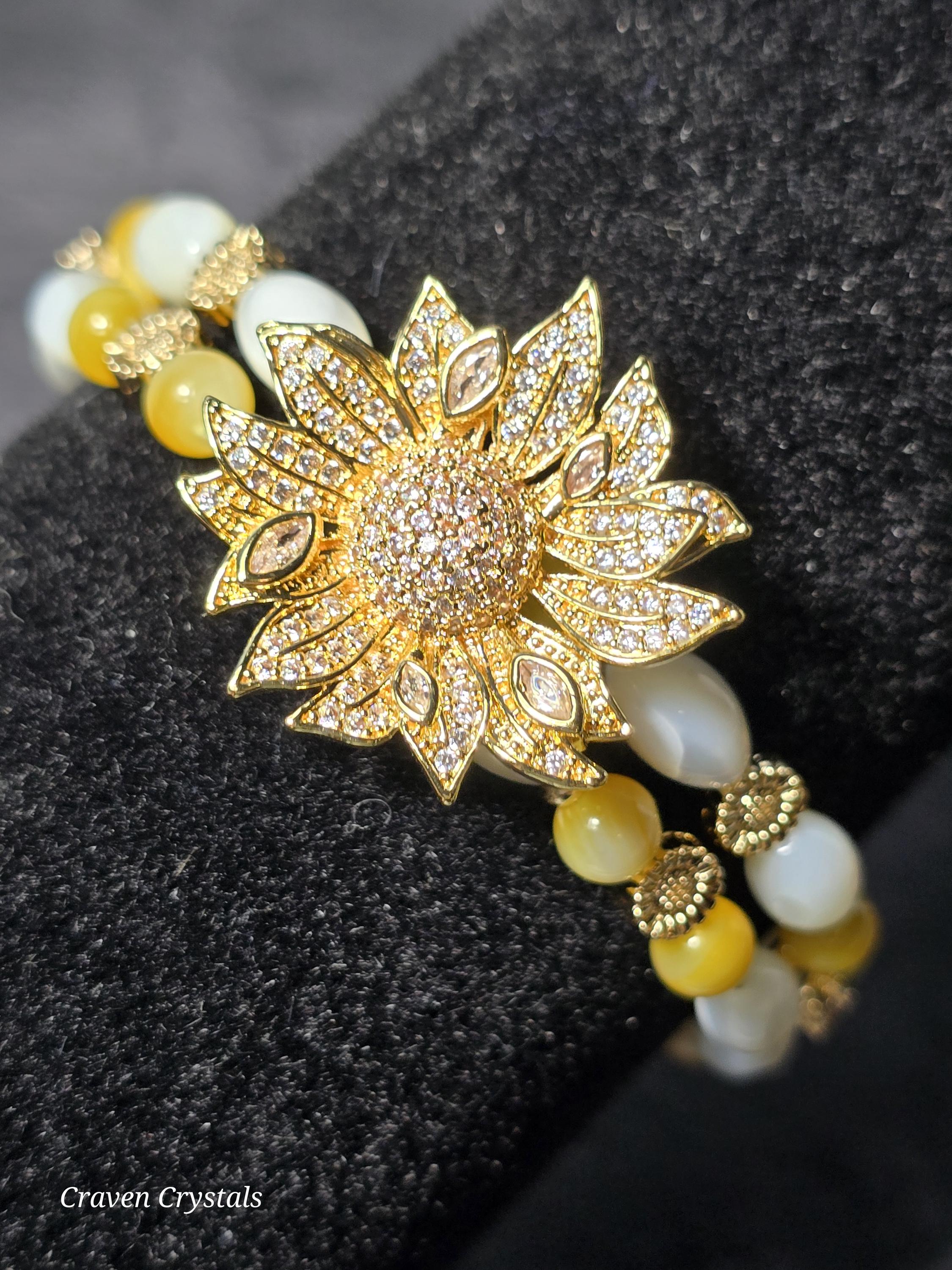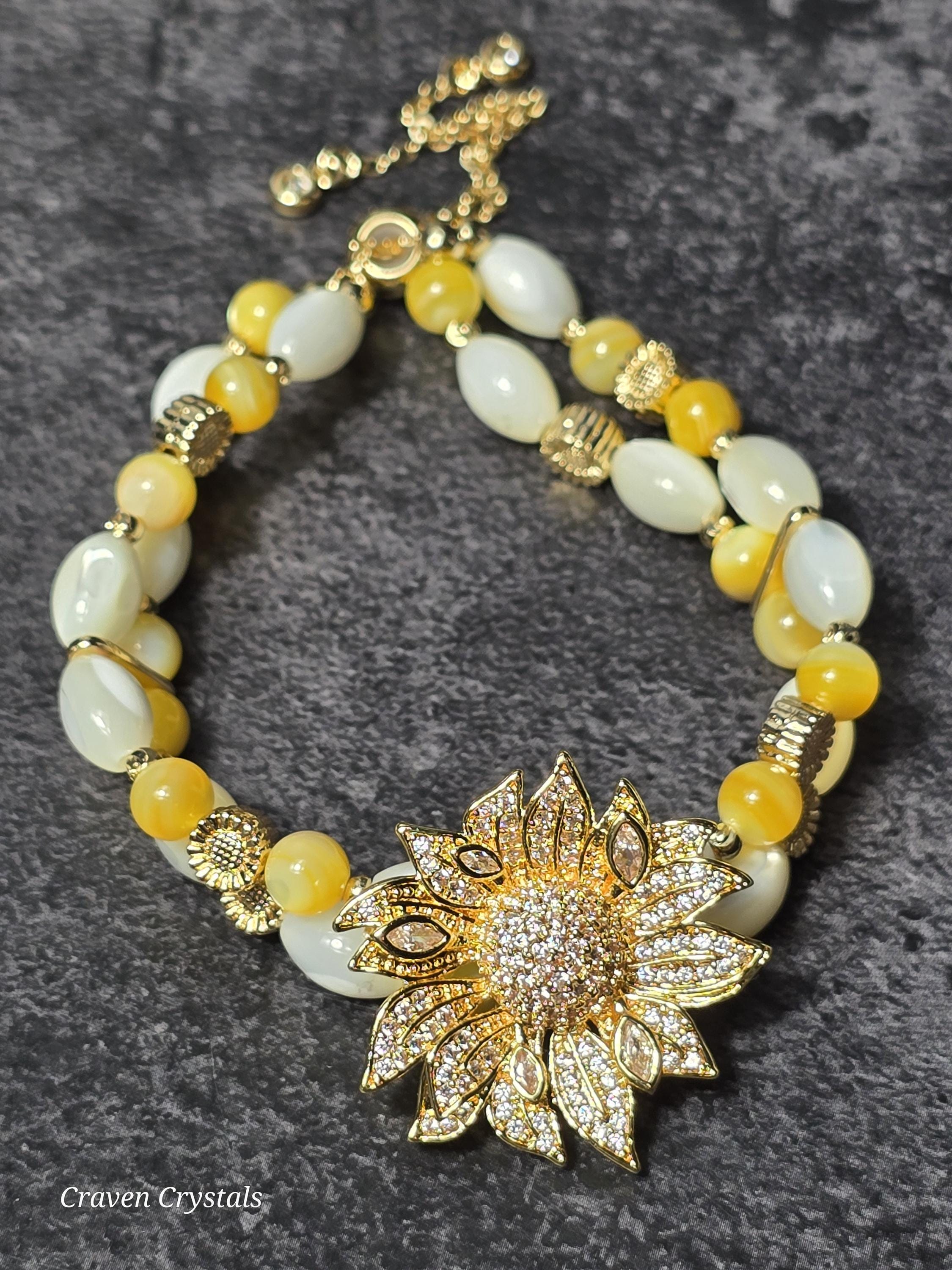 Radiant and full of cheerful charm, “Sunlit Bloom” is a bracelet that captures the warmth of a sunny day in full blossom. Designed with a double layer of luminous rice-shaped shell beads and round golden shell, the bracelet shimmers with soft, natural iridescence that reflects light like sunshine dancing on water. The layered design gives it a delicate yet eye-catching presence on the wrist. Throughout the bracelet, warm gold accents and tiny sunflower details bring a joyful garden-inspired touch. At the center, a stunning large gold sunflower centerpiece adorned with sparkling zircon shines brilliantly, symbolizing happiness, vitality, and the uplifting energy of the sun.🌻