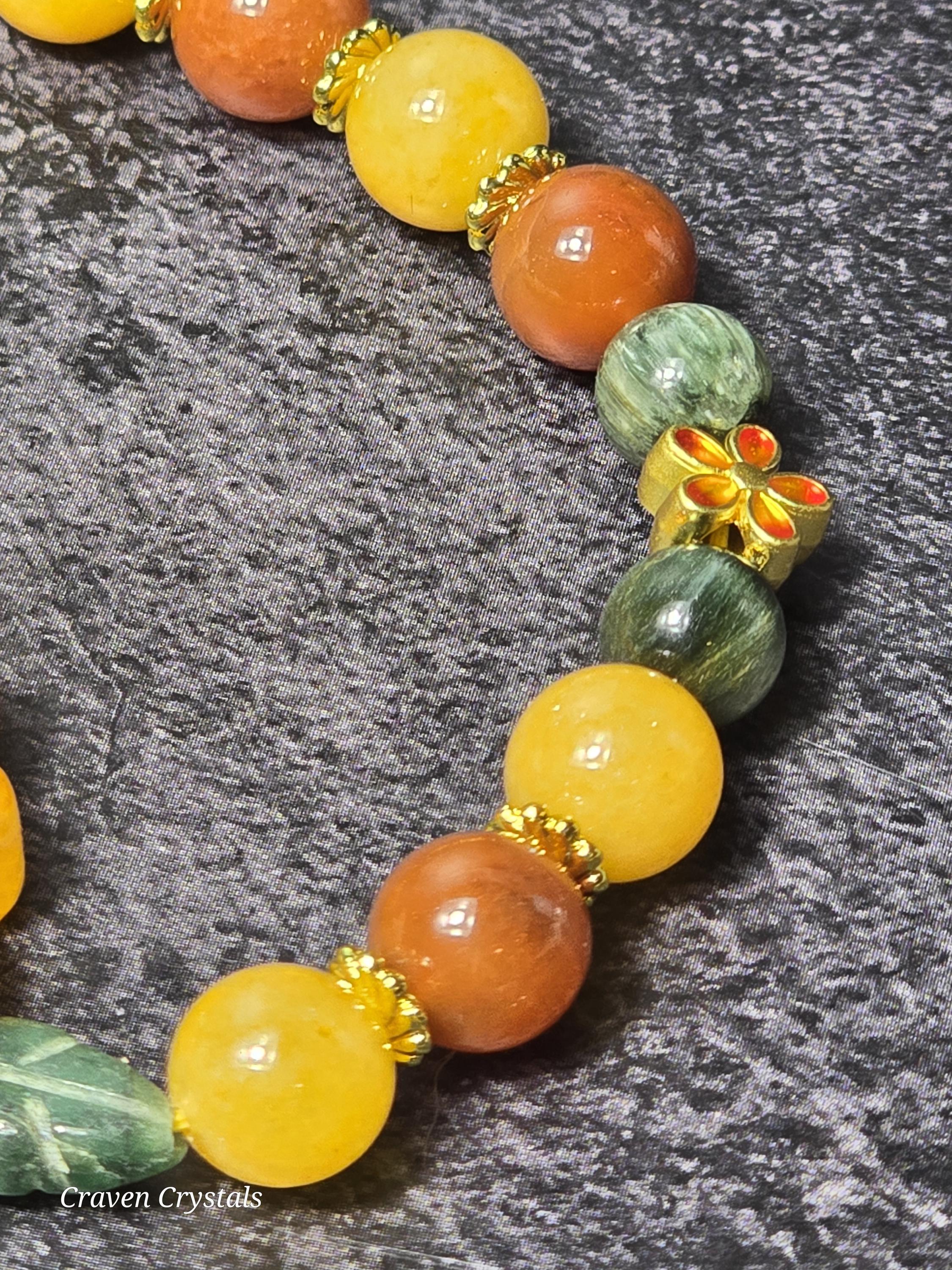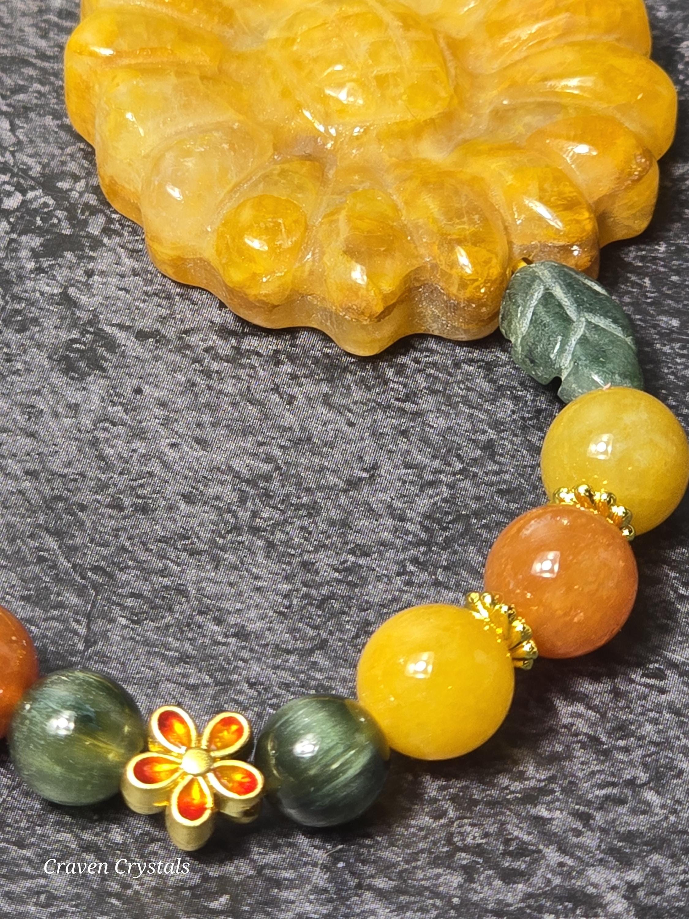 Warm, radiant, and full of nature’s golden abundance, “Golden Harvest” celebrates the vibrant beauty of sunlit fields and blooming life. Glowing Golden Silk Jade beads in rich shades of honeyed yellow and warm orange form the heart of the bracelet, evoking the energy of sunshine, joy, and vitality. Interwoven among them are striking Green Rabbit Hair Quartz beads, whose delicate needle-like inclusions resemble tiny strands of nature’s wild grasses, symbolizing growth, resilience, and life in motion. At the center blooms a magnificent Golden Healer Sunflower centerpiece, radiating uplifting energy and warmth. On either side, two elegant Emerald leaf accents cradle the sunflower, representing renewal, harmony, and the flourishing power of nature. Additional gold accents and two decorative gold flowers with orange and yellow enamel details add vibrant garden-inspired charm that ties the entire design together.🌻