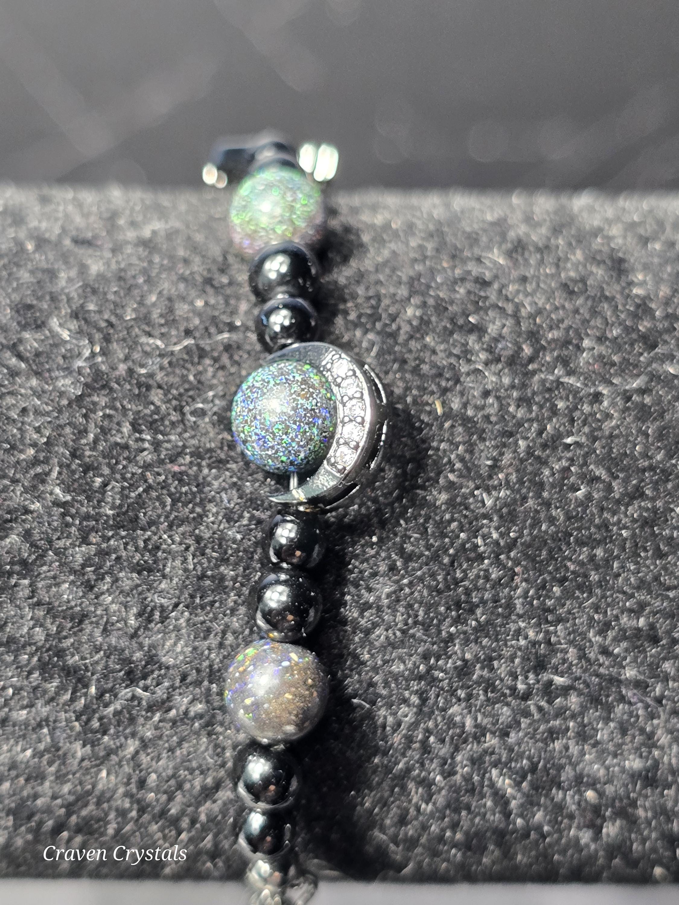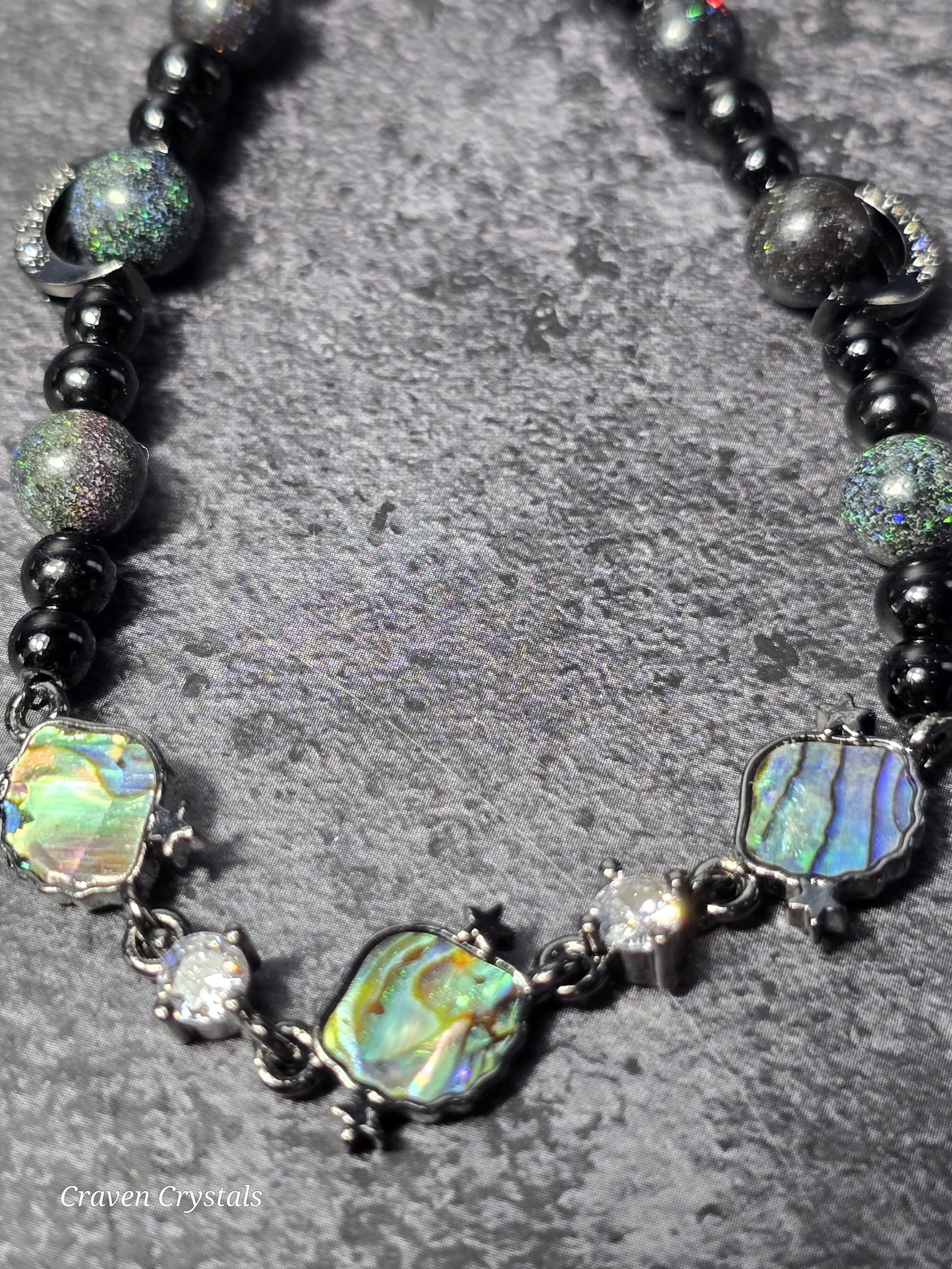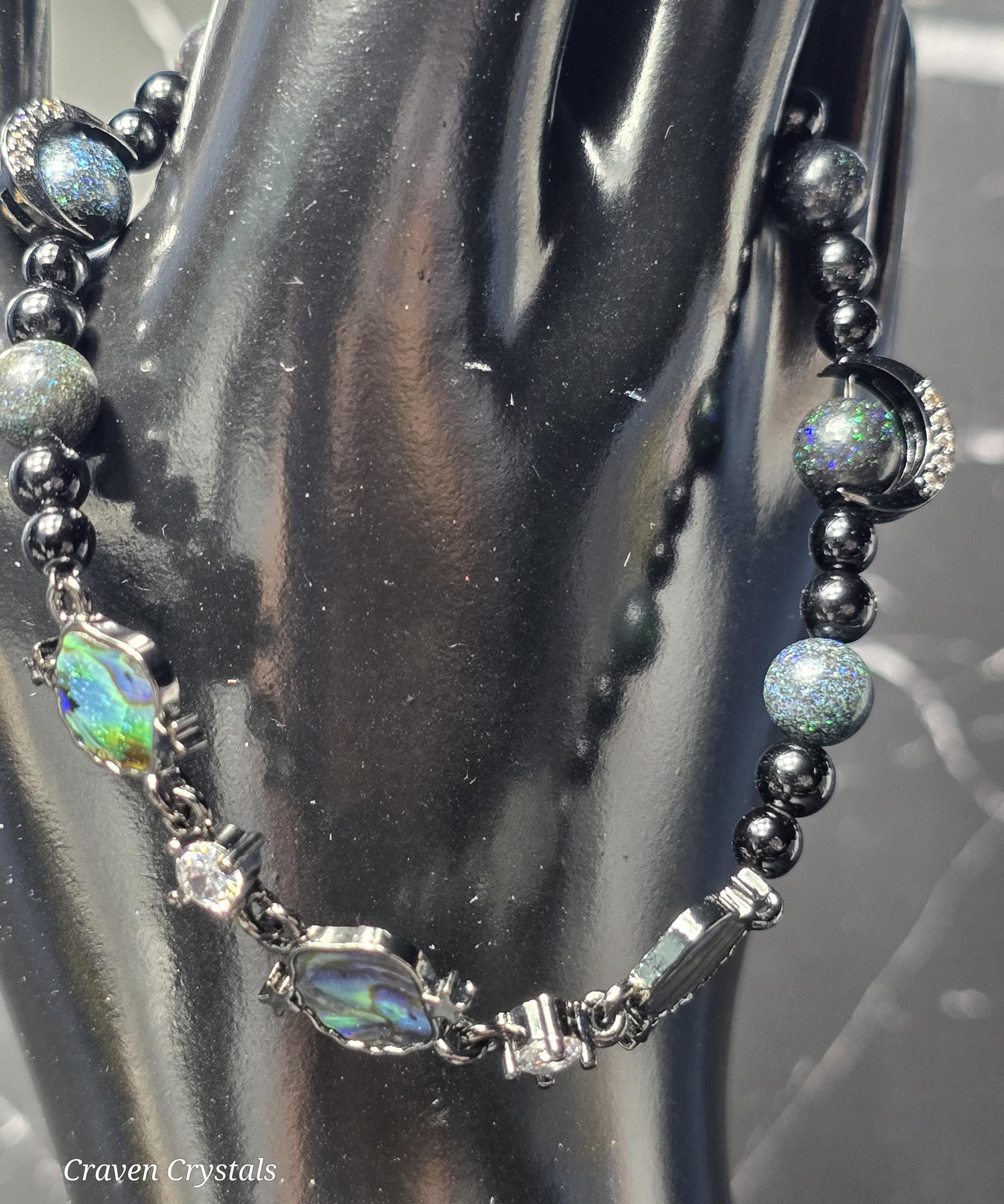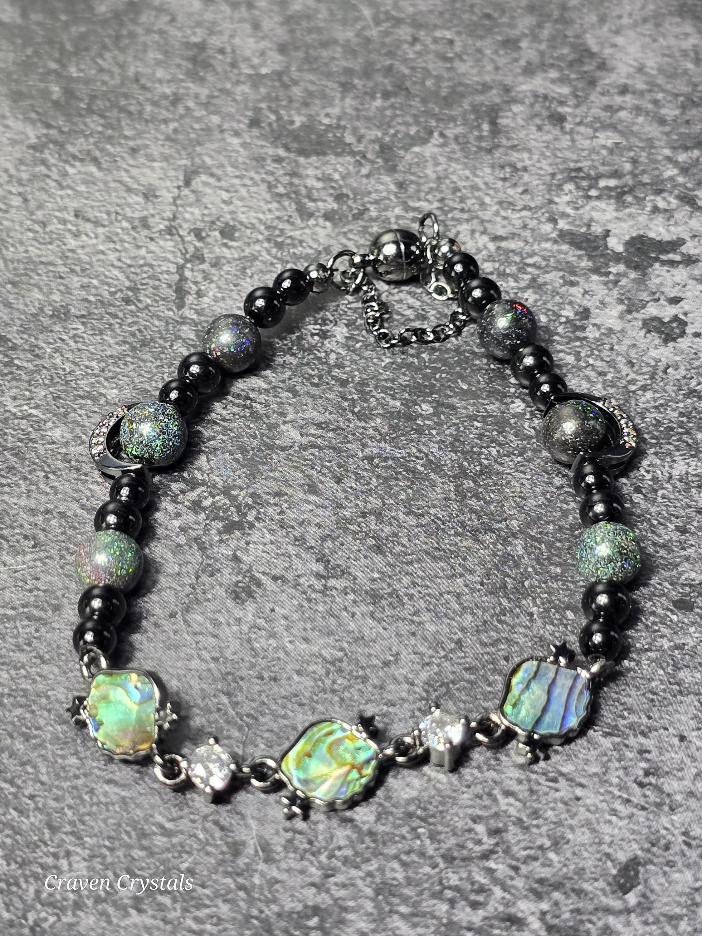 Dark, dazzling, and endlessly mysterious, “Midnight Galaxy” captures the breathtaking beauty of a starlit sky. Shimmering black Andamooka opal beads sparkle with cosmic flashes of color, like distant stars scattered across deep space. These are paired with protective black tourmaline and sleek black hematite, creating a powerful trio that balances beauty with grounding strength. At the center, a luminous abalone shell connector framed with sparkling zircon glows with iridescent blues, greens, and purples—resembling a tiny galaxy swirling with celestial light. Bold black accents, including two crescent moon details, deepen the cosmic theme while adding a touch of gothic elegance. The bracelet is finished with a magnetic closure for secure, effortless wear.🌙✨