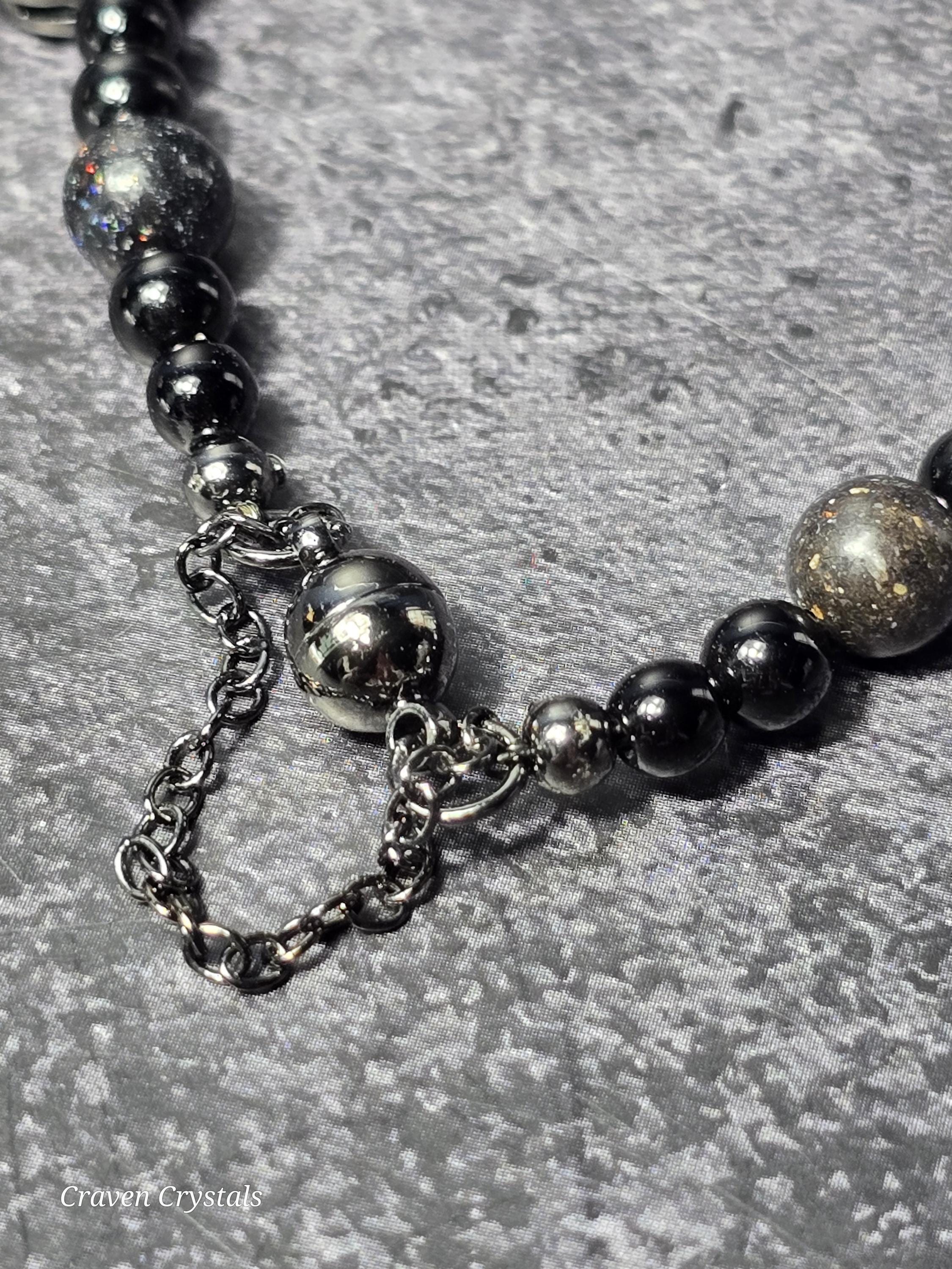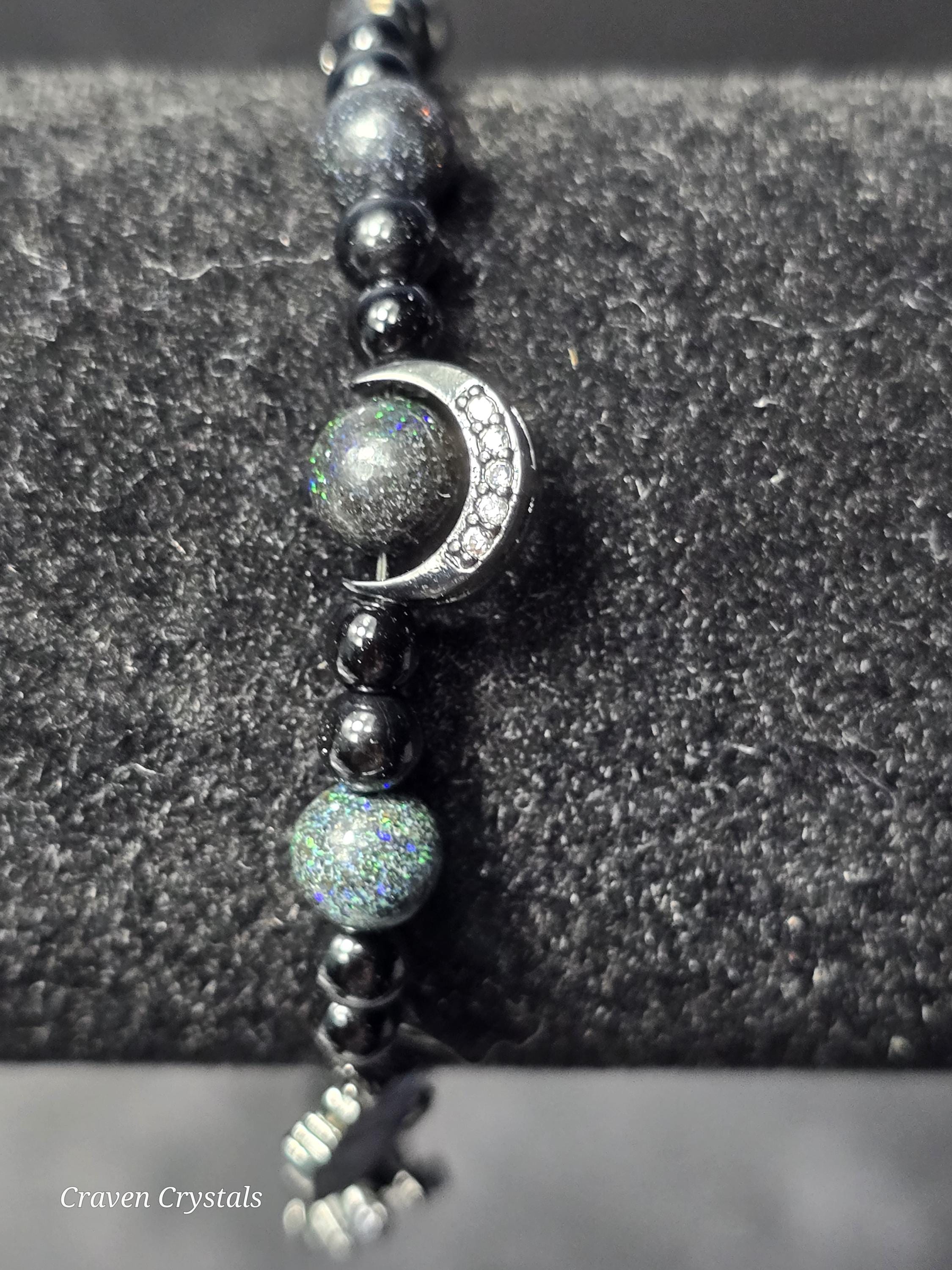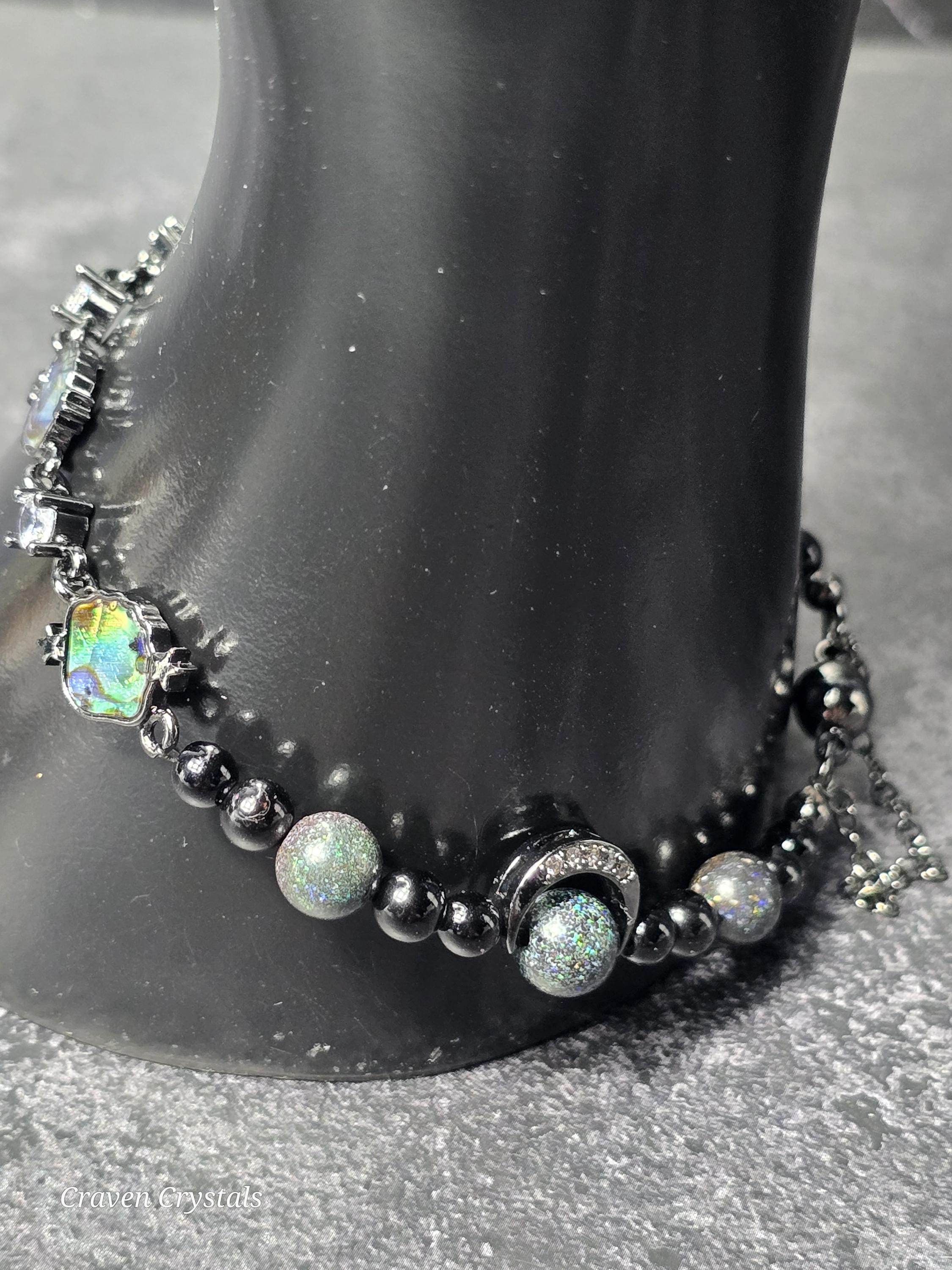 Dark, dazzling, and endlessly mysterious, “Midnight Galaxy” captures the breathtaking beauty of a starlit sky. Shimmering black Andamooka opal beads sparkle with cosmic flashes of color, like distant stars scattered across deep space. These are paired with protective black tourmaline and sleek black hematite, creating a powerful trio that balances beauty with grounding strength. At the center, a luminous abalone shell connector framed with sparkling zircon glows with iridescent blues, greens, and purples—resembling a tiny galaxy swirling with celestial light. Bold black accents, including two crescent moon details, deepen the cosmic theme while adding a touch of gothic elegance. The bracelet is finished with a magnetic closure for secure, effortless wear.🌙✨