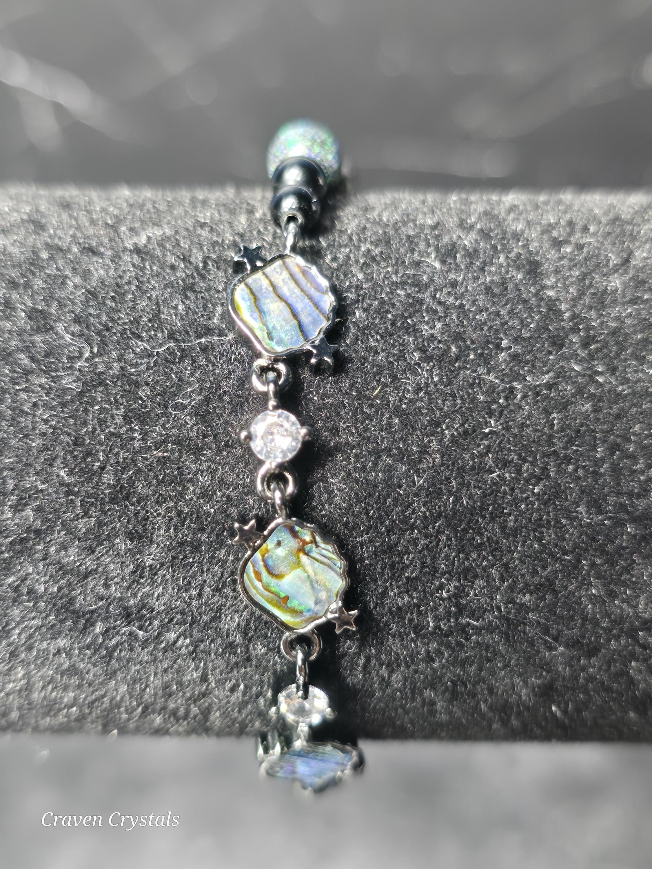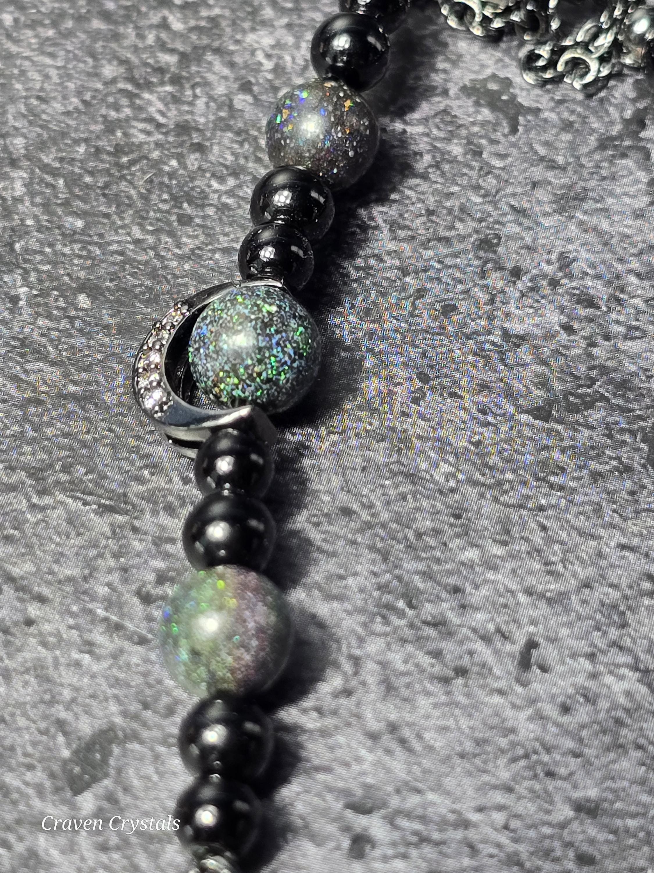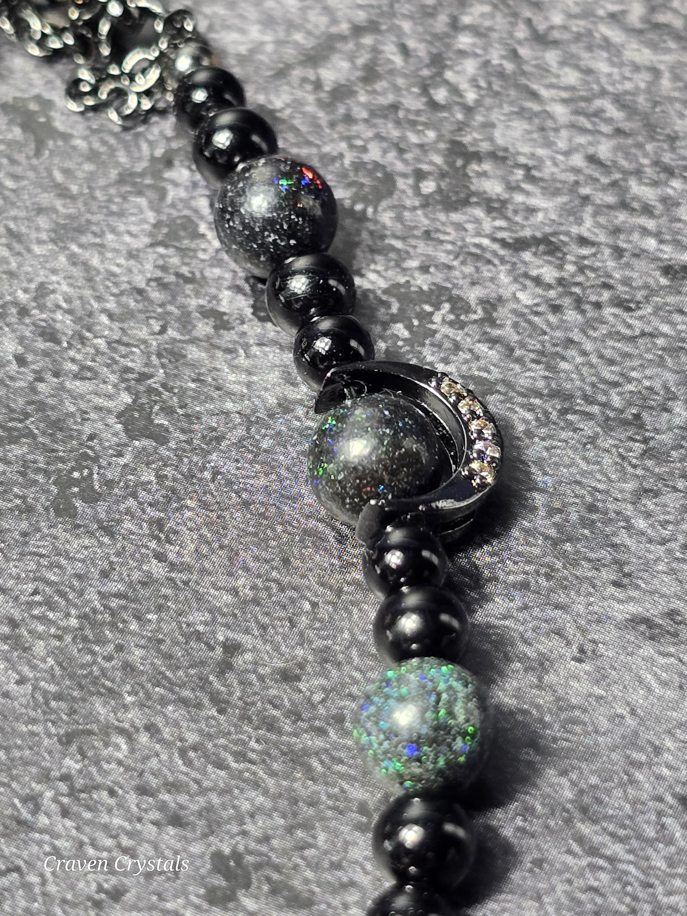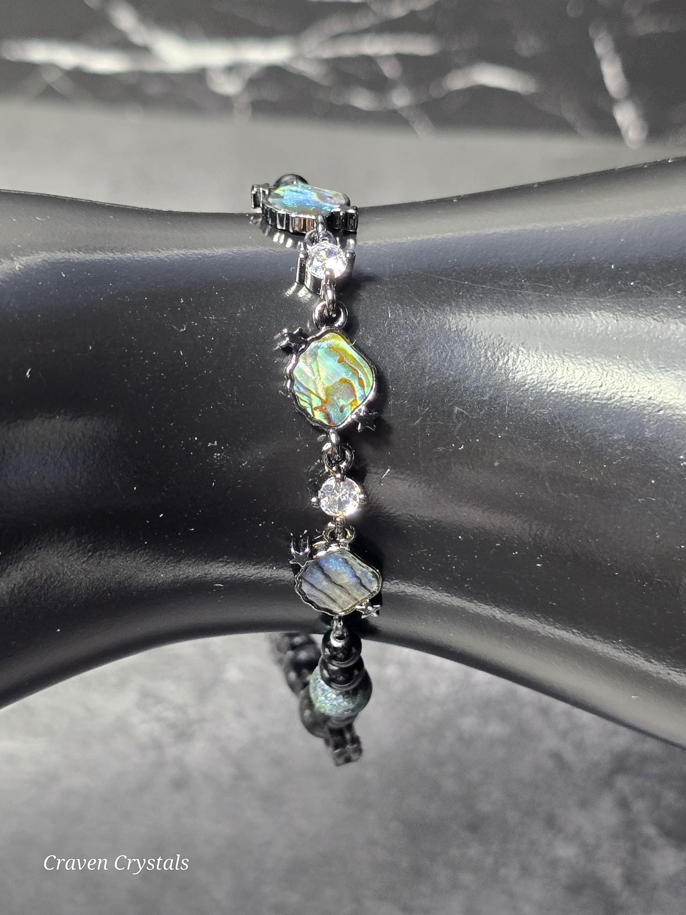 Dark, dazzling, and endlessly mysterious, “Midnight Galaxy” captures the breathtaking beauty of a starlit sky. Shimmering black Andamooka opal beads sparkle with cosmic flashes of color, like distant stars scattered across deep space. These are paired with protective black tourmaline and sleek black hematite, creating a powerful trio that balances beauty with grounding strength. At the center, a luminous abalone shell connector framed with sparkling zircon glows with iridescent blues, greens, and purples—resembling a tiny galaxy swirling with celestial light. Bold black accents, including two crescent moon details, deepen the cosmic theme while adding a touch of gothic elegance. The bracelet is finished with a magnetic closure for secure, effortless wear.🌙✨