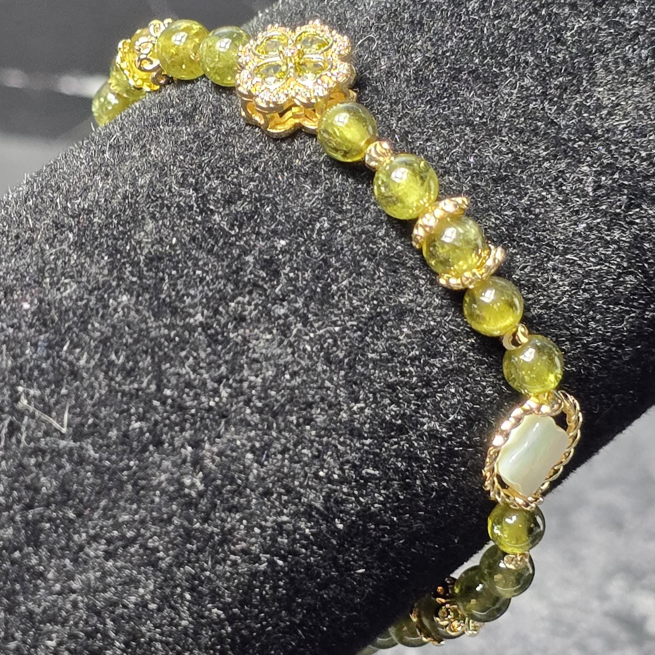 Lush, vibrant, and rich with symbolism, “Clover Countess” is a bracelet that celebrates prosperity, renewal, and a touch of lucky charm. Brilliant high-quality green Tsavorite Garnet beads create a vivid, jewel-toned foundation, prized for their exceptional sparkle and fresh emerald-like color. Known for inspiring vitality and abundance, tsavorite brings an energy that feels both luxurious and uplifting. At the heart of the design rests a striking green clover centerpiece, a timeless symbol of luck and good fortune. Surrounding it are elegant gold accents, including a unique rotating bead frame featuring a delicate shell clover that spins gently with movement—adding a playful, interactive detail that makes the bracelet truly special. A charming clover dangle adds the finishing touch, while a magnetic clasp ensures easy, comfortable wear.🍀