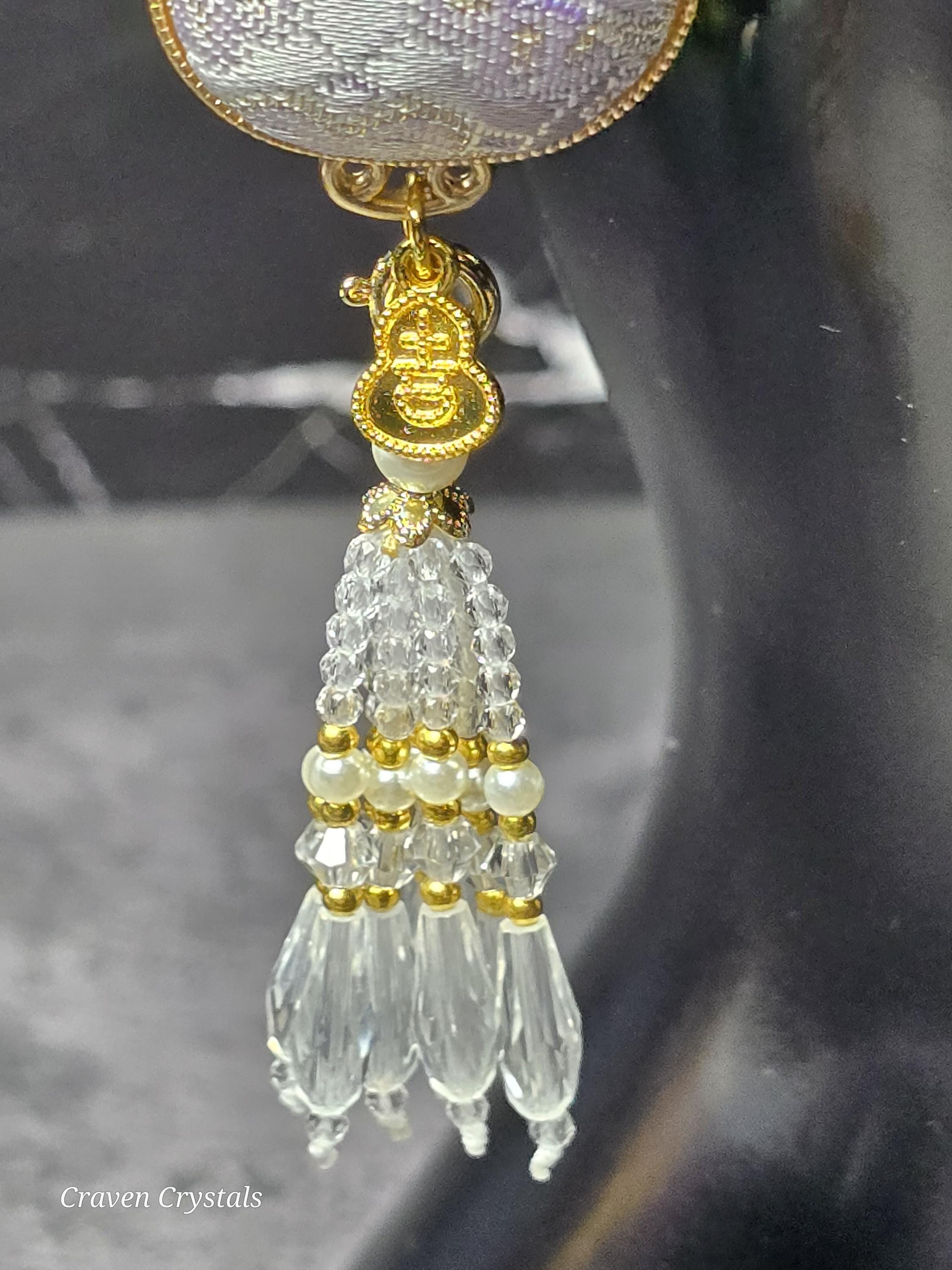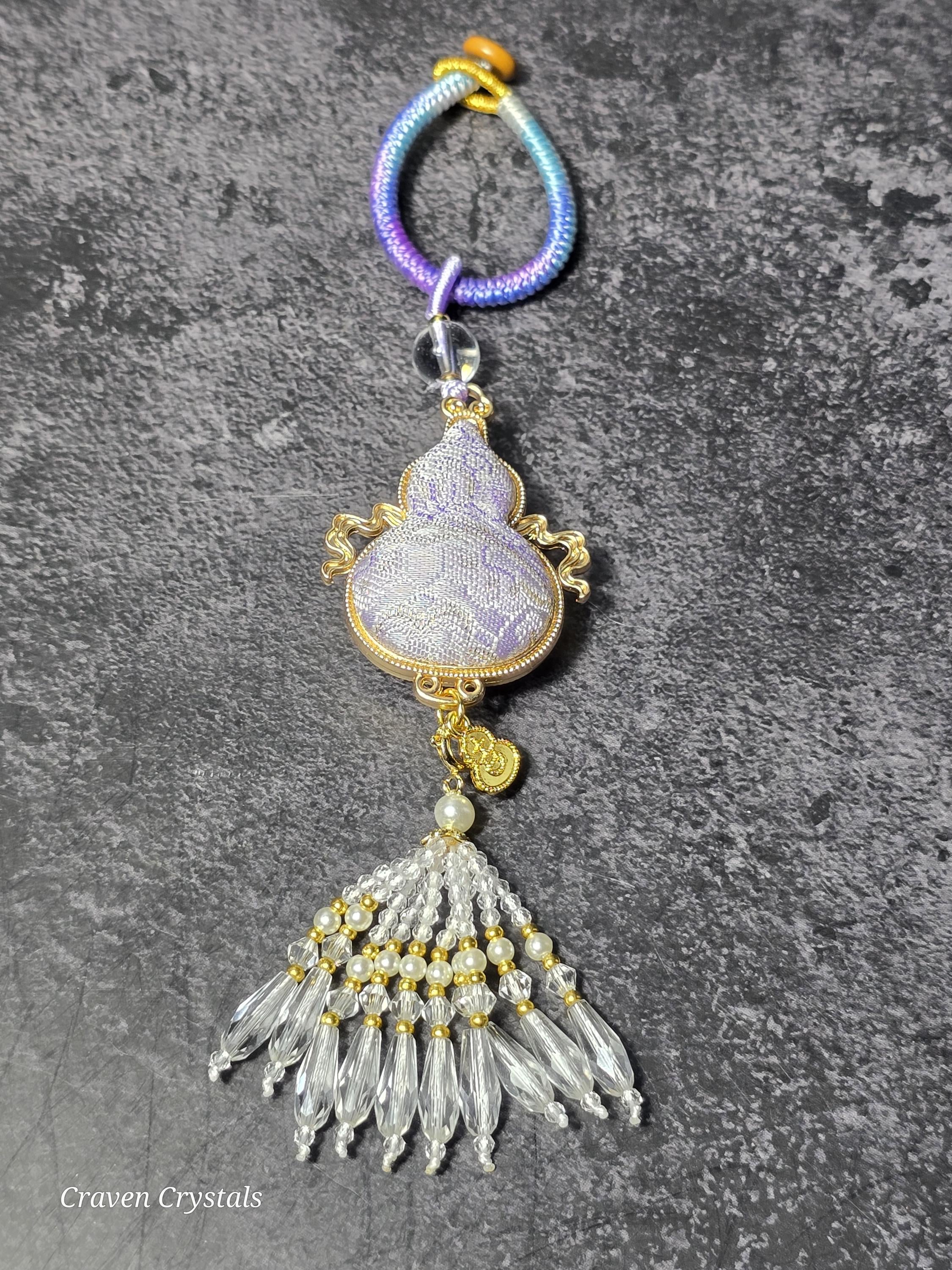 Lavender Hulu Song Brocade hanging charms, perfect as a key chain, car charm or adorning a special purse or tote. The Brocade Hulu is on an openable loop with a metal Hulu charm and finished with a glass bead tassel with faux pearls
