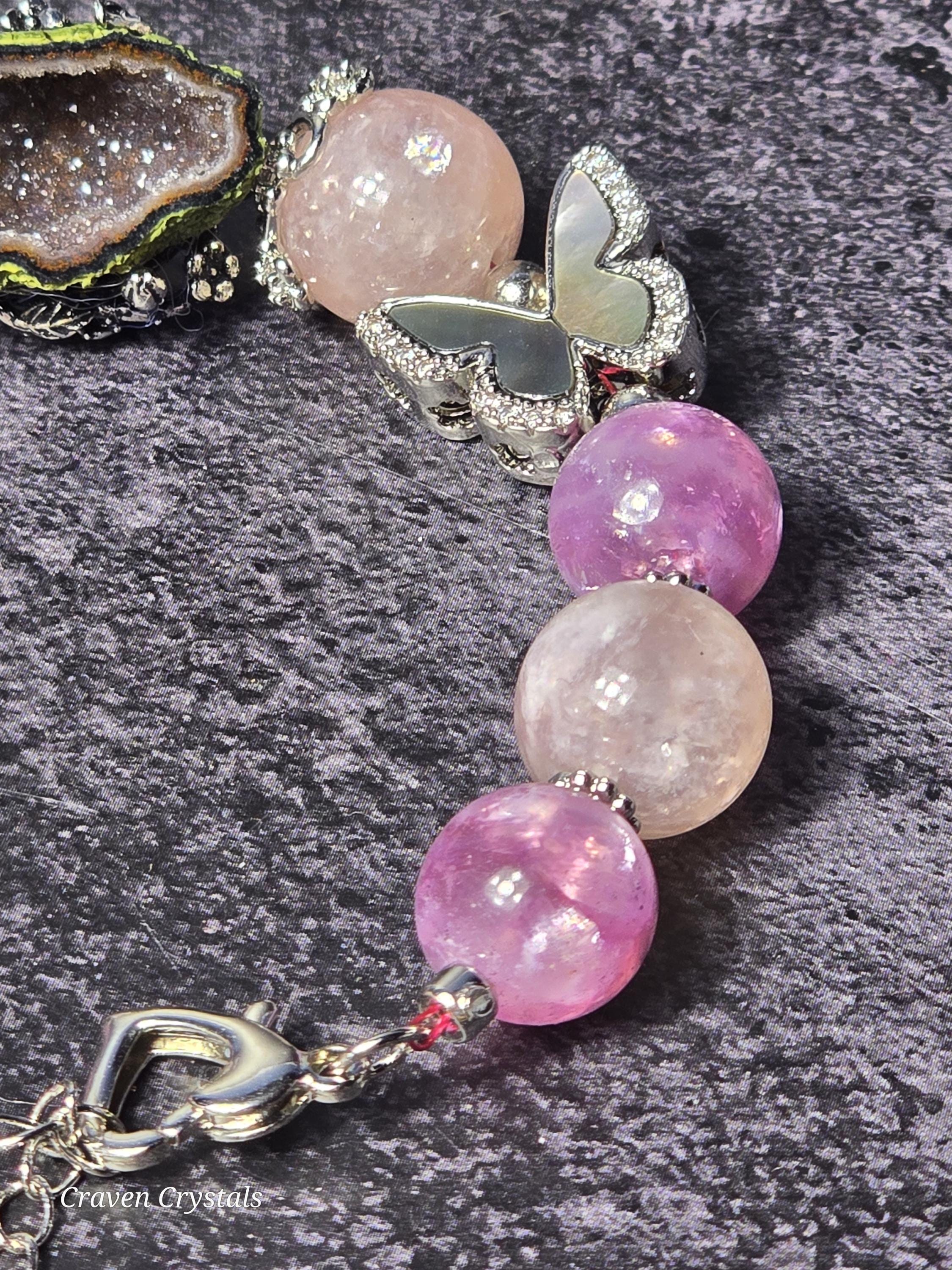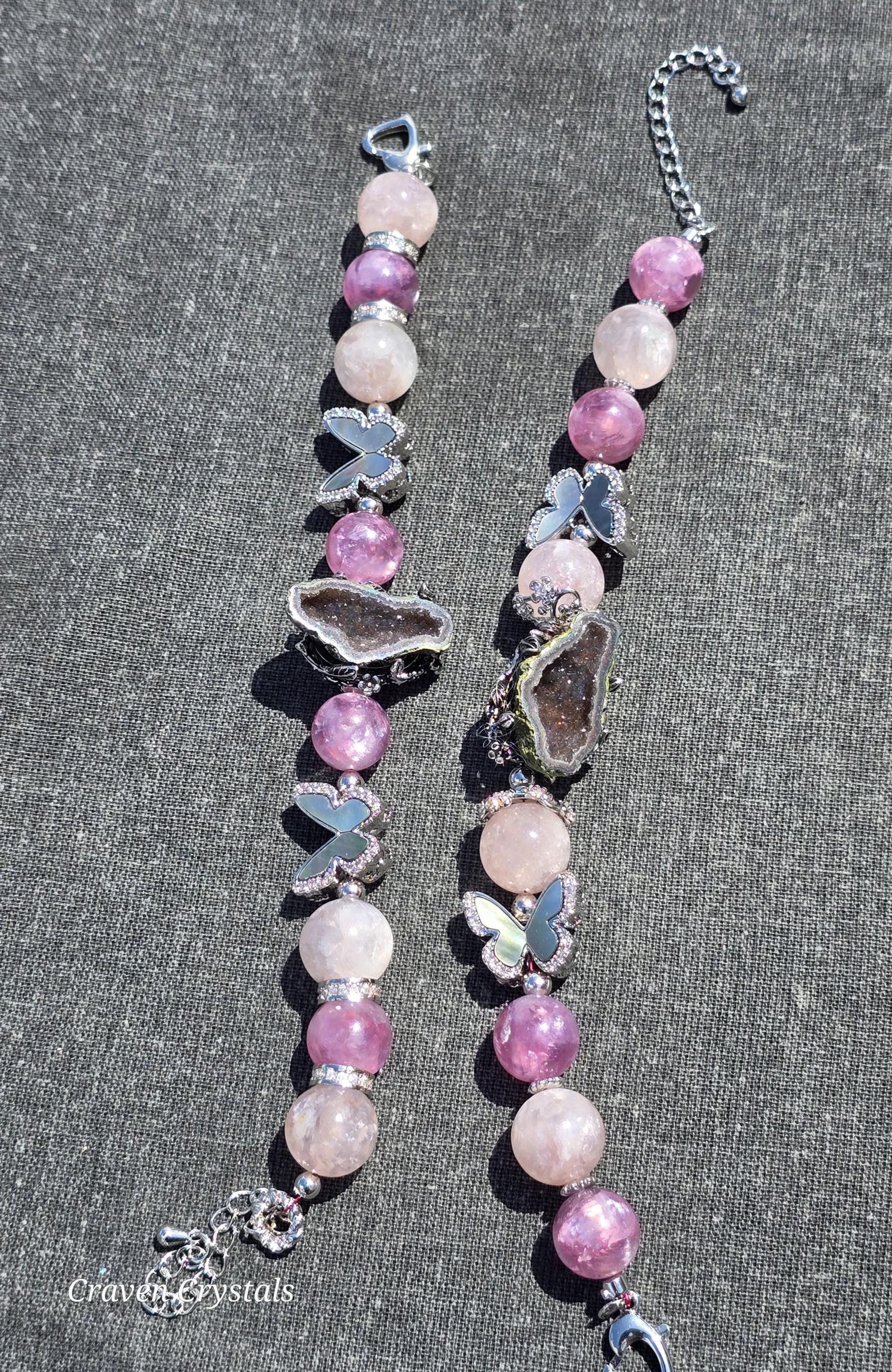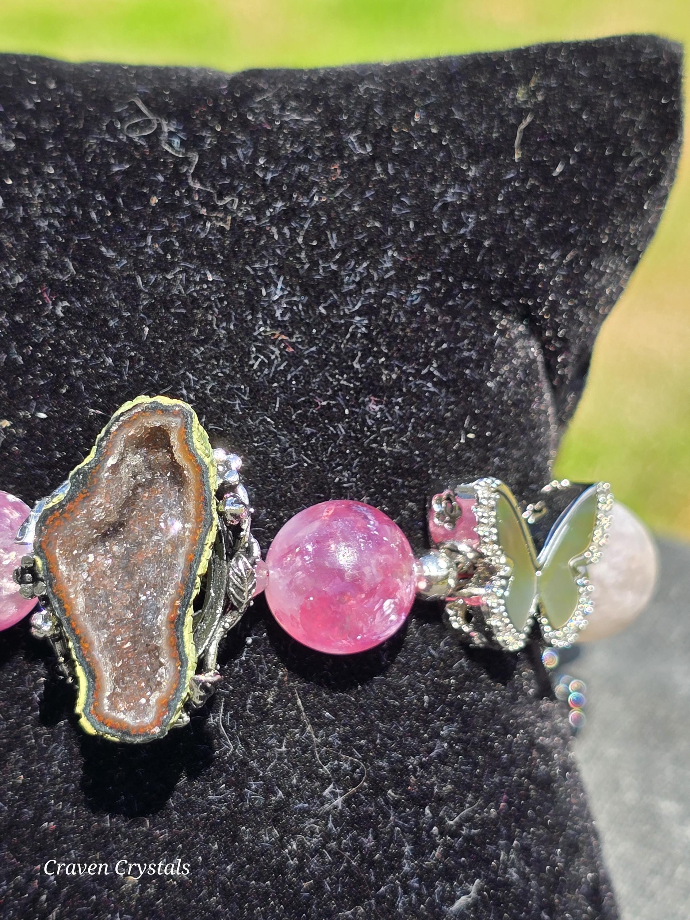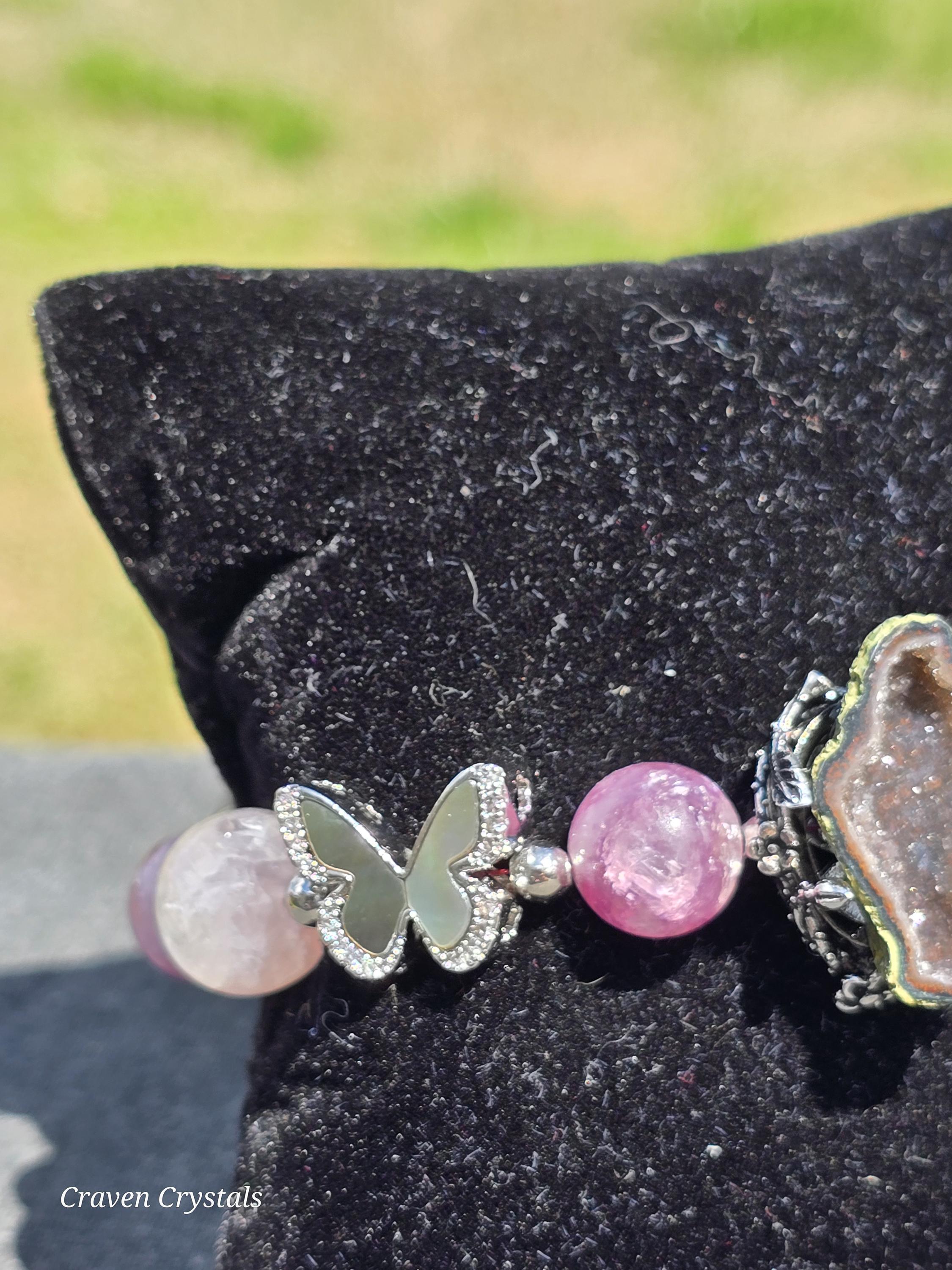 Soft, dreamy, and quietly enchanting, “Blush & Bloom” is a bracelet that feels like a gentle moment of transformation captured in jewelry. Glowing pink mica beads shimmer with delicate, natural sparkle, radiating warmth, self-love, and a calming feminine energy that feels both comforting and uplifting. Fluttering throughout the design are elegant black shell butterfly accents, their iridescent surfaces catching the light with subtle flashes—symbolizing transformation, growth, and the beauty of becoming. At the center rests a captivating drusy quartz focal, its sparkling crystal surface resembling a tiny hidden world of light, adding texture, brilliance, and a touch of magic. Finished with sleek silver-toned details and an adjustable chain for the perfect fit, this piece balances softness with contrast in the most beautiful way.🦋