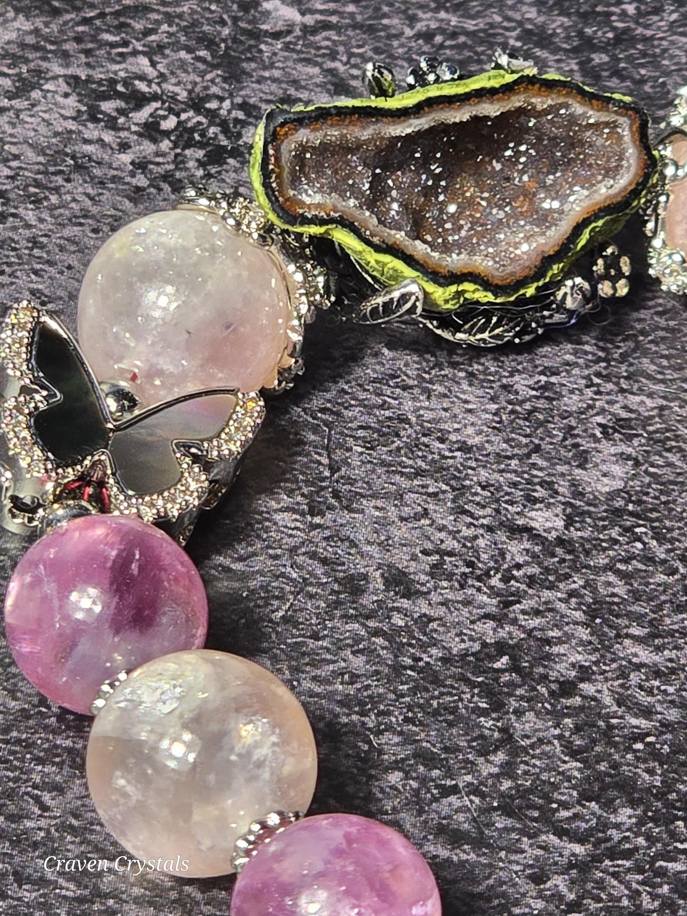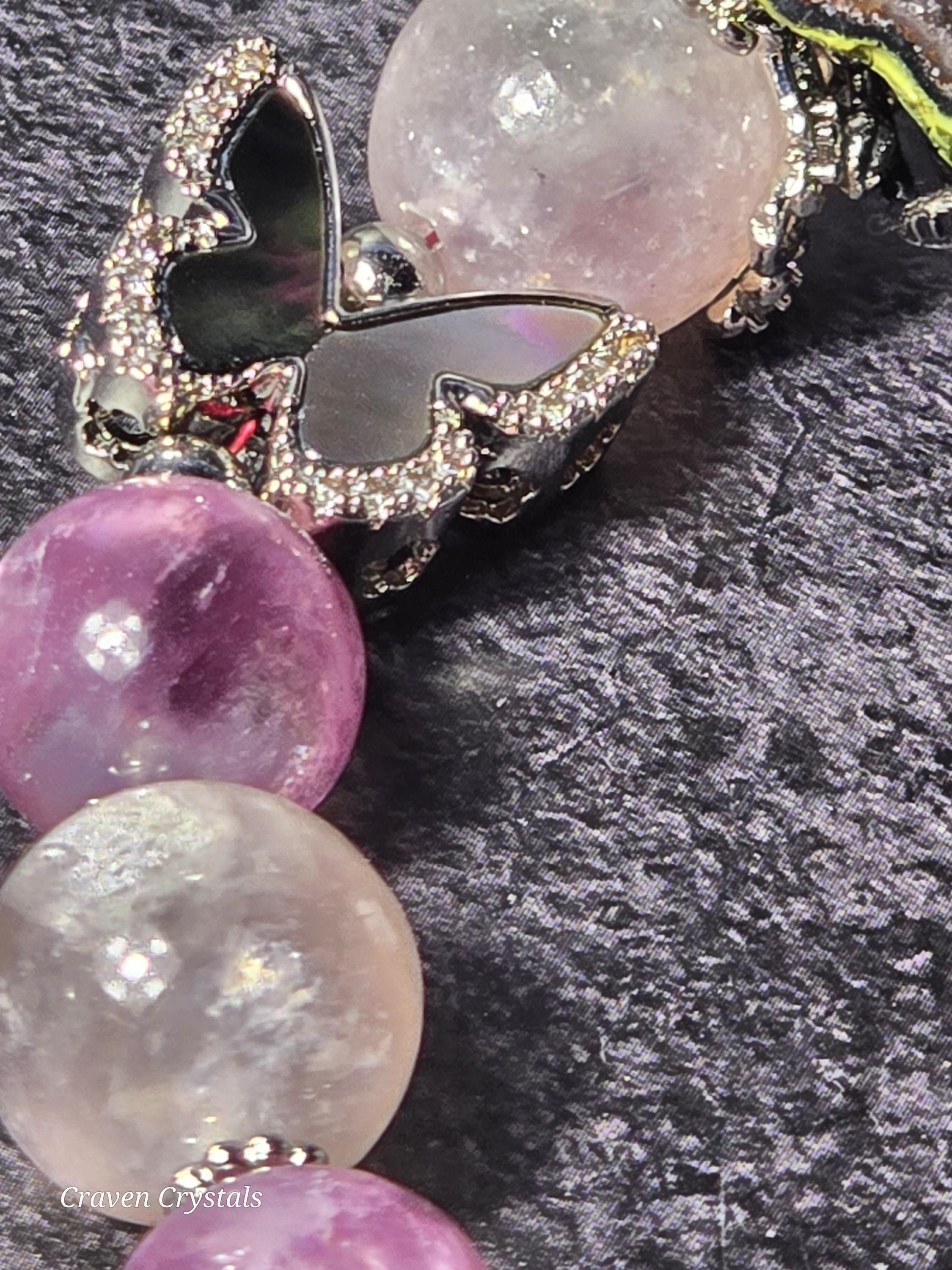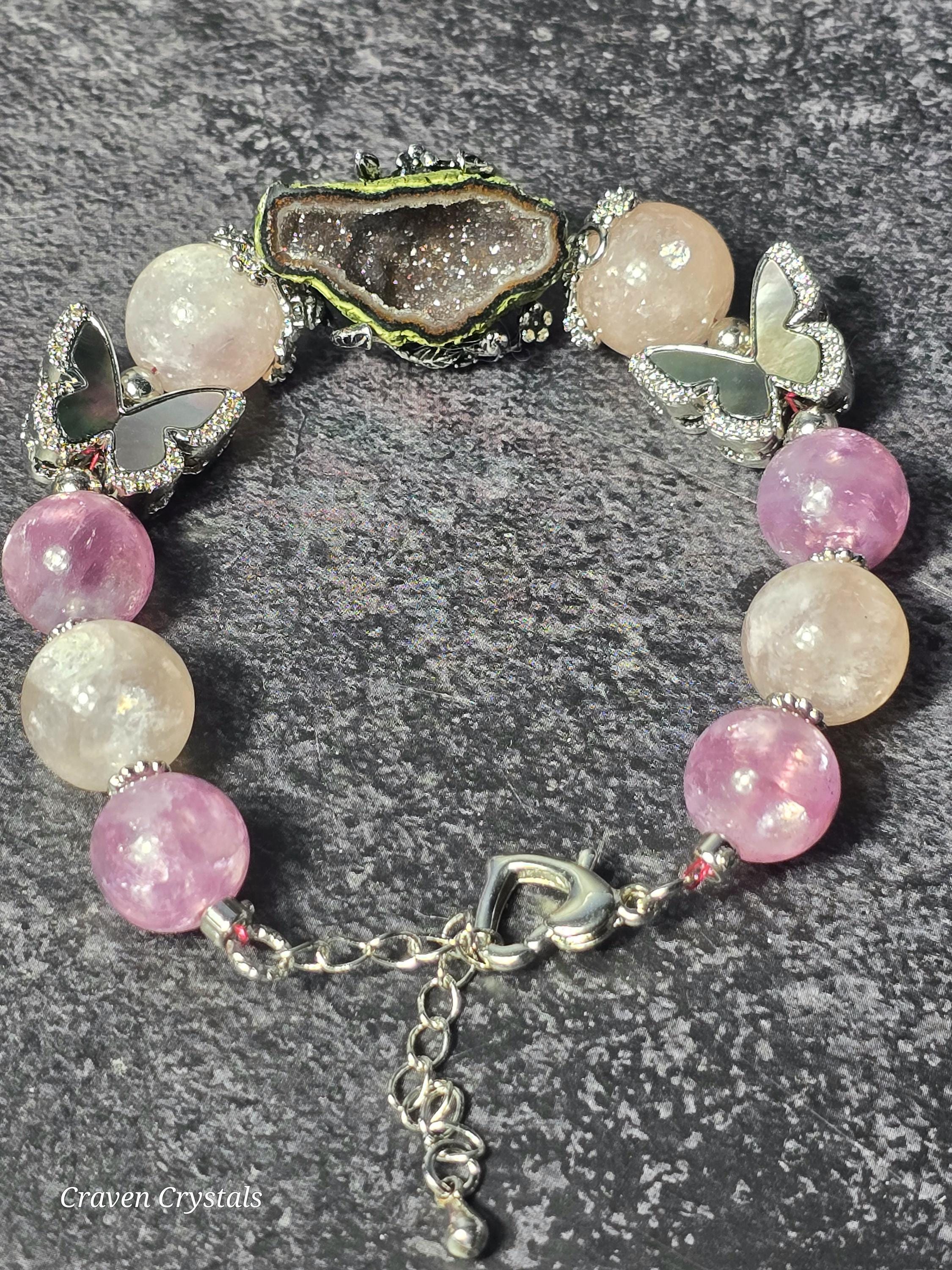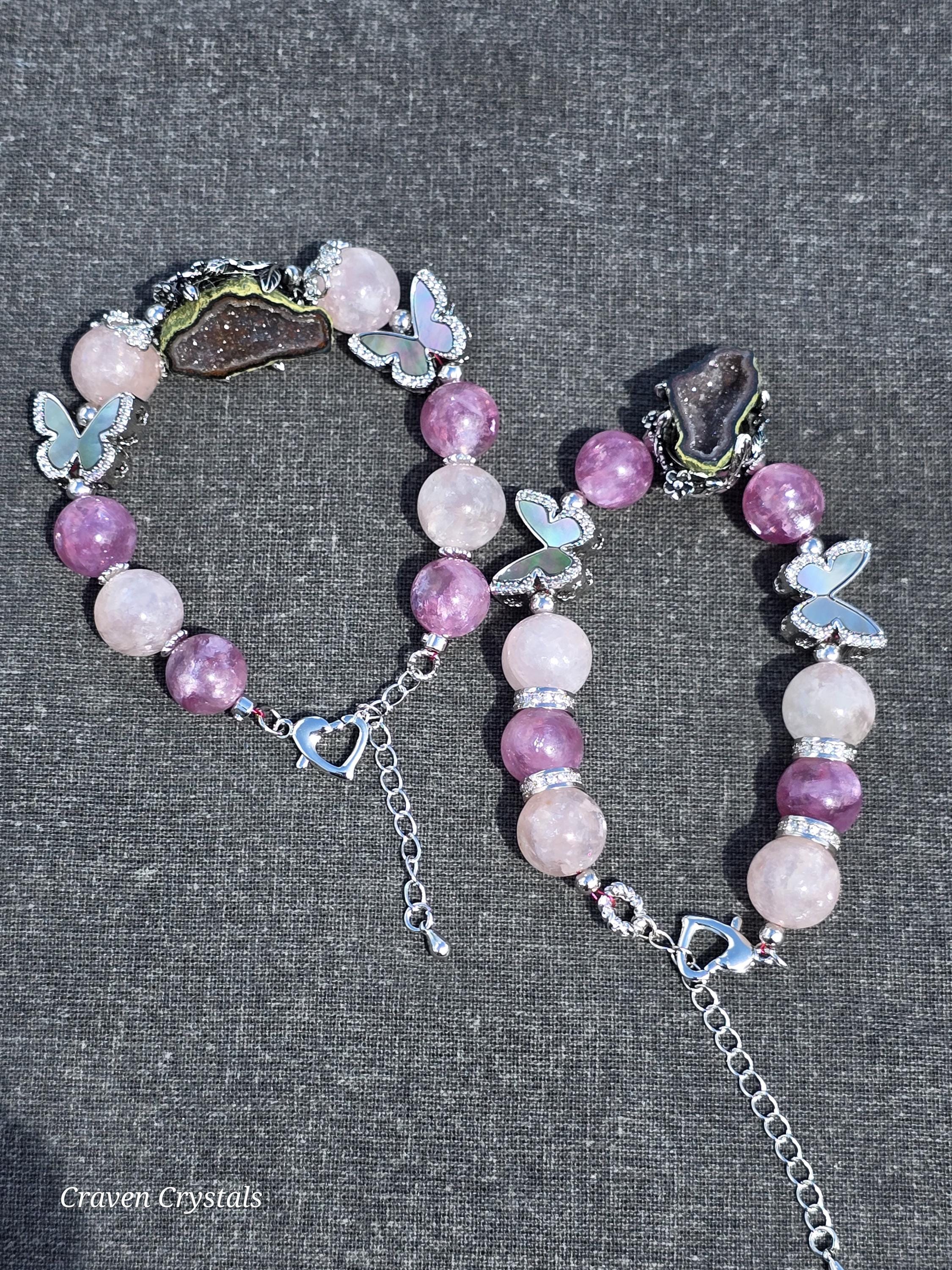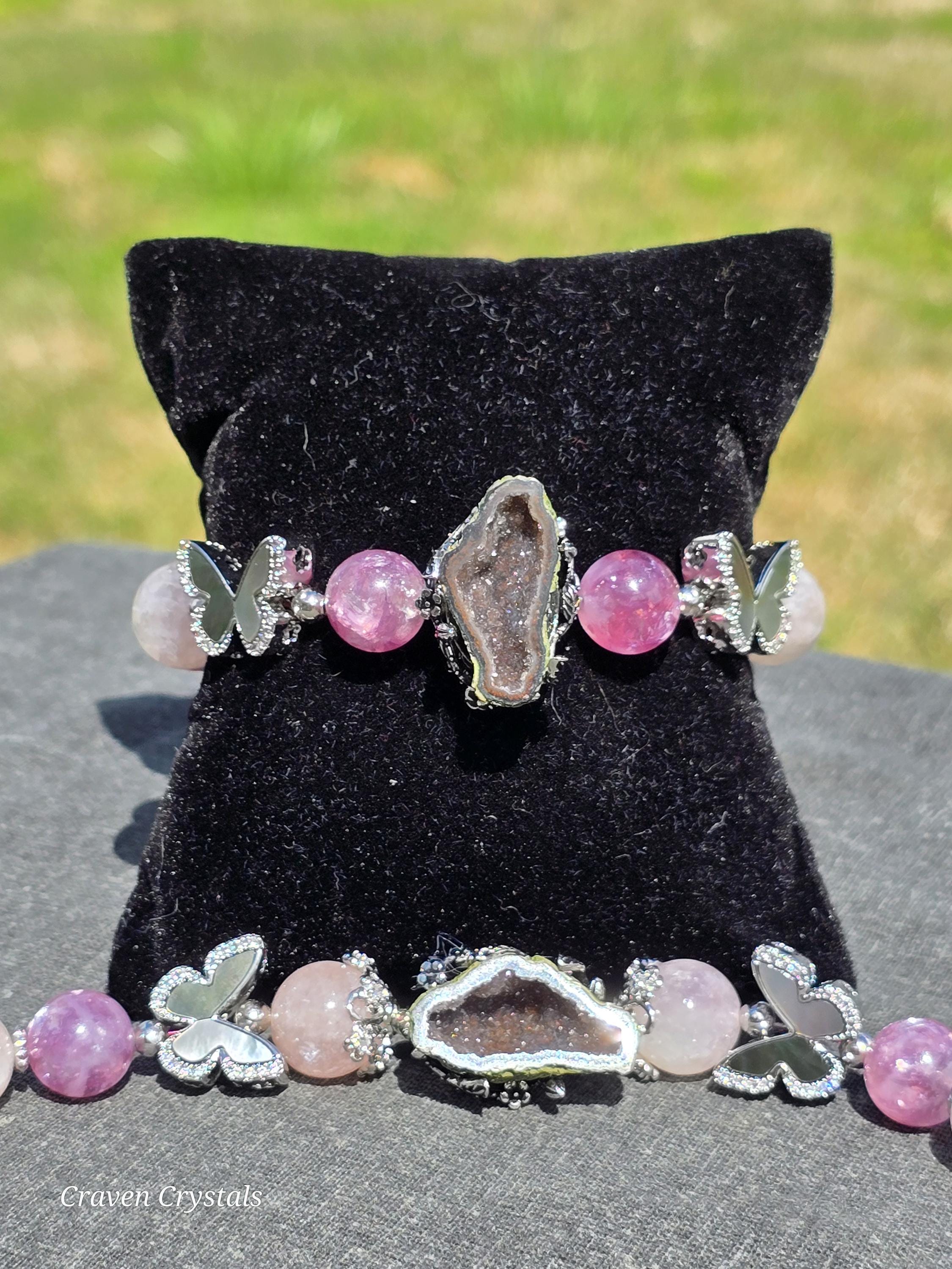 Soft, dreamy, and quietly enchanting, “Blush & Bloom” is a bracelet that feels like a gentle moment of transformation captured in jewelry. Glowing pink mica beads shimmer with delicate, natural sparkle, radiating warmth, self-love, and a calming feminine energy that feels both comforting and uplifting. Fluttering throughout the design are elegant black shell butterfly accents, their iridescent surfaces catching the light with subtle flashes—symbolizing transformation, growth, and the beauty of becoming. At the center rests a captivating drusy quartz focal, its sparkling crystal surface resembling a tiny hidden world of light, adding texture, brilliance, and a touch of magic. Finished with sleek silver-toned details and an adjustable chain for the perfect fit, this piece balances softness with contrast in the most beautiful way.🦋