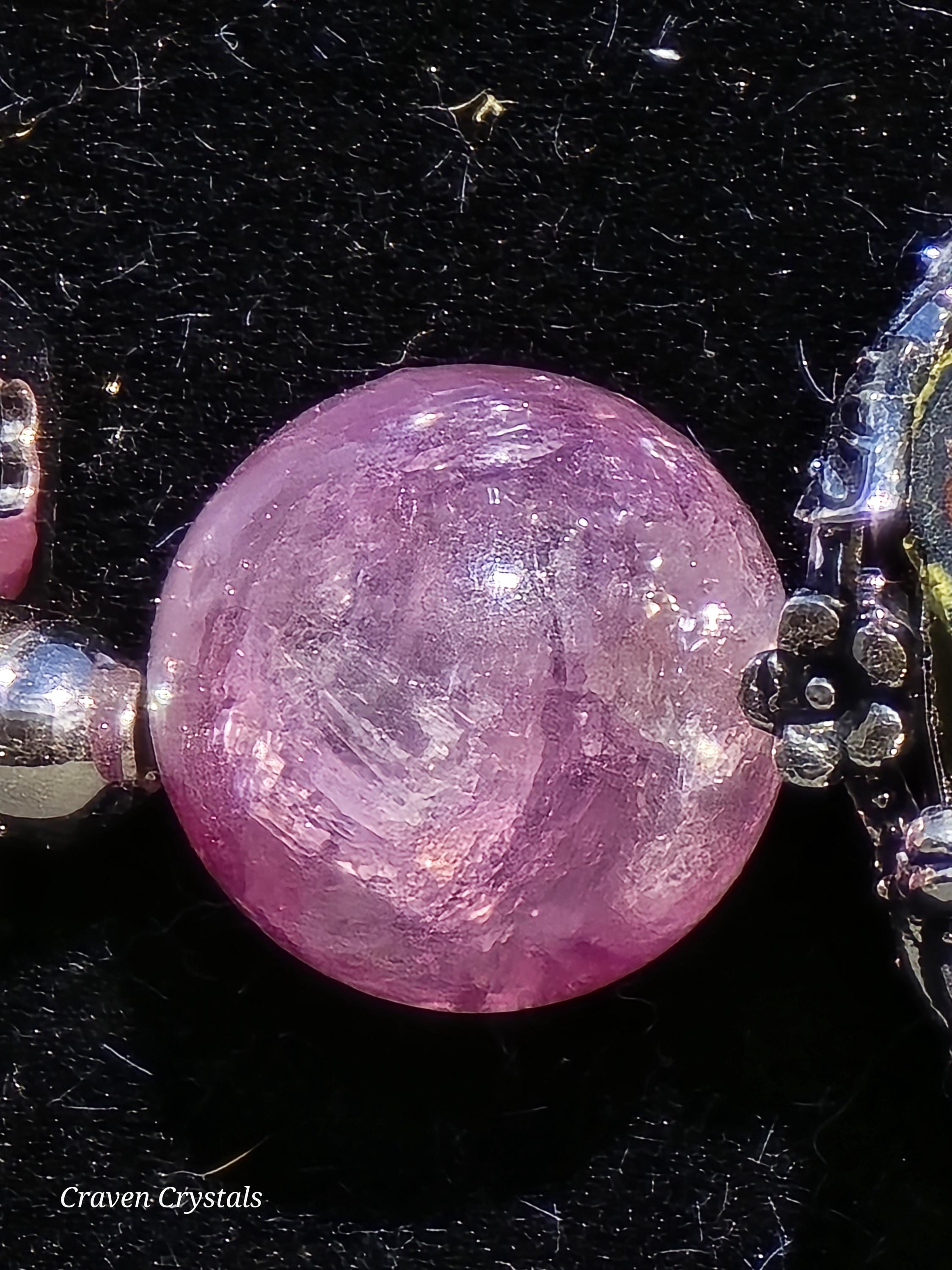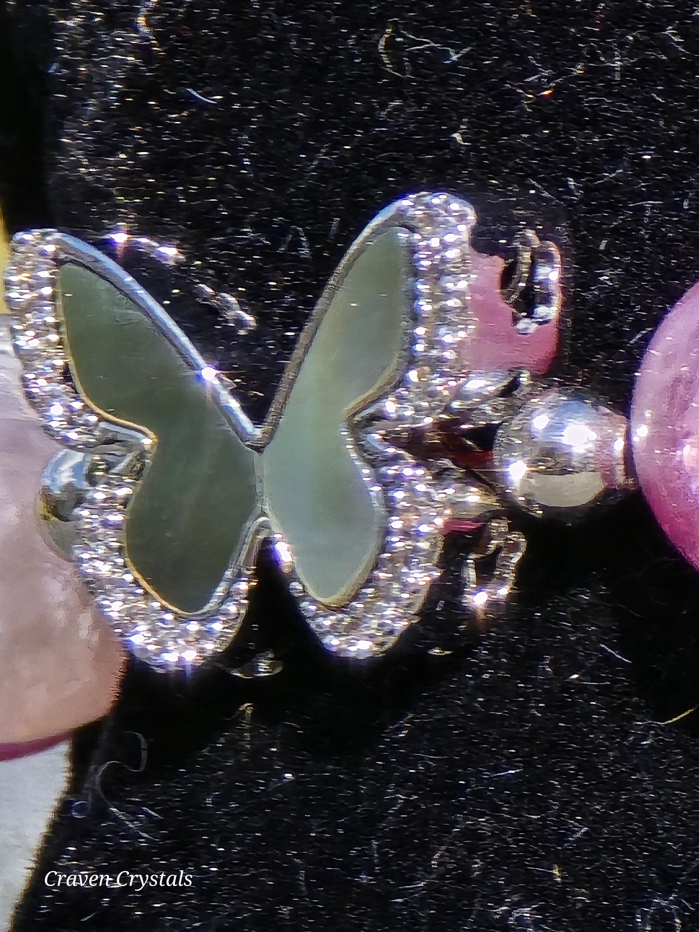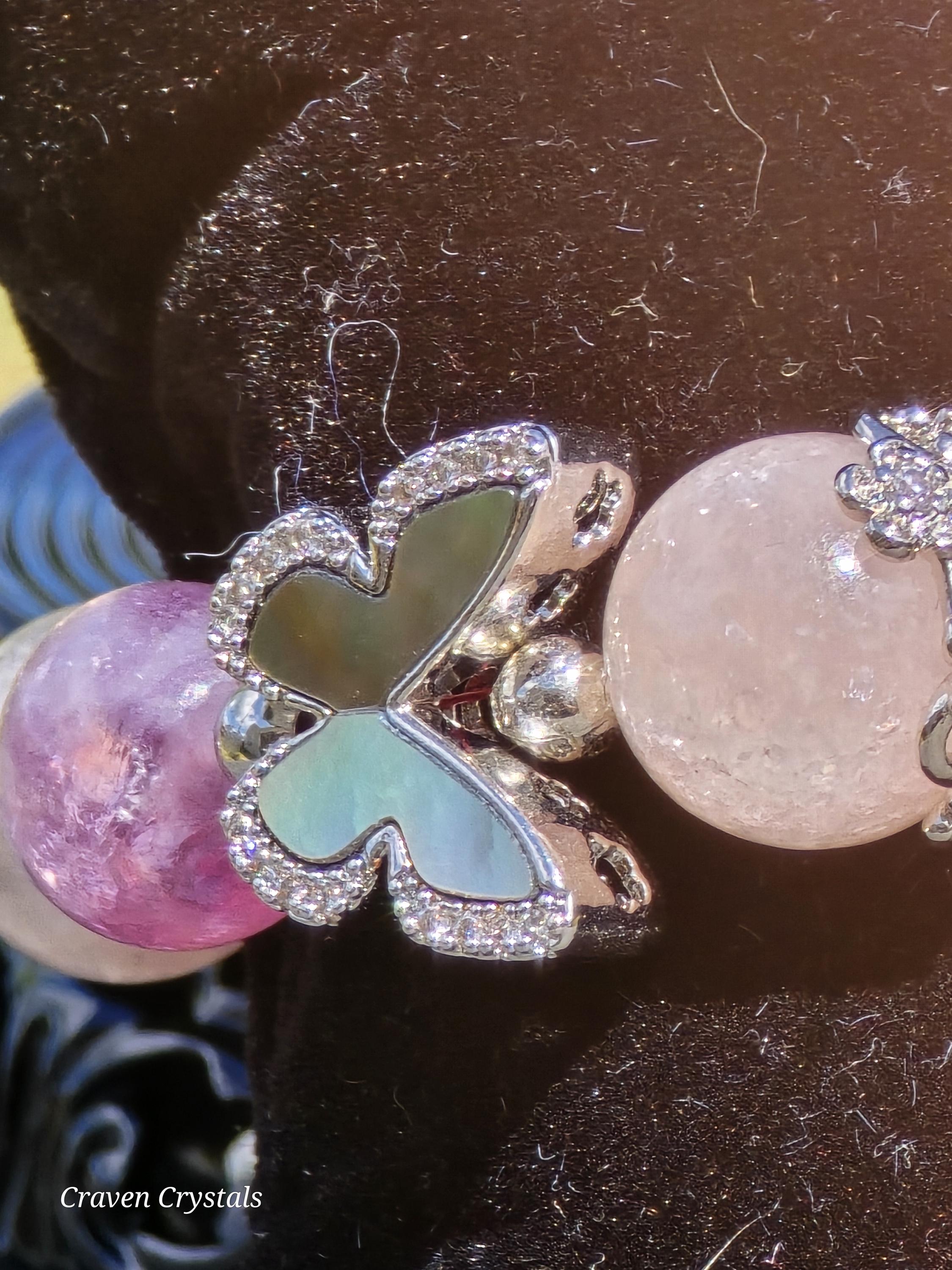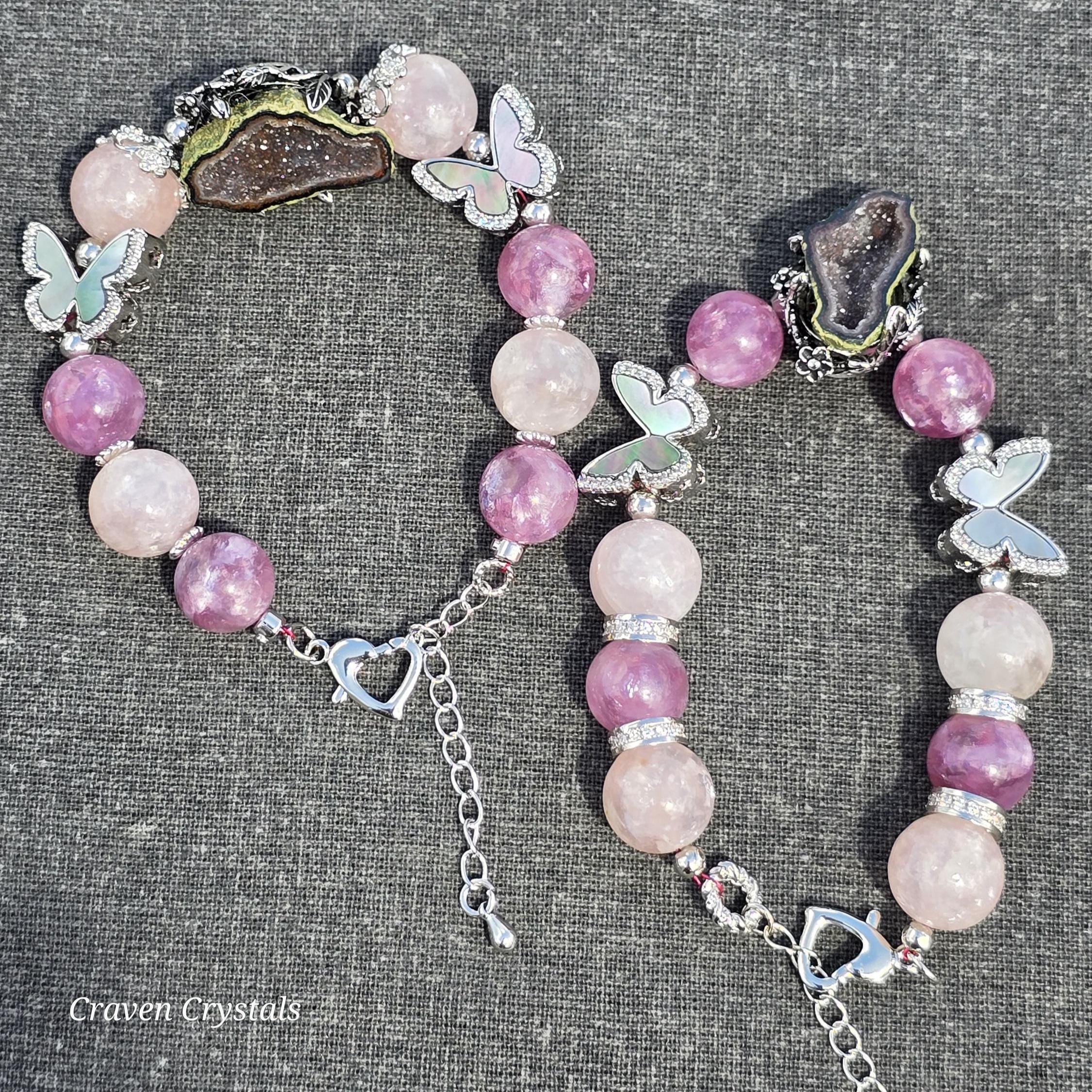 Soft, dreamy, and quietly enchanting, “Blush & Bloom” is a bracelet that feels like a gentle moment of transformation captured in jewelry. Glowing pink mica beads shimmer with delicate, natural sparkle, radiating warmth, self-love, and a calming feminine energy that feels both comforting and uplifting. Fluttering throughout the design are elegant black shell butterfly accents, their iridescent surfaces catching the light with subtle flashes—symbolizing transformation, growth, and the beauty of becoming. At the center rests a captivating drusy quartz focal, its sparkling crystal surface resembling a tiny hidden world of light, adding texture, brilliance, and a touch of magic. Finished with sleek silver-toned details and an adjustable chain for the perfect fit, this piece balances softness with contrast in the most beautiful way.🦋