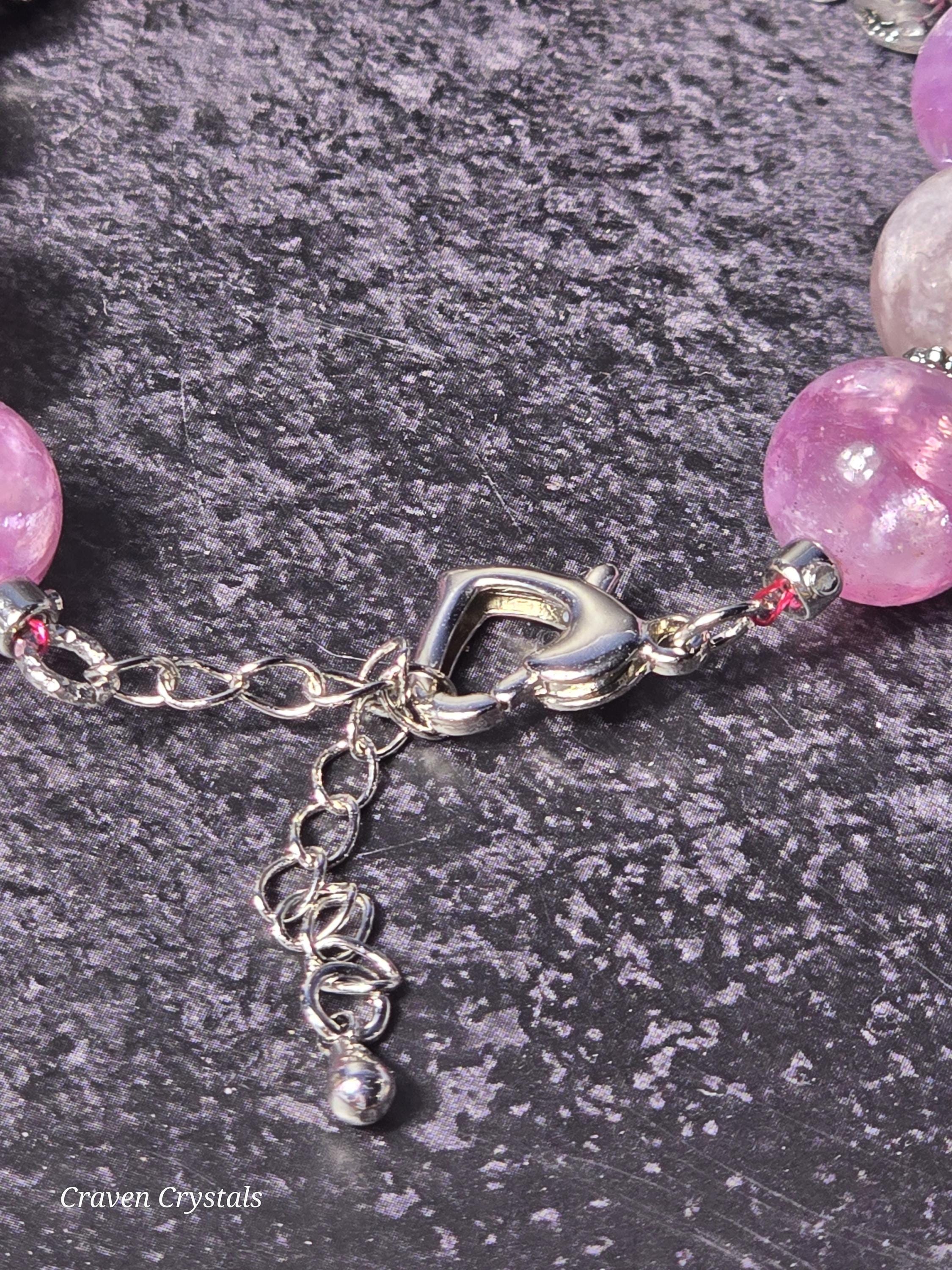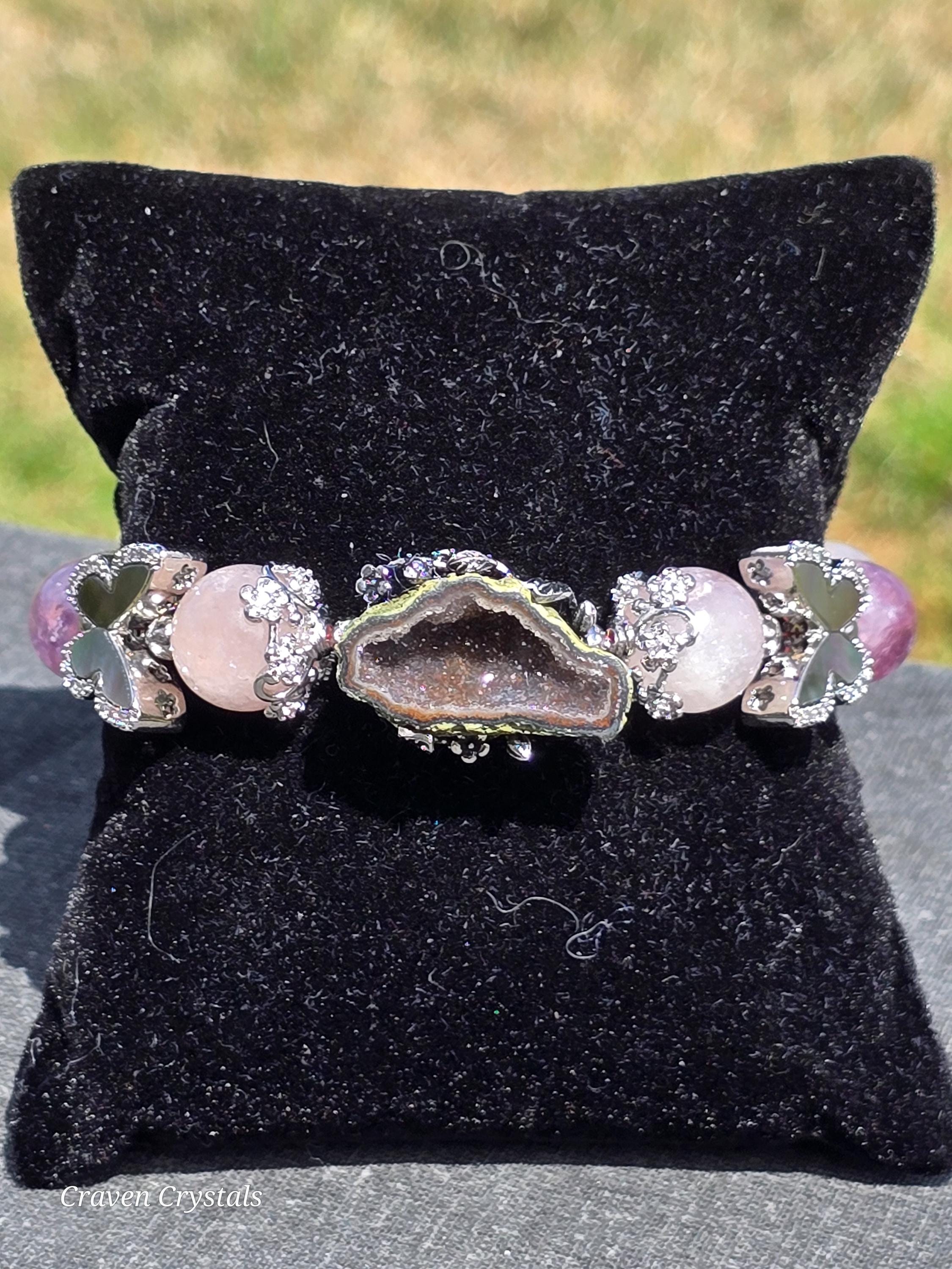 Each Craven Crystals bracelet is thoughtfully handcrafted using natural stones, elastic cord, and carefully selected metals. To preserve the beauty and integrity of your piece, handle it with care and avoid excessive stretching. Bracelets should be rolled on and off the wrist rather than pulled, especially those made with elastic. It is recommended to remove your bracelet before sleeping, bathing, swimming, exercising, or performing household tasks, as moisture, chemicals, and impact can weaken elastic, dull metals, and damage stones. Sterling silver and mixed metal components may naturally develop a soft patina or tarnish over time. This is a normal process and can be minimized by keeping your jewelry dry and storing it in a soft pouch or jewelry box when not in use. A gentle wipe with a soft, dry cloth after wearing helps remove natural oils and maintain shine. Avoid submerging bracelets in water or using chemical or ultrasonic cleaners. For sterling silver accents only, a silver polishing cloth may be used. Delicate beads, glass, shell, charms, and detailed focal pieces should be protected from hard knocks or pressure, as natural and specialty materials can chip or crack if dropped. Crystals, stones, and shells are natural materials and may display unique variations in color, texture, or pattern. These characteristics are part of what makes each Craven Crystals piece one of a kind. With mindful care, your bracelet will continue to bring beauty, meaning, and enjoyment for years to come.