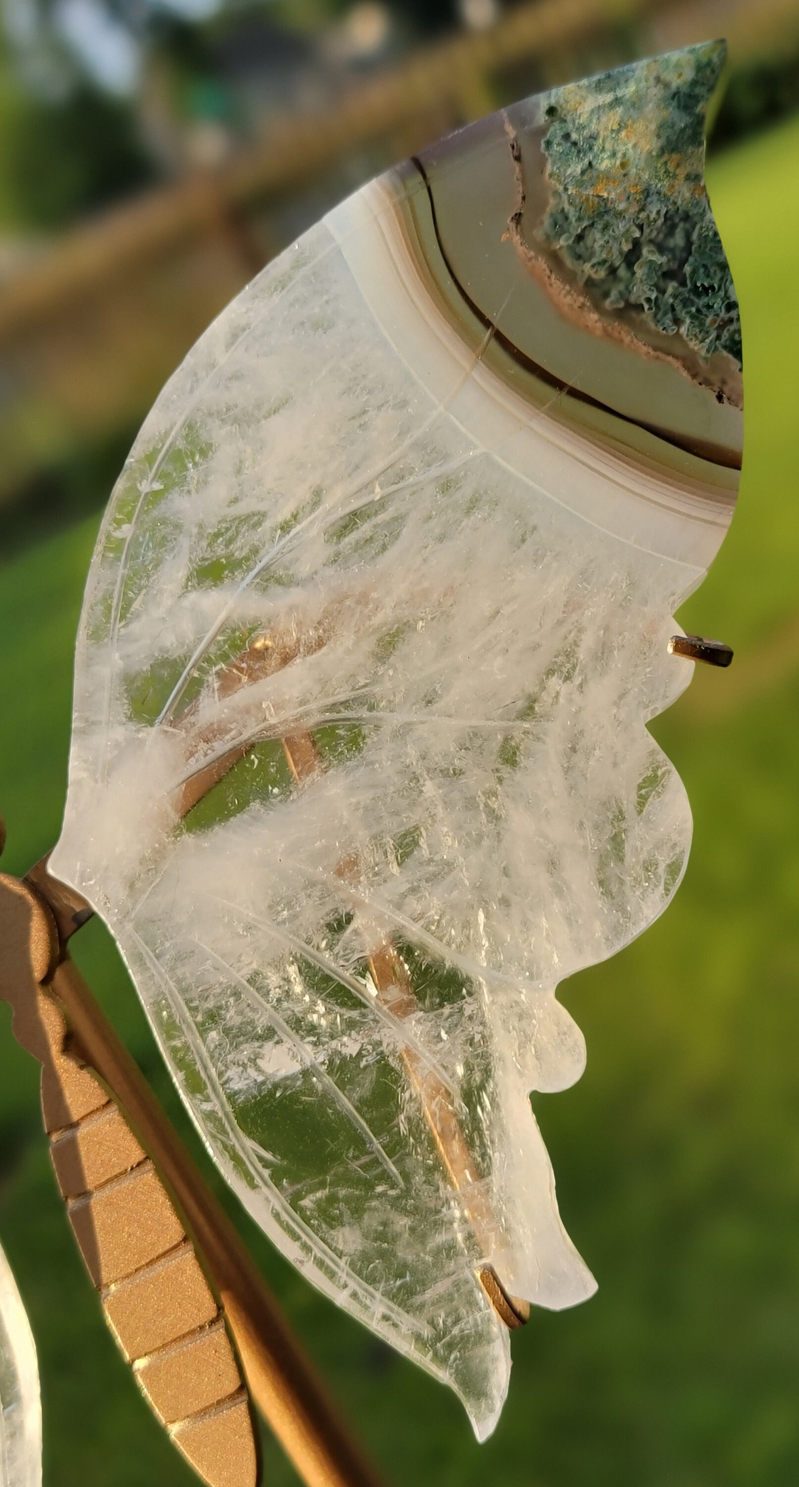 Clear Quartz Crystal Butterfly Wings with rainbows, golden bands of Agate and symmetrical Moss agate tips