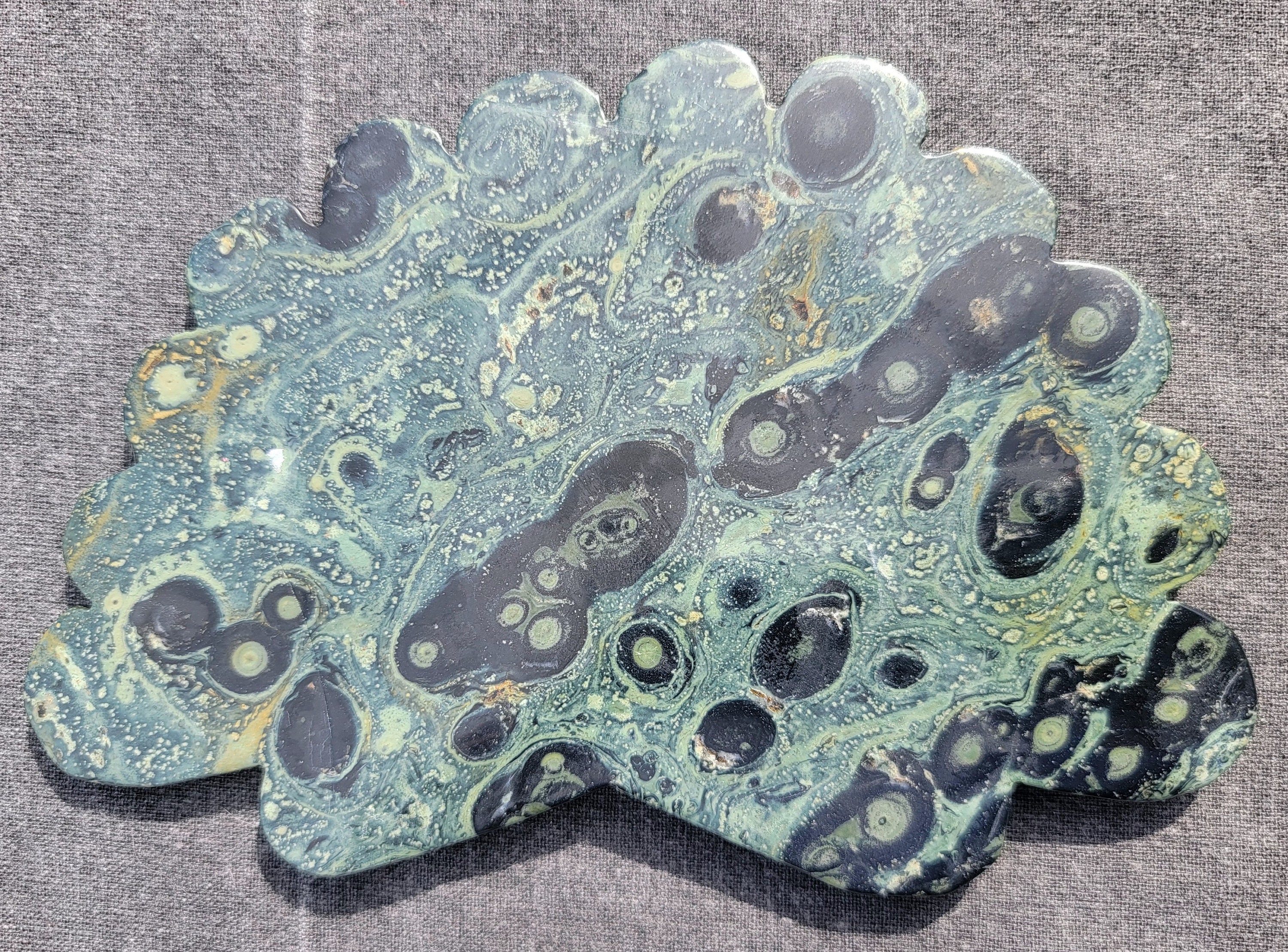 Kambaba Jasper, also known as Crocodile Jasper or Green Stromatolite Jasper Crystal Peacock Wings with a deep green background and darker green orbicular spots